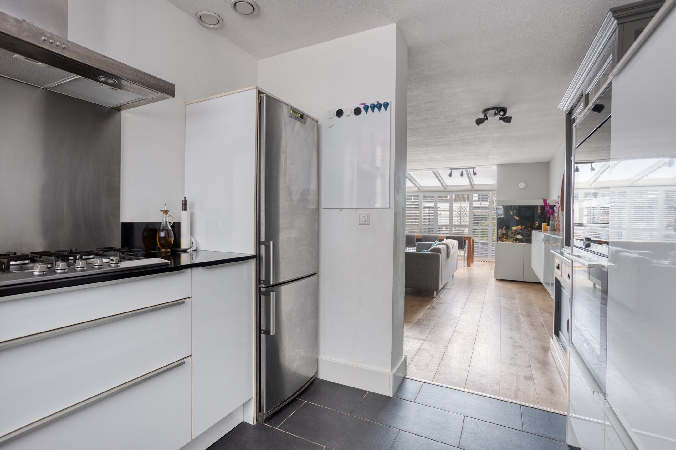 Aan de achterzijde zorgt de glazen overkapping/serre voor veel daglicht en een fijne overgang naar de tuin, waardoor een prettige extra leefruimte ontstaat. De keuken staat in open verbinding met de woonkamer en is modern uitgevoerd met hoogwaardige inbouwapparatuur en een fijne indeling.