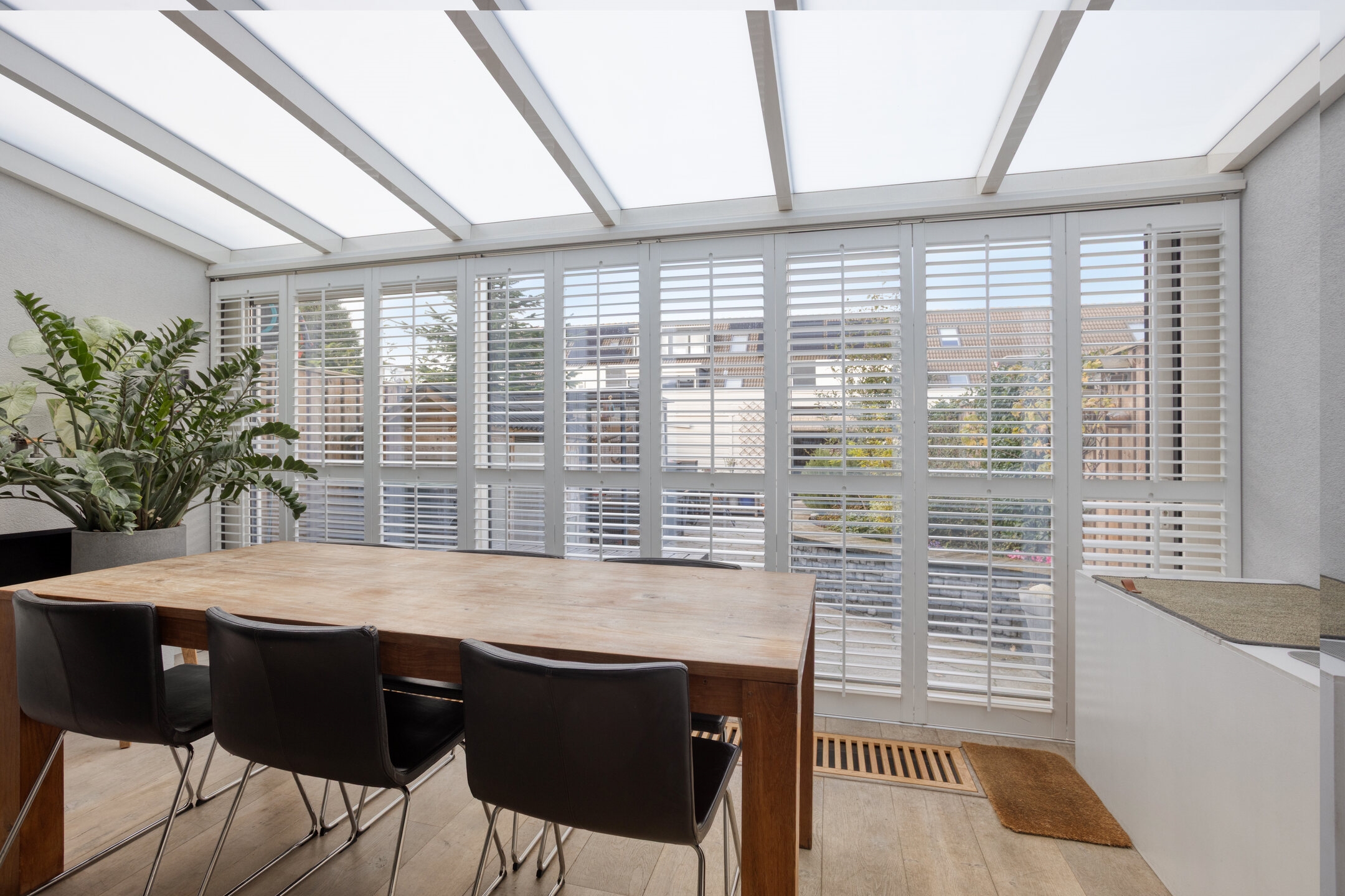 At the rear, the glass canopy/conservatory provides additional daylight and creates a pleasant transition to the garden, offering extra living space. The open-plan kitchen is directly connected to the living room and features a modern design with high-quality built-in appliances and a practical layout.