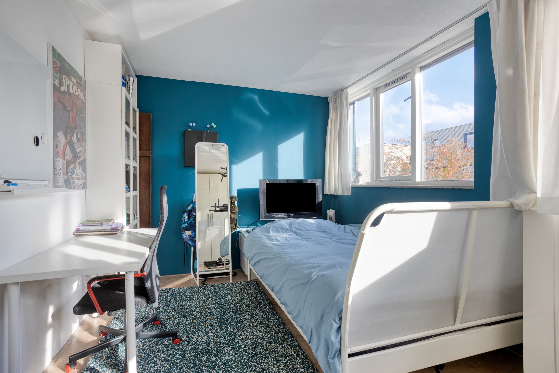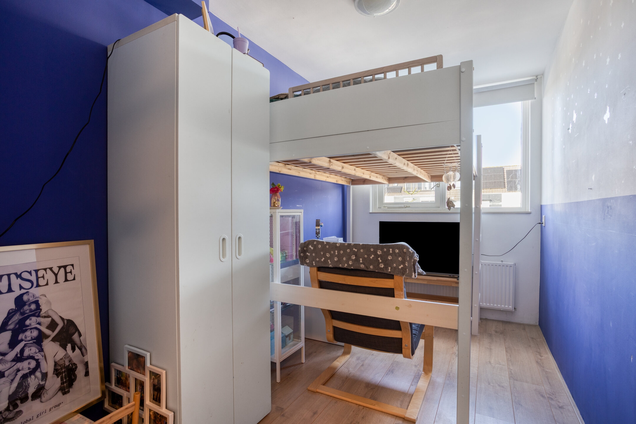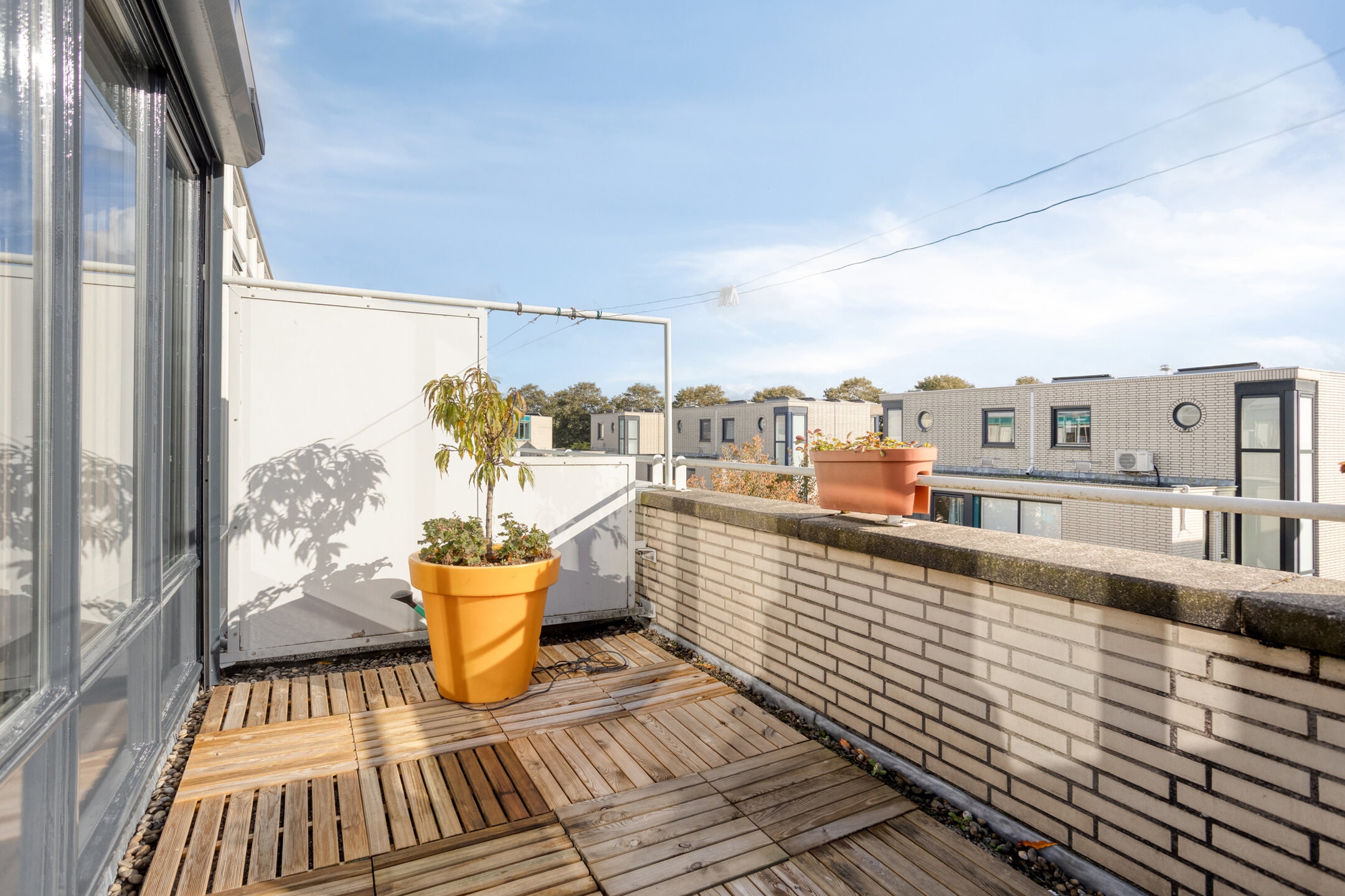 De tweede verdieping vormt een fijne en rustige woonlaag met een royale slaapkamer, directe toegang tot het dakterras en een moderne badkamer.