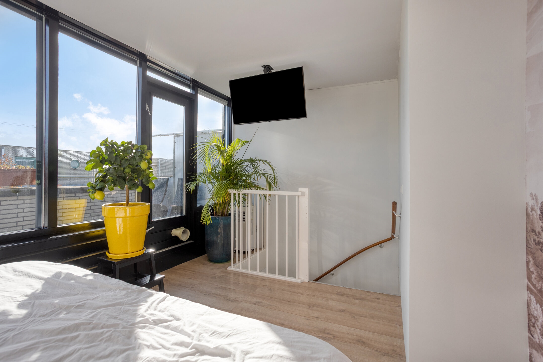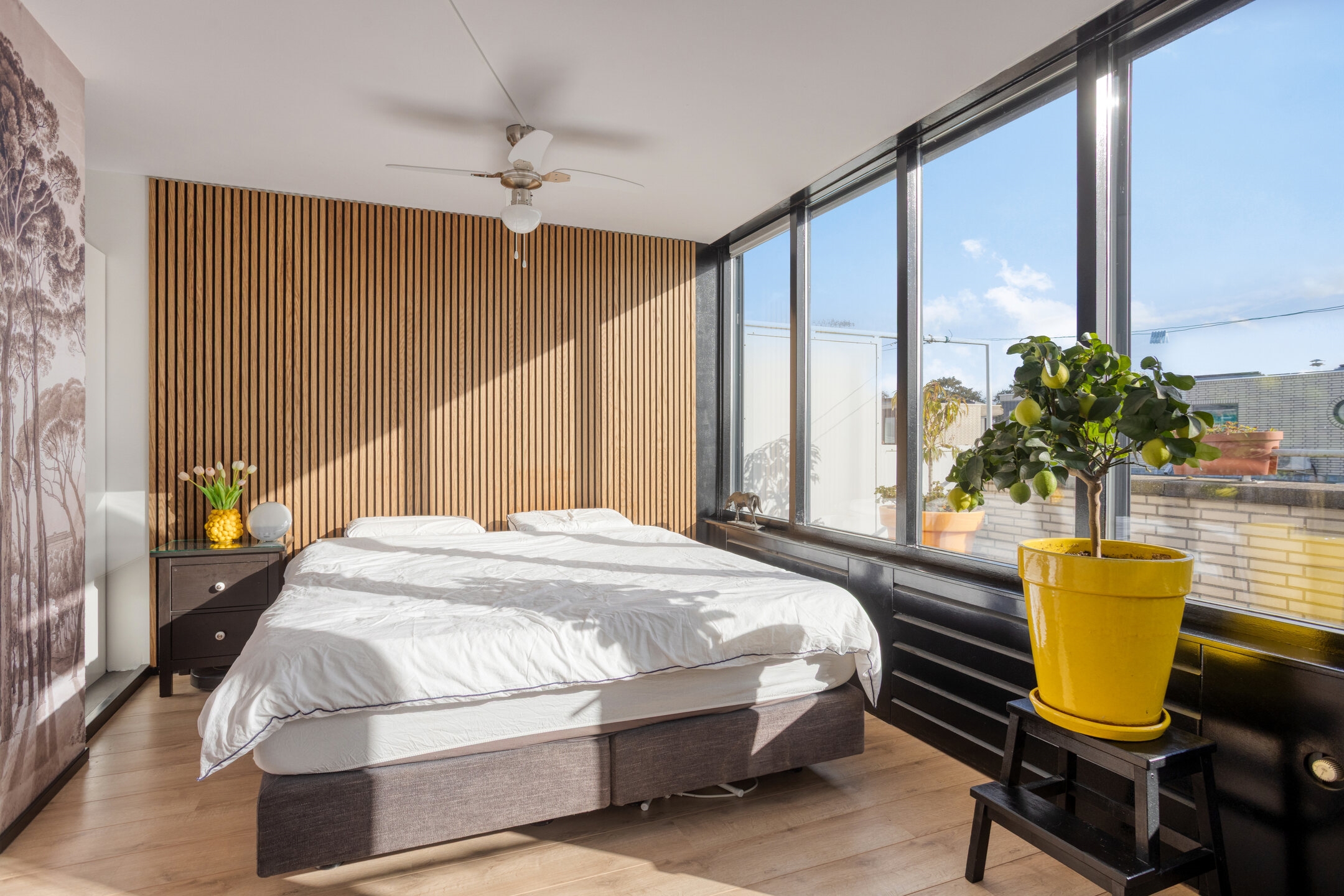 De slaapkamer is opvallend licht dankzij de grote raampartijen over de volledige breedte. Dankzij het royale formaat voelt de kamer open en comfortabel aan. Vanuit de kamer heb je direct toegang tot het dakterras, waar je prettig buiten kunt zitten en geniet van het vrije uitzicht.