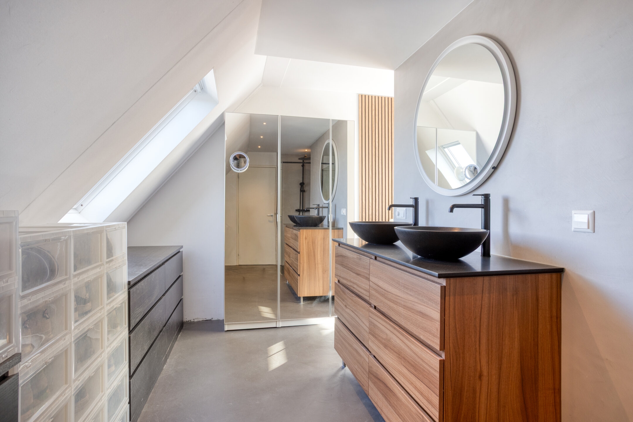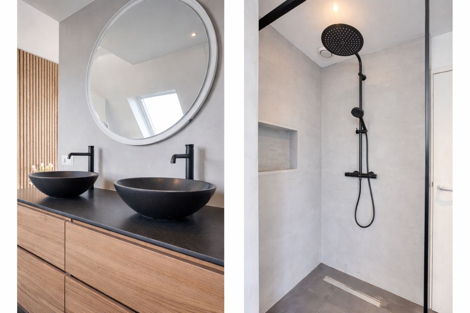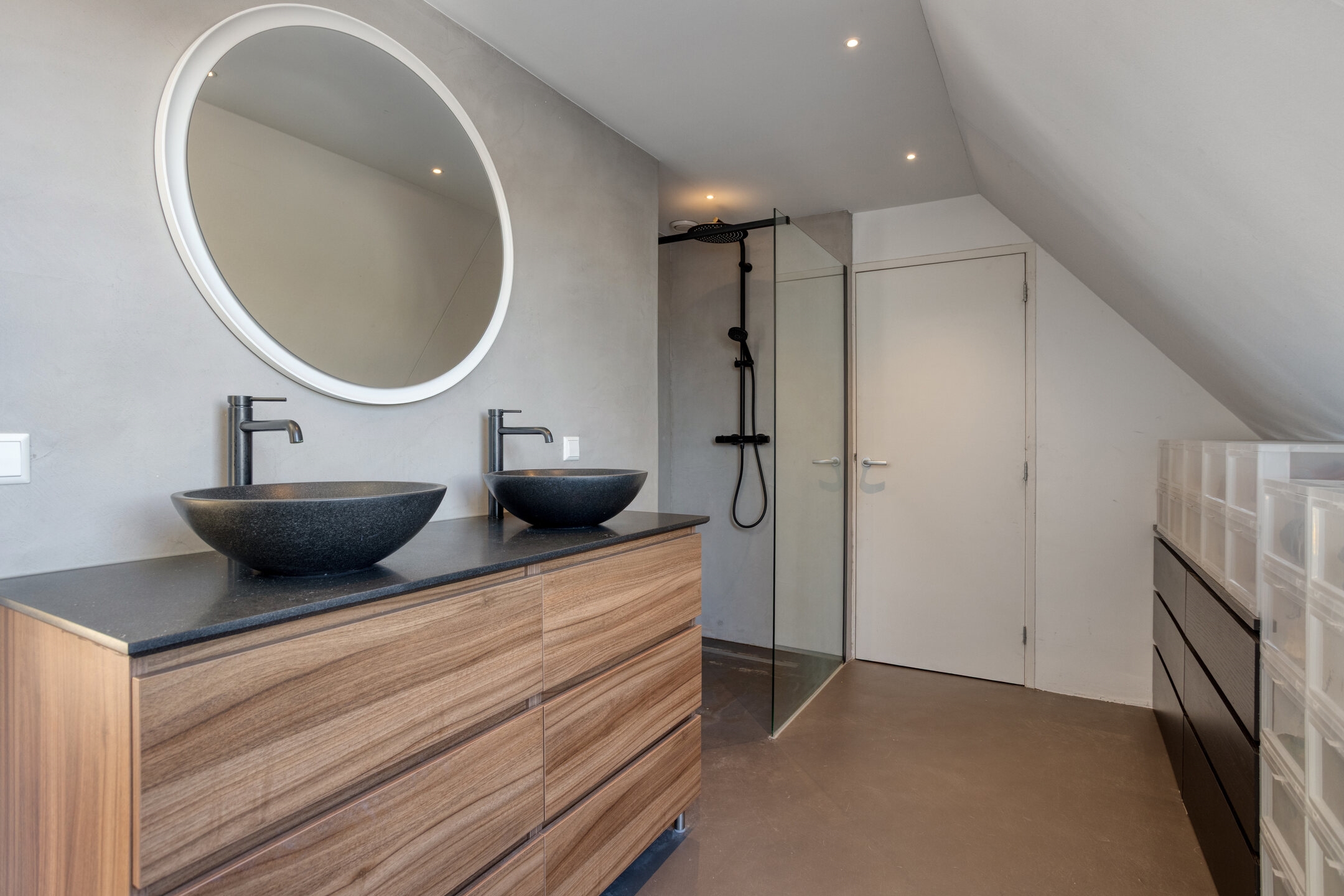 De badkamer is modern en verzorgd afgewerkt en beschikt over een dubbele wastafel met meubel en een ruime inloopdouche met regendouche.