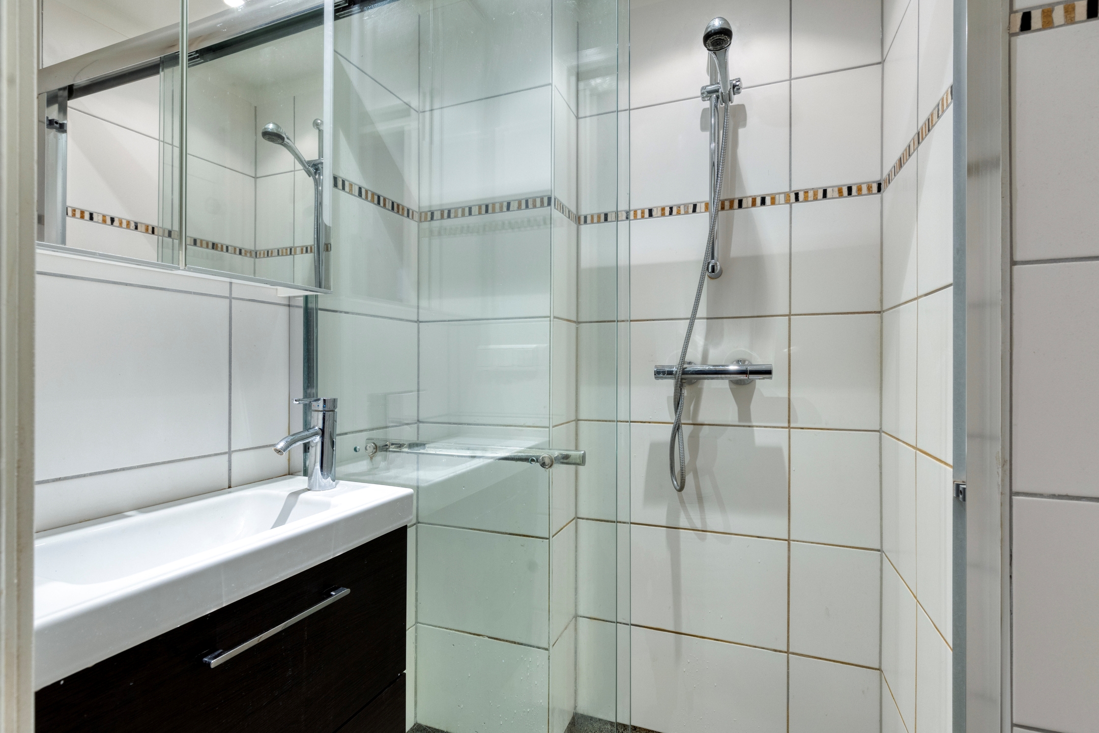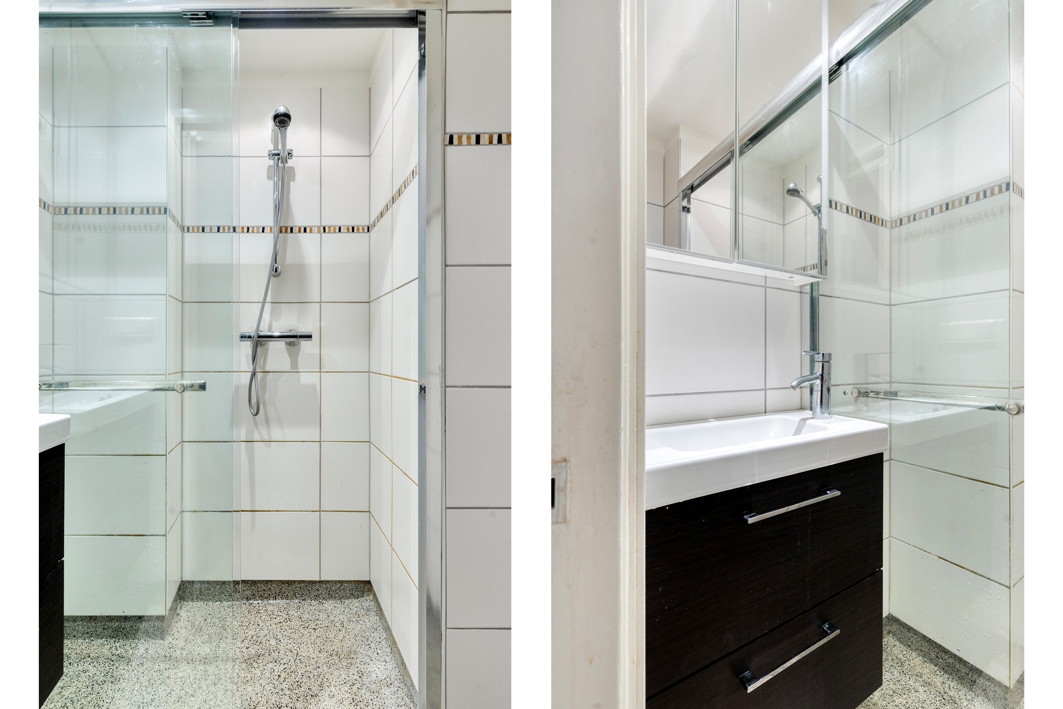 Entree. Ruime hal met inbouwkast en tevens een kast met aansluiting voor de wasmachine. Badkamer met inloopdouche en wastafelmeubel. Een separaat toilet met originele granito vloer en een fonteintje. Toegang tot de lichte woon-/eetkamer met twee vaste inbouwkasten en een deur naar het balkon aan de achterzijde (NO) met inbouwkast (met opstelling CV ketel).
