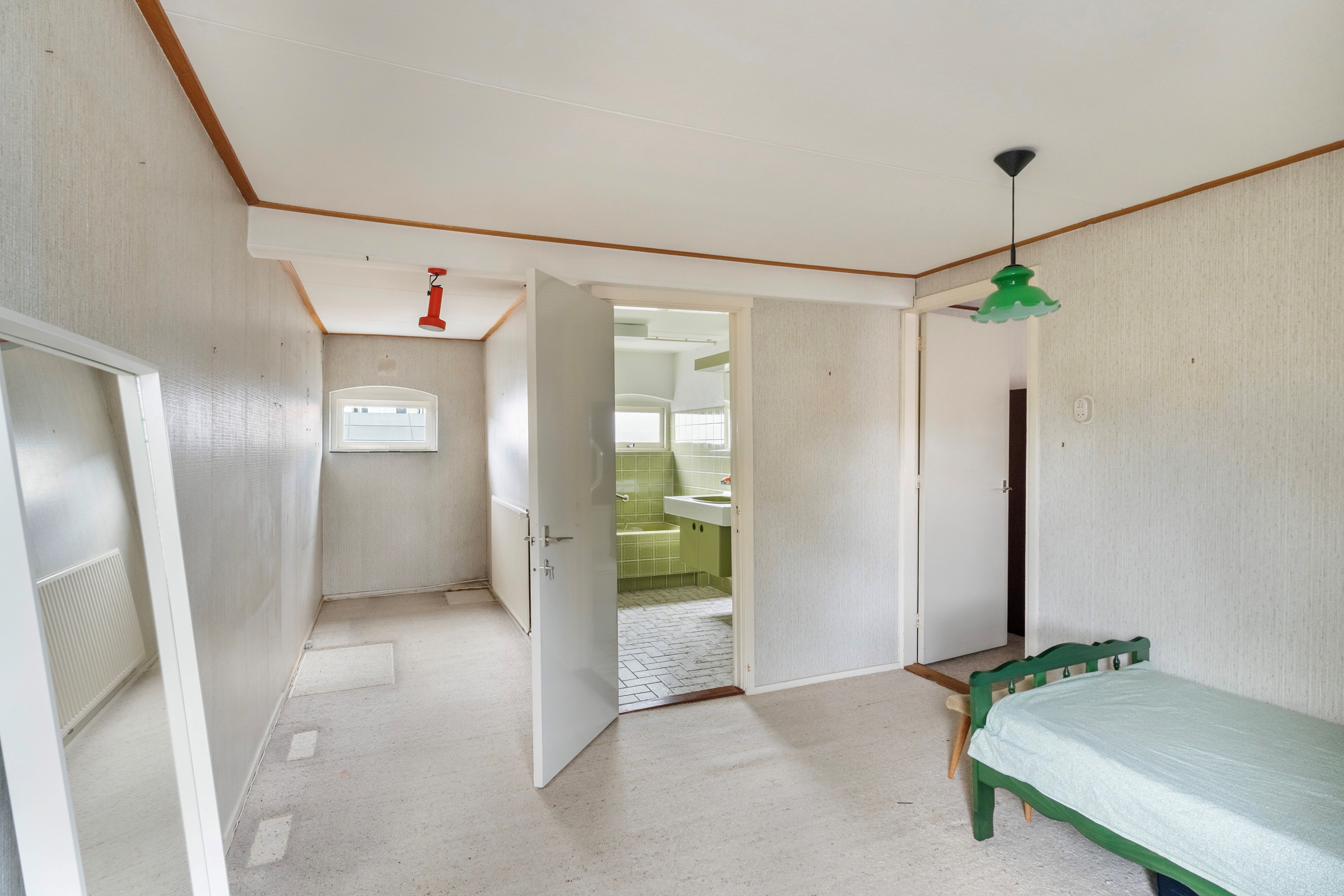 Overloop, 4 slaapkamers waarvan één met balkon en vaste kastwand. Eenvoudige maar functionele badkamer met ligbad/douche, wastafelmeubel en tweede toilet. Vanuit één van de slaapkamers heeft u toegang tot de verdieping boven de multifunctionele ruimte – eveneens met trap naar beneden en grote ramen.