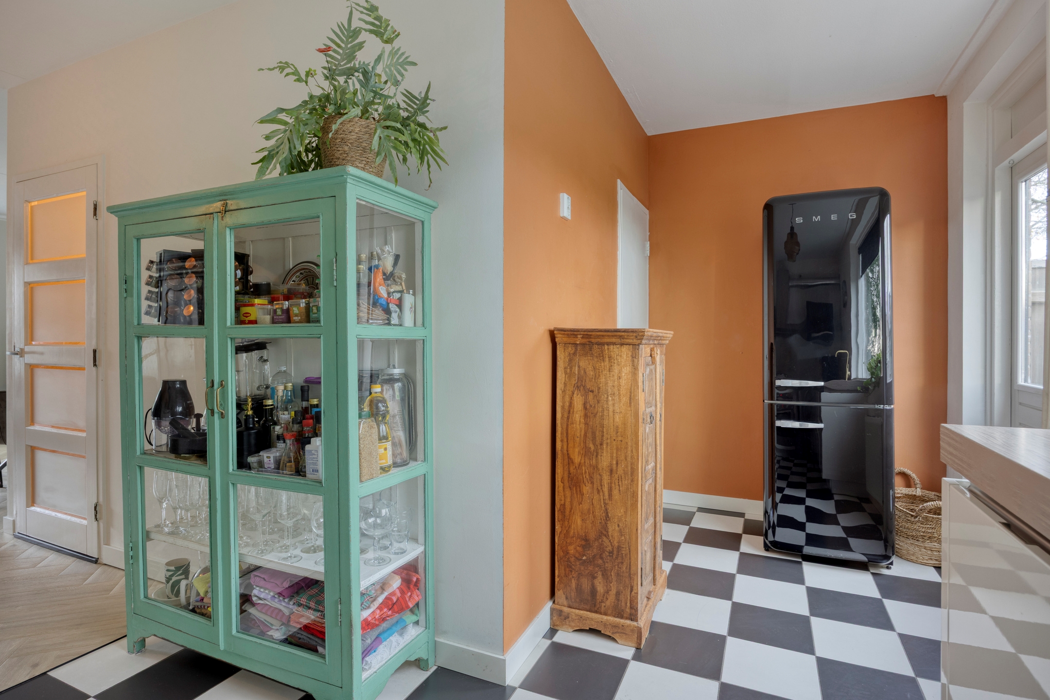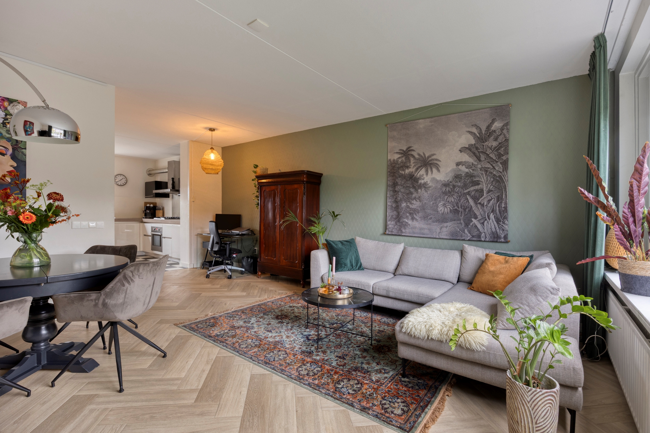 De lichte en royale woonkamer heeft een prachtig vrij uitzicht op de singel met groene oevers en is afgewerkt met een stijlvolle pvc-visgraatvloer. Er is volop ruimte voor zowel een comfortabele zithoek als een royale eethoek.