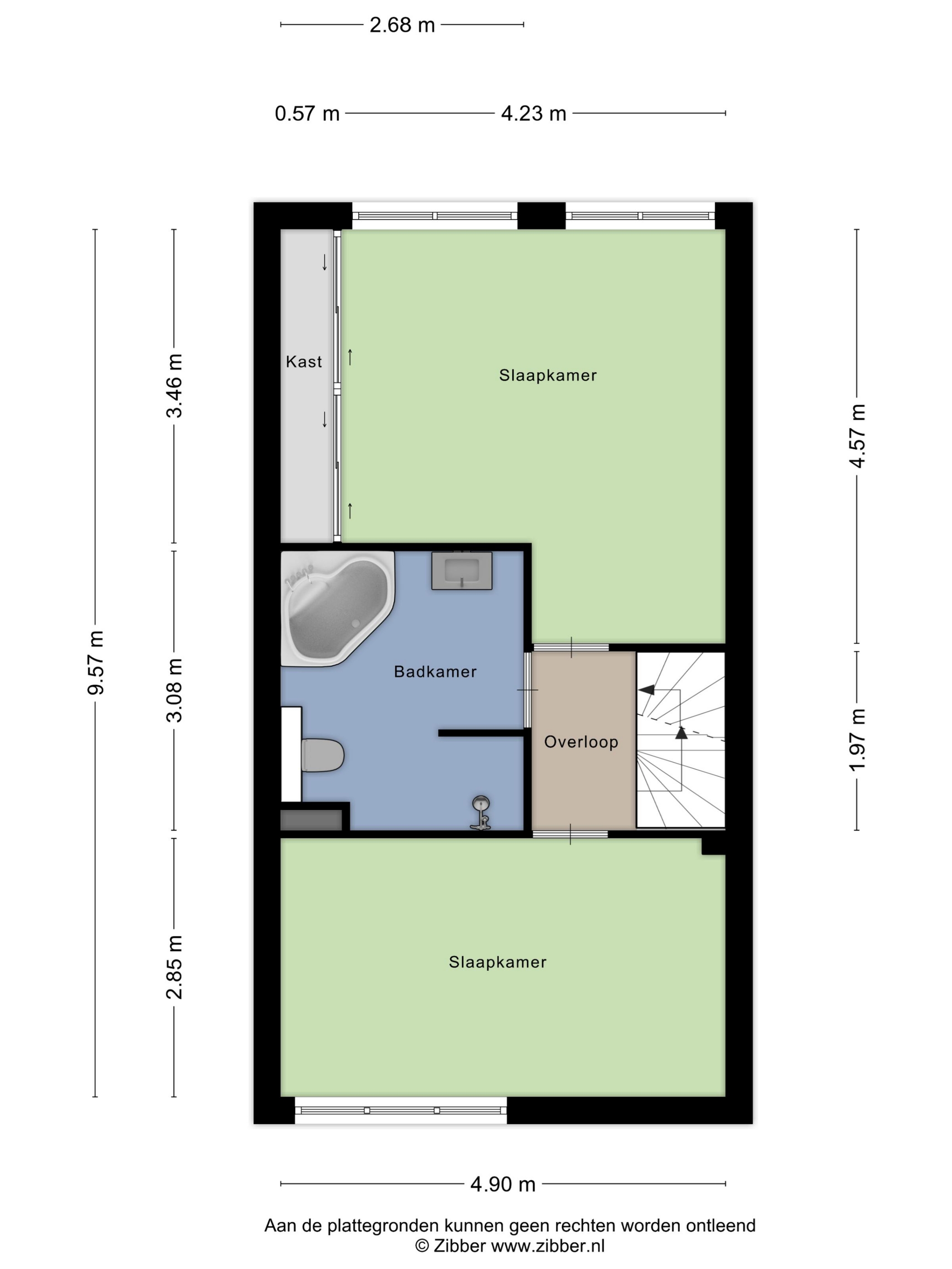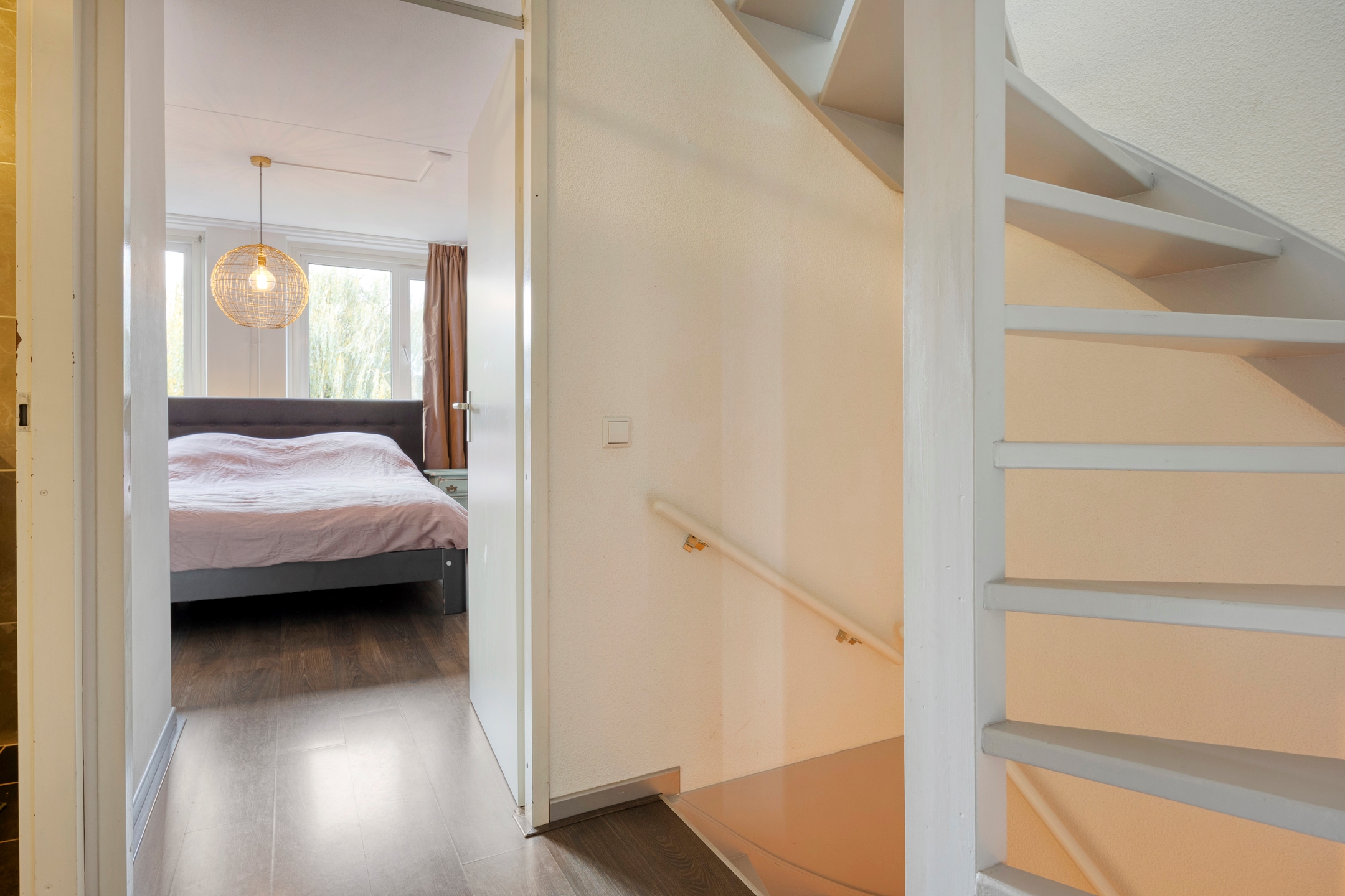 De overloop geeft toegang tot twee ruime slaapkamers en de badkamer. De achterste slaapkamer heeft een fraai uitzicht op het groen en is voorzien van een praktische schuifkastenwand. De slaapkamer aan de voorzijde is eveneens goed bemeten en biedt volop mogelijkheden voor een comfortabele inrichting.