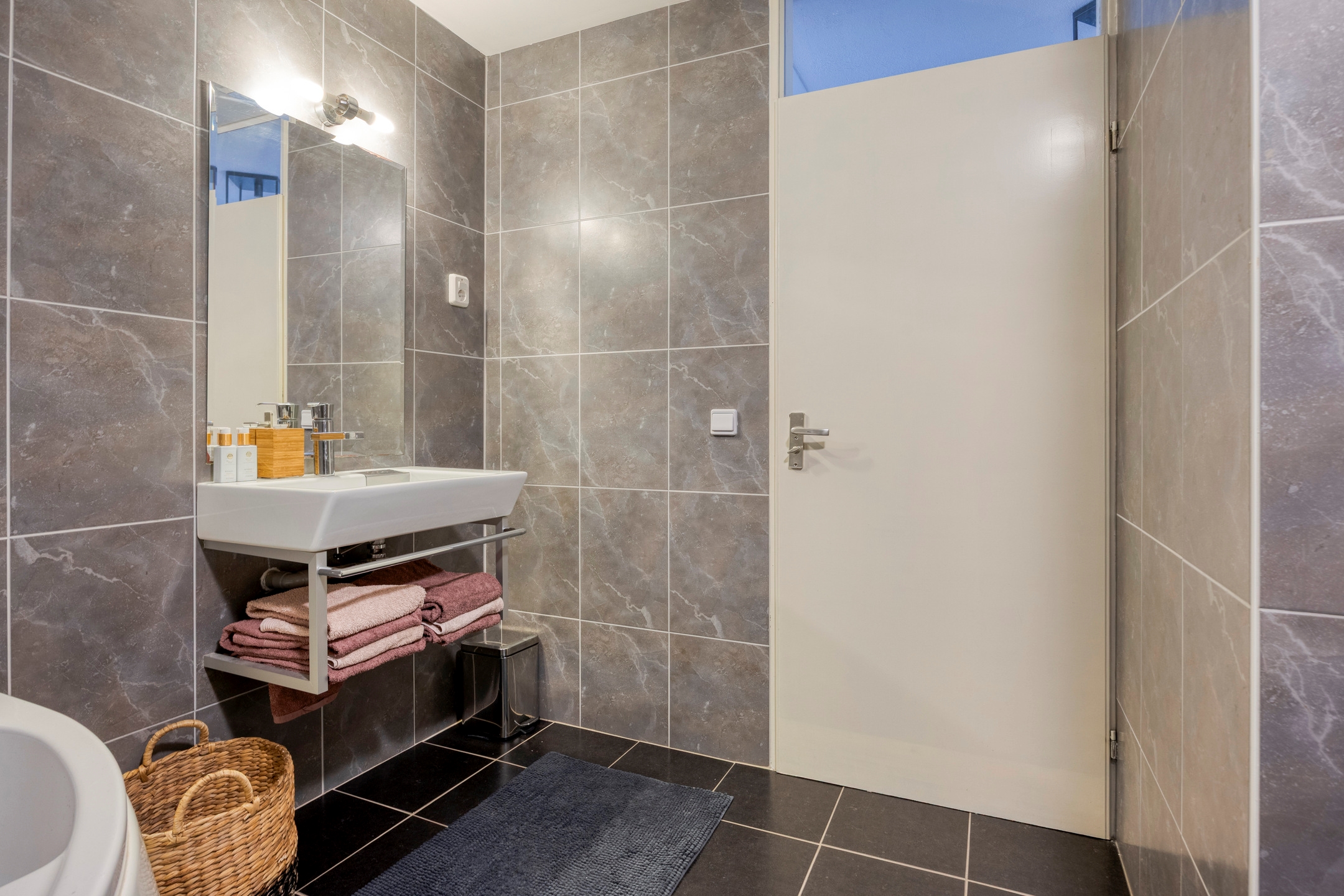De badkamer is volledig betegeld en ingericht met een ligbad, inloopdouche, wastafel en tweede toilet.