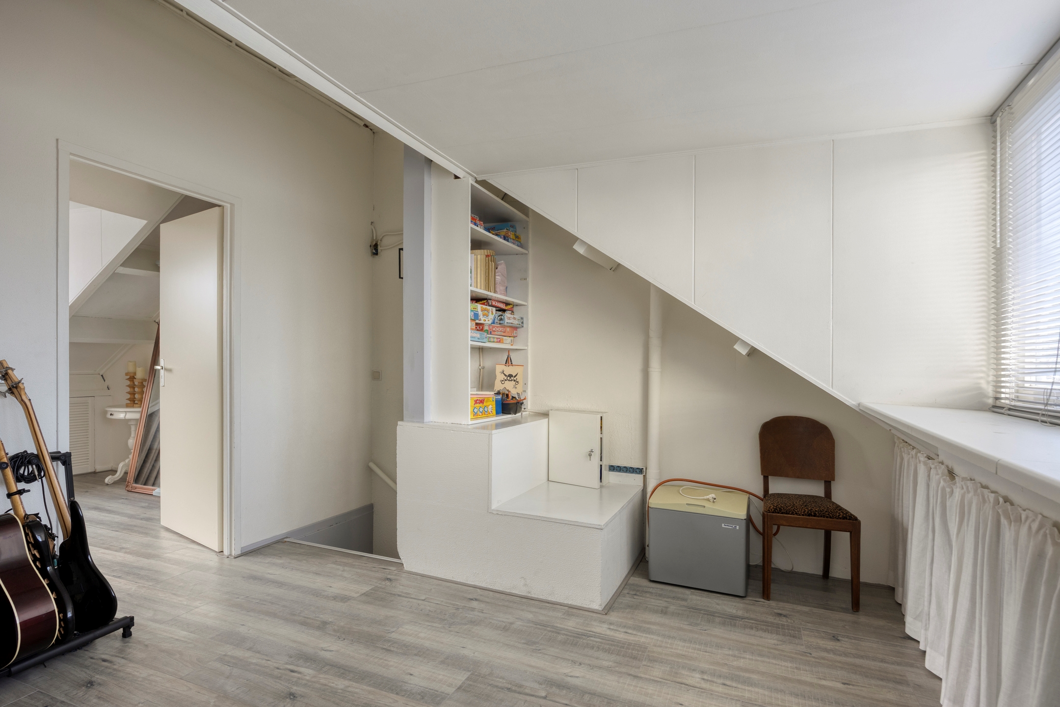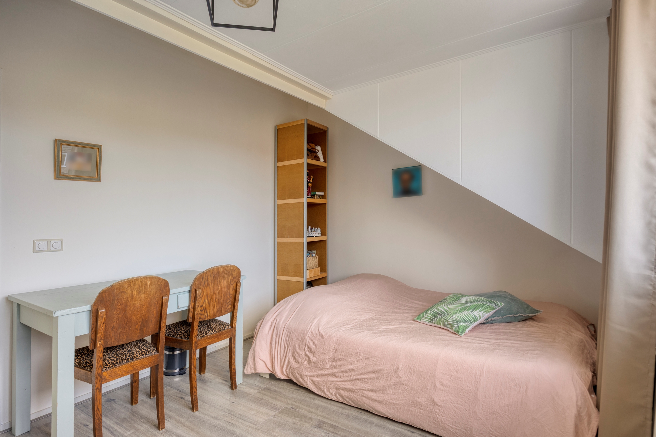 De zolderetage is een ruime en veelzijdige verdieping. Momenteel is hier één slaapkamer ingericht, maar met de aanwezige ruimte en indeling is het eenvoudig om er twee slaapkamers van te maken. Dankzij twee dakkapellen, één aan de voorzijde en één aan de achterzijde, is er veel daglicht. Daarnaast is er voldoende bergruimte en een praktische plek voor de wasmachine en droger.