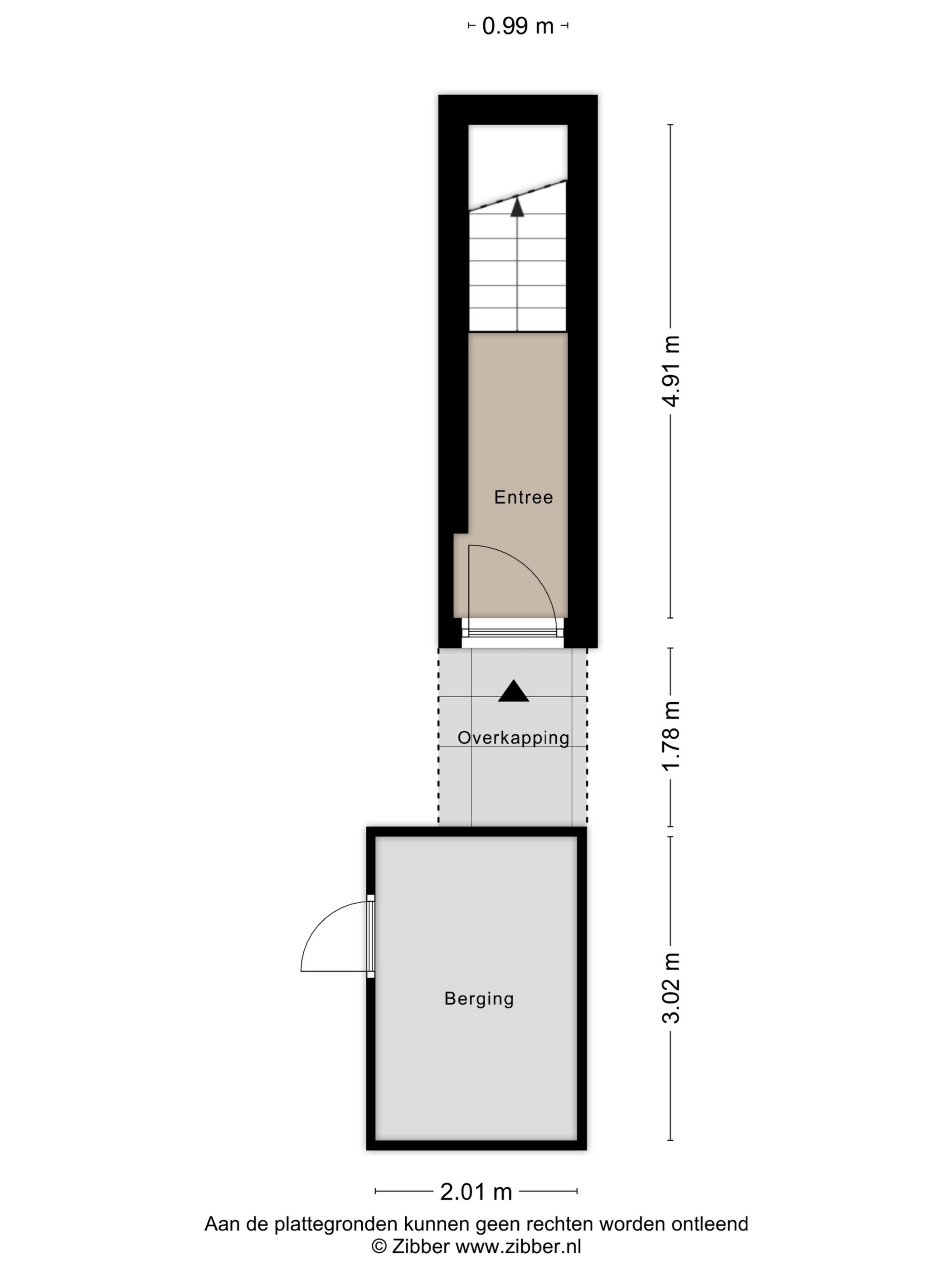 Via de eigen entree komt u in de hal met meterkast en trapopgang naar de woonverdieping. Aan de voorzijde van het complex bevindt zich een stenen berging van ca. 6 m² en voorzien van elektra.