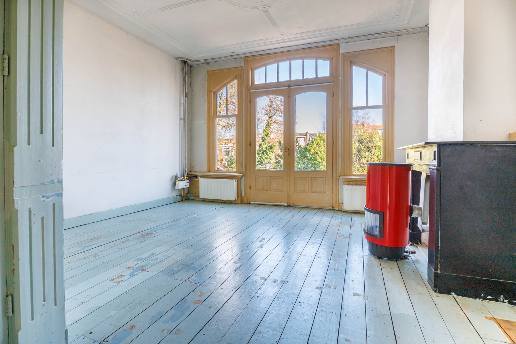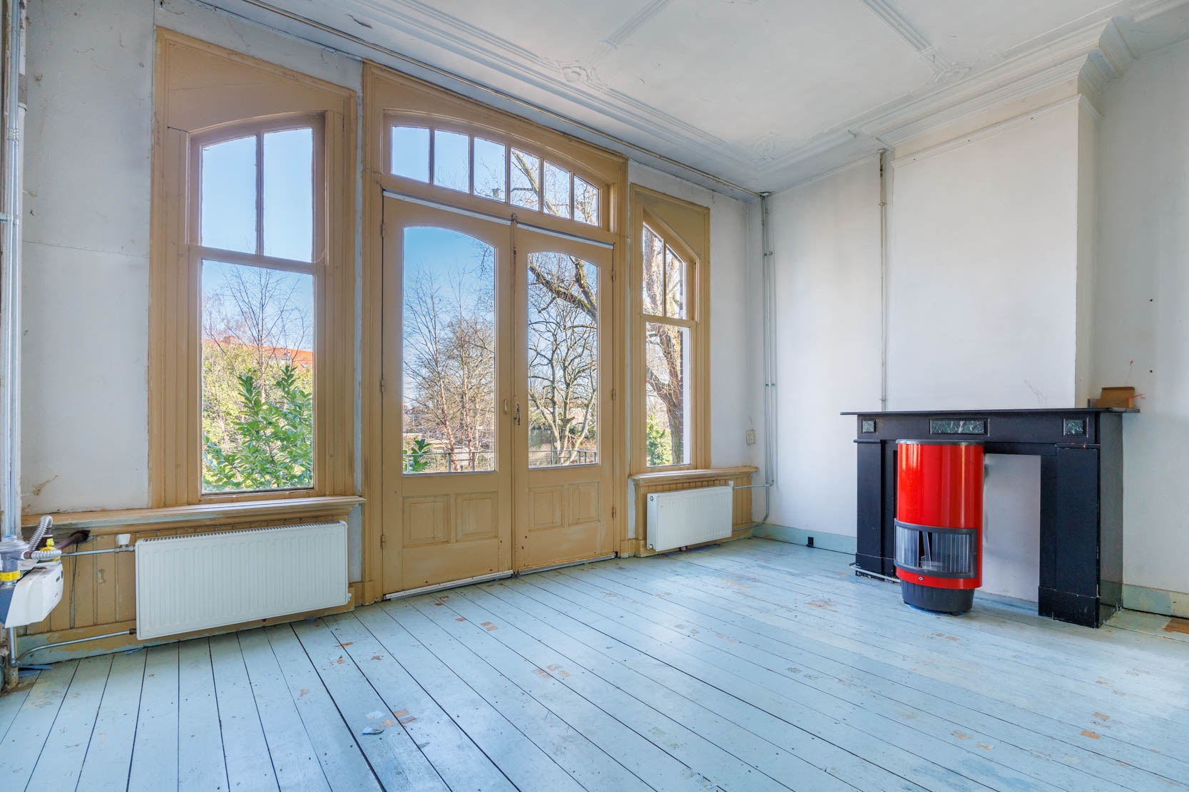 Overloop met toegang tot de woonkamer, eetkamer, toilet en een ruime vaste kast. De royale en lichte woonkamer aan de voorzijde kenmerkt zich door prachtige authentieke hoge ramen, een hoog plafond en een sfeervolle schouw. Via openslaande deuren bereik je het ronde balkon met origineel hekwerk, waar je volop kunt genieten van het mooie uitzicht op de groene omgeving en het water.
