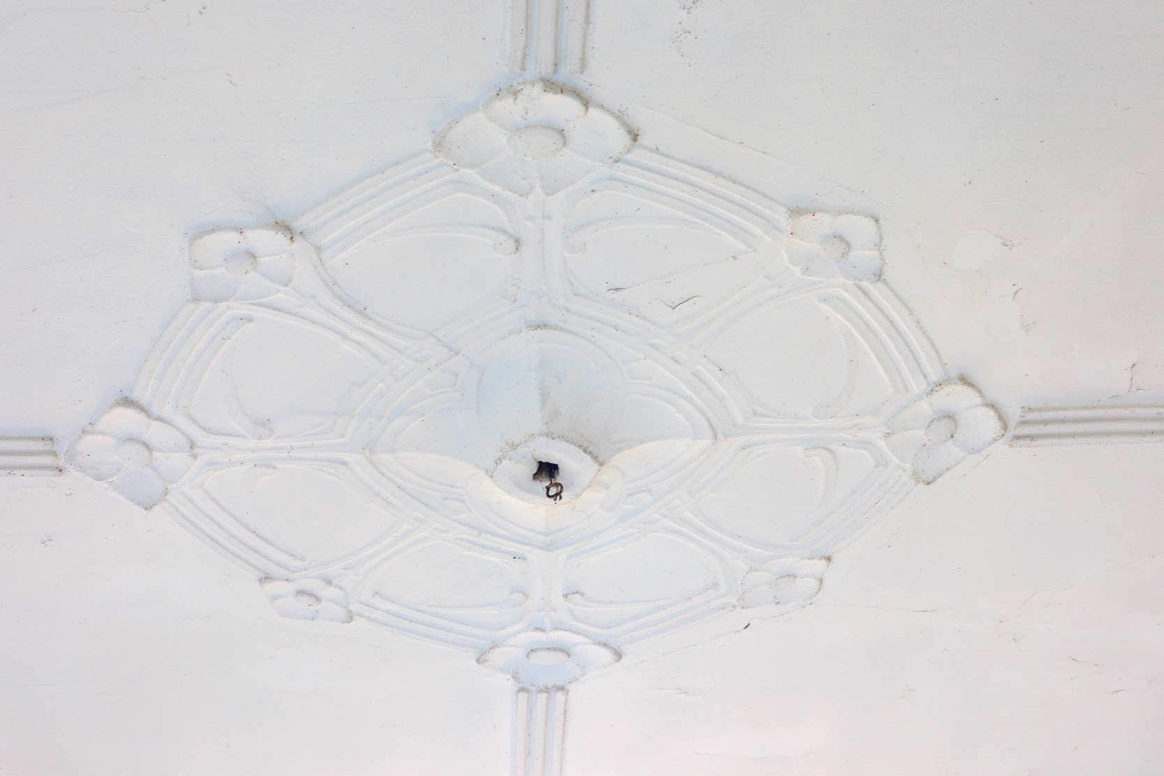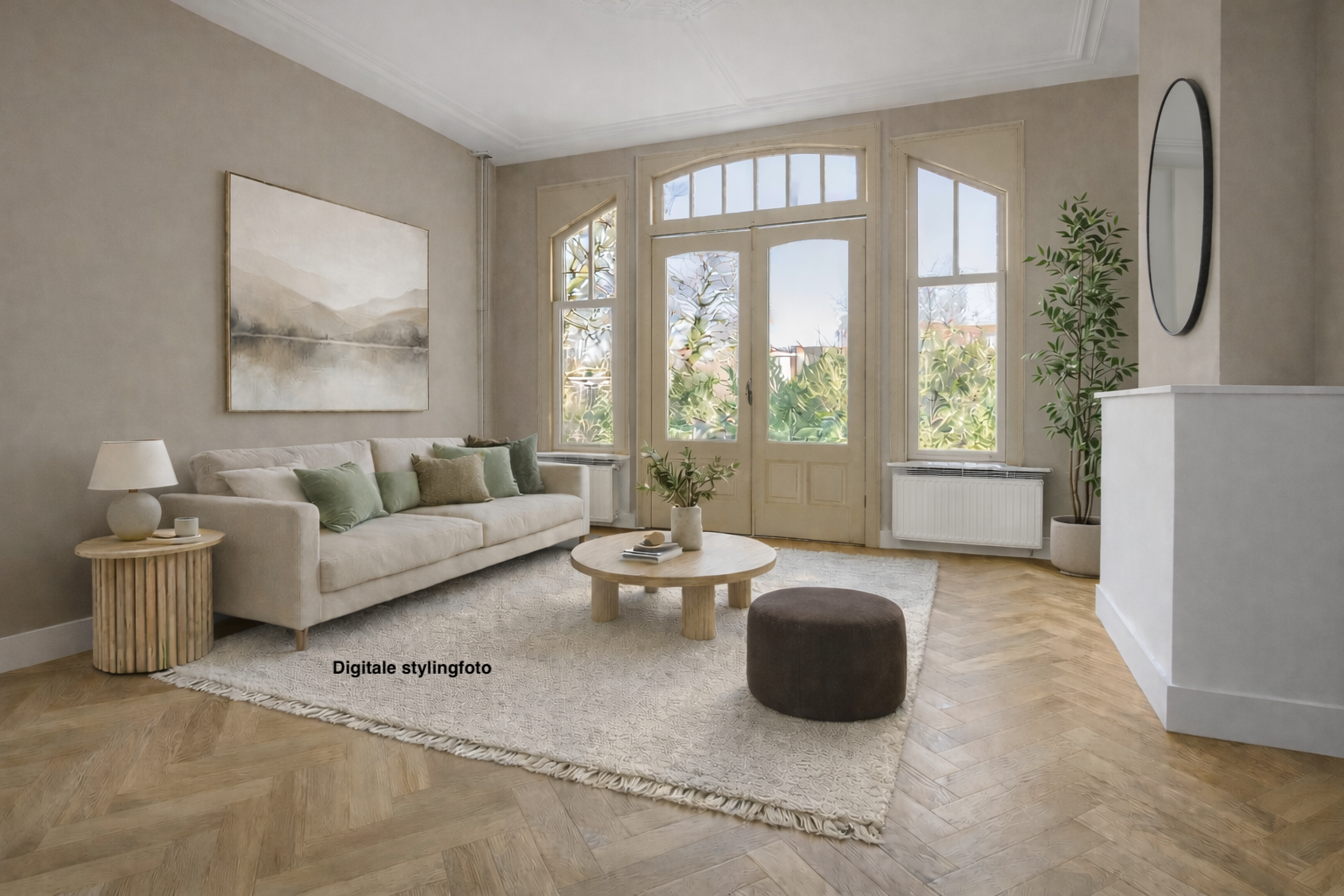 Landing with access to the living room, dining room, toilet, and a large built-in storage cupboard. The generous and bright living room at the front is characterized by beautiful authentic high windows, high ceilings, and an attractive fireplace mantel. French doors open onto the rounded balcony with original railings, where you can fully enjoy the lovely views of the green surroundings and the water.