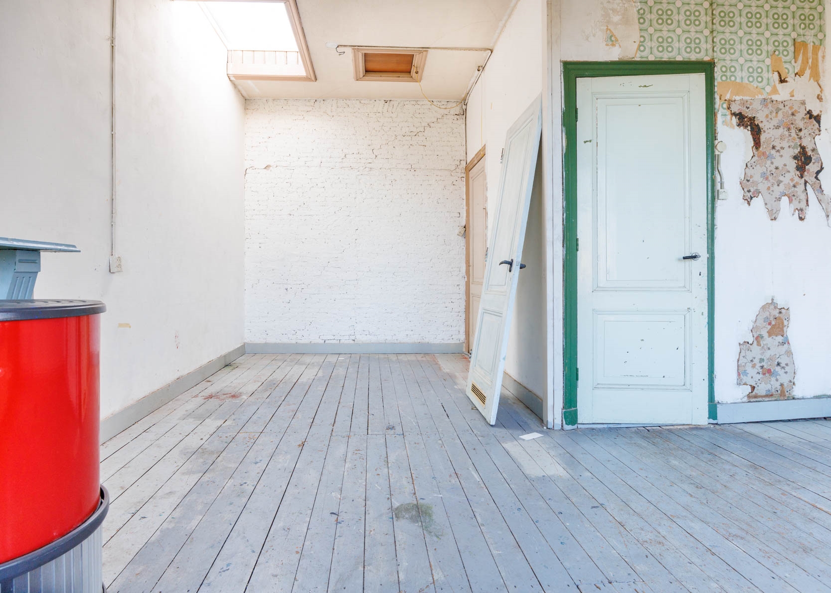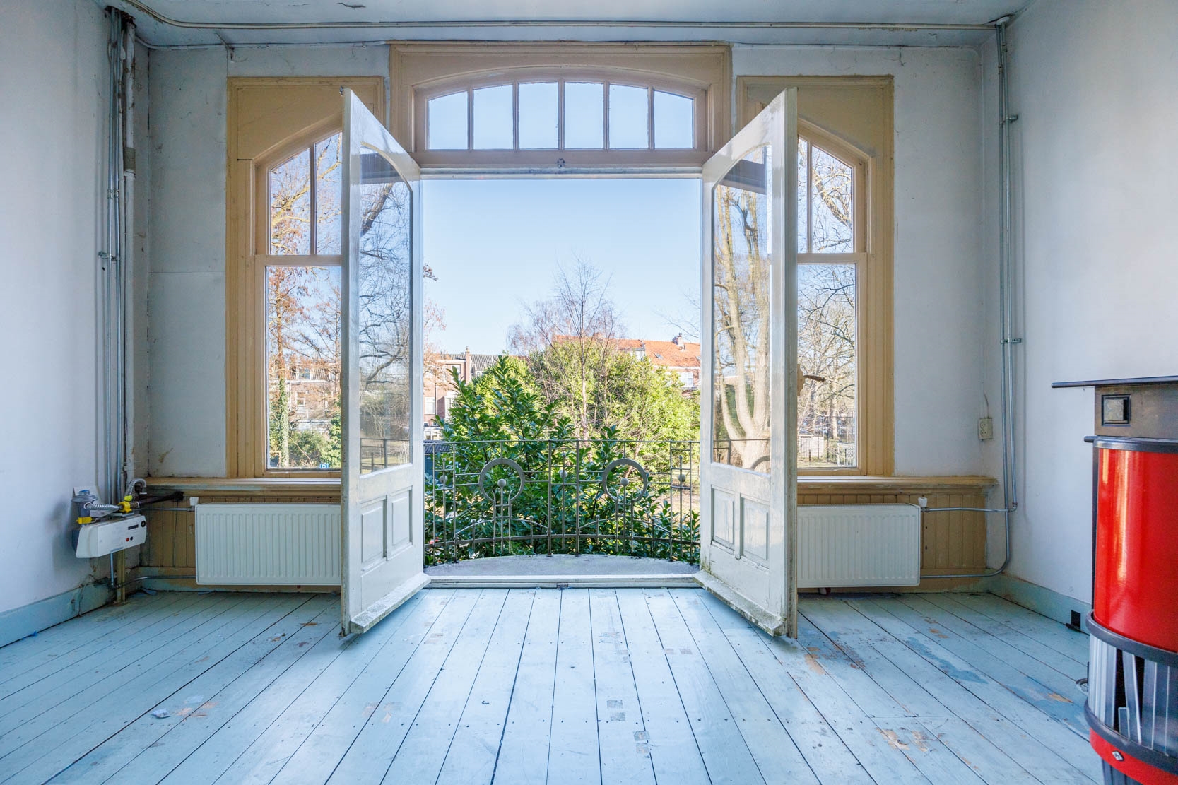 Spacious and bright landing with a skylight, providing access through two doors to a very large and sunny (bed)room at the front (formerly two rooms). Here too, the high ceilings and large windows create wonderful natural light. The room also features a characteristic fireplace mantel with stove and an additional skylight.