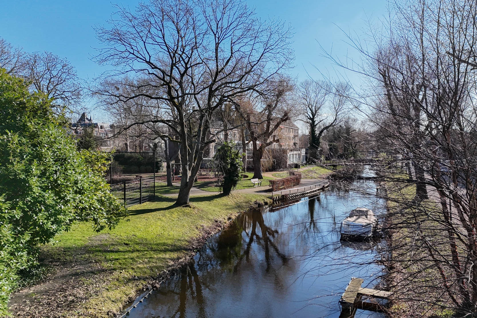 Aan de achterzijde bevindt zich nog een (slaap)kamer met een originele schouw. Via openslaande deuren is er toegang tot het royale balkon/dakterras, waar je heerlijk kunt genieten van de middag- en avondzon en het fraaie uitzicht.