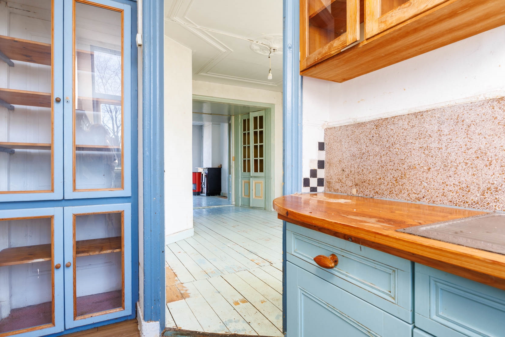 De woonkamer staat middels dubbele en-suitedeuren, voorzien van meerdere vaste originele kasten, in verbinding met het tweede gedeelte van de woonkamer. Hier is eenvoudig een fraaie eetkamer te realiseren. Vanuit deze ruimte geven de en-suitedeuren toegang tot een extra kamer/serre met uitzicht op de groene omgeving. De gesloten keuken bevindt zich eveneens aan de achterzijde van de woning.