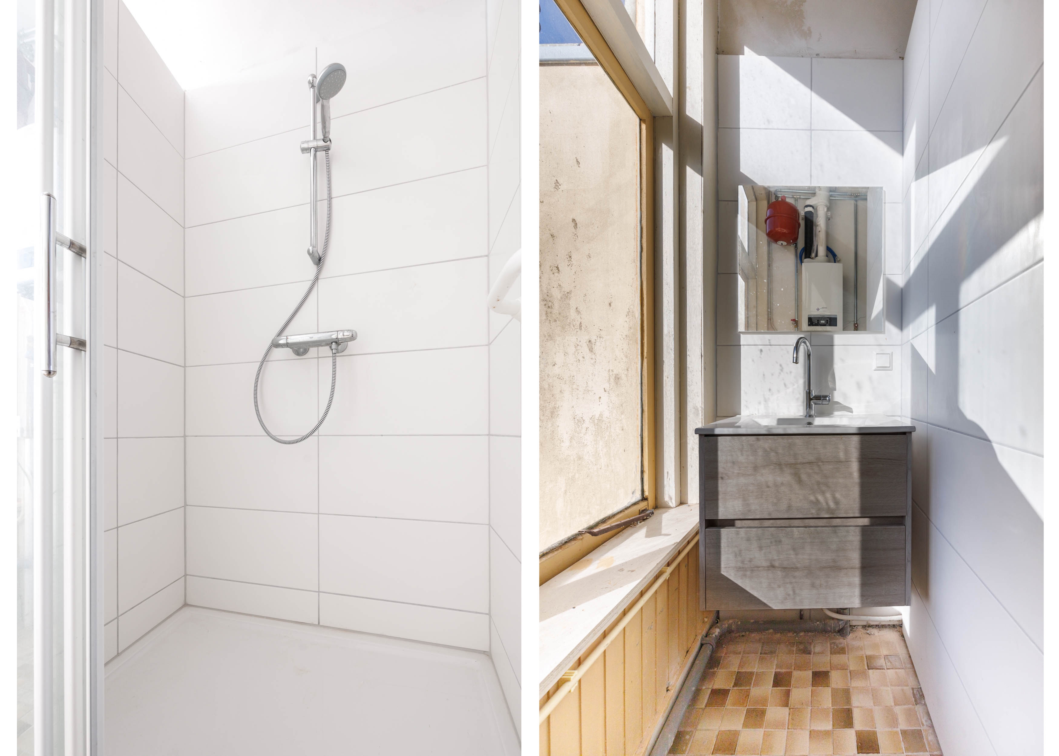De badkamer is voorzien van een moderne, ruime douchecabine en een wastafel. Tevens bevindt zich hier de aansluiting voor de wasmachine.