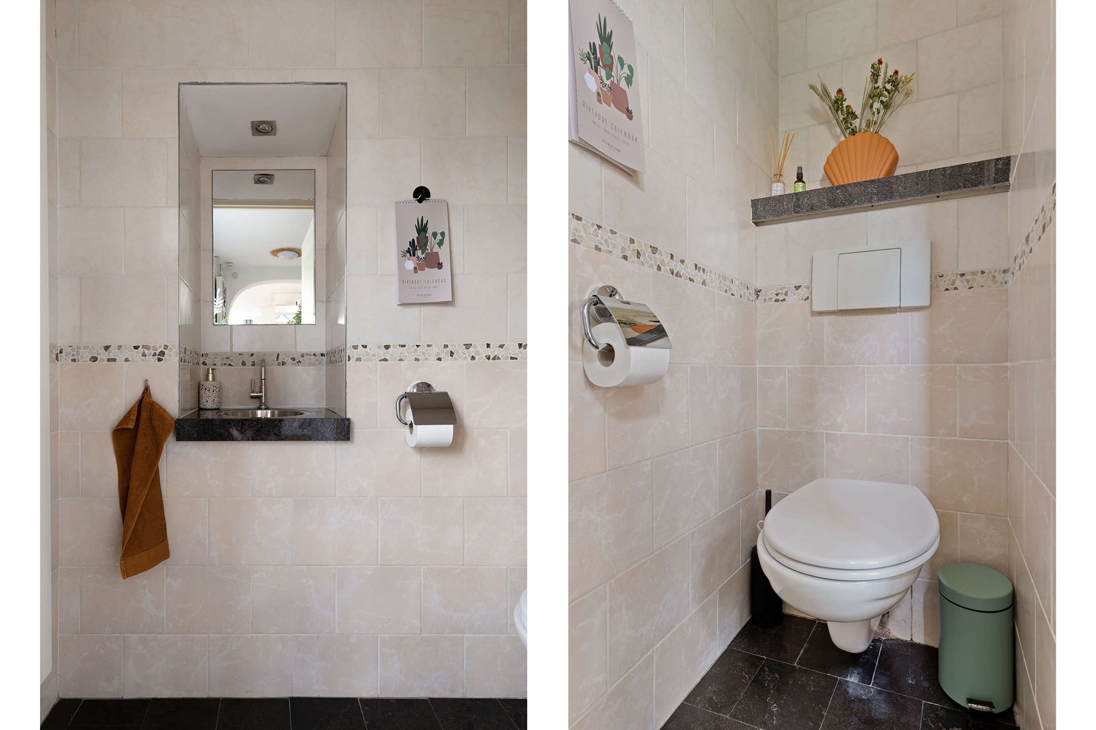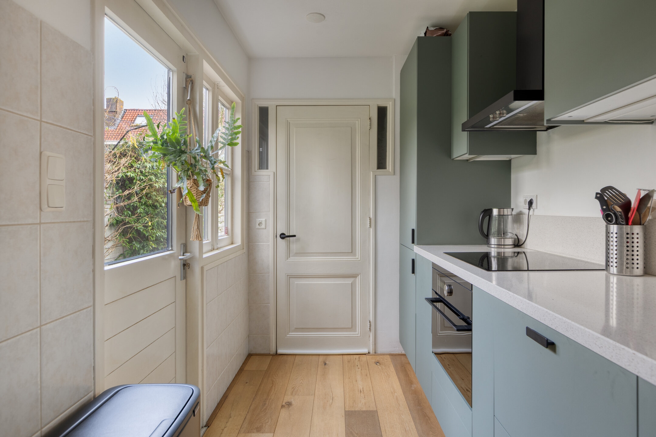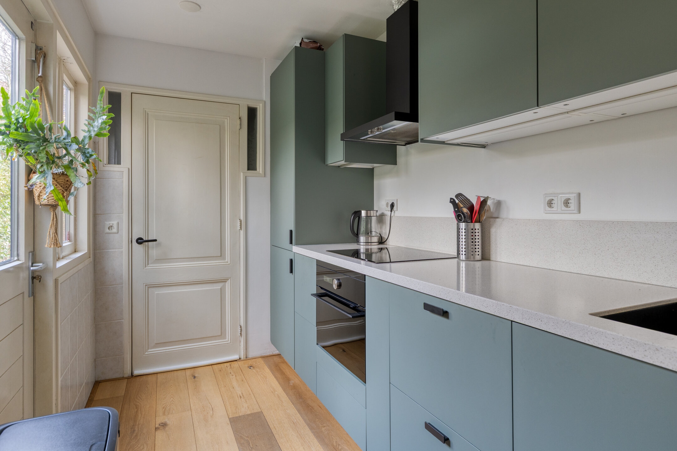 Aan de achterzijde bevindt zich de uitbouw met de keuken, die in 2022 volledig is vernieuwd. Nieuwe apparatuur, kasten, een fris werkblad en een nieuwe spoelunit maken dit tot een functionele en prettige werkruimte. Direct achter de keuken ligt het toilet met hangend closet en fonteintje.
