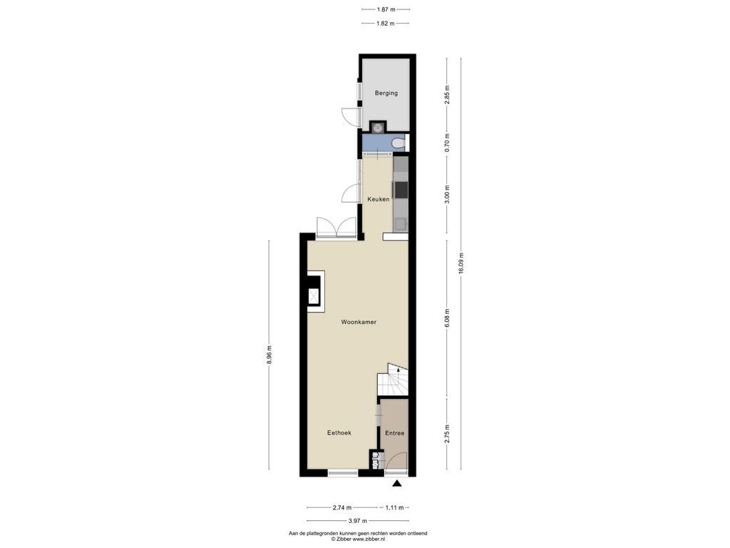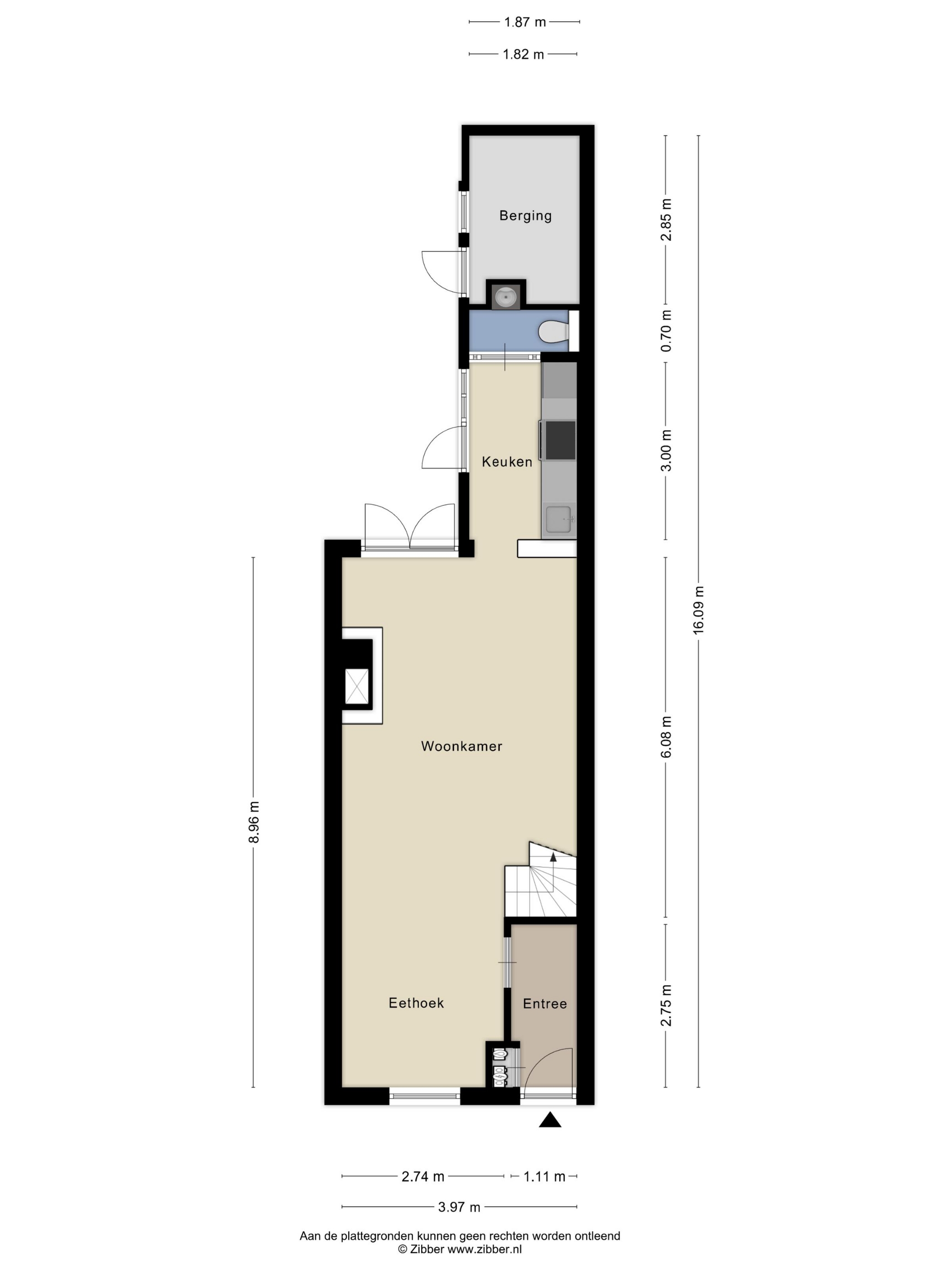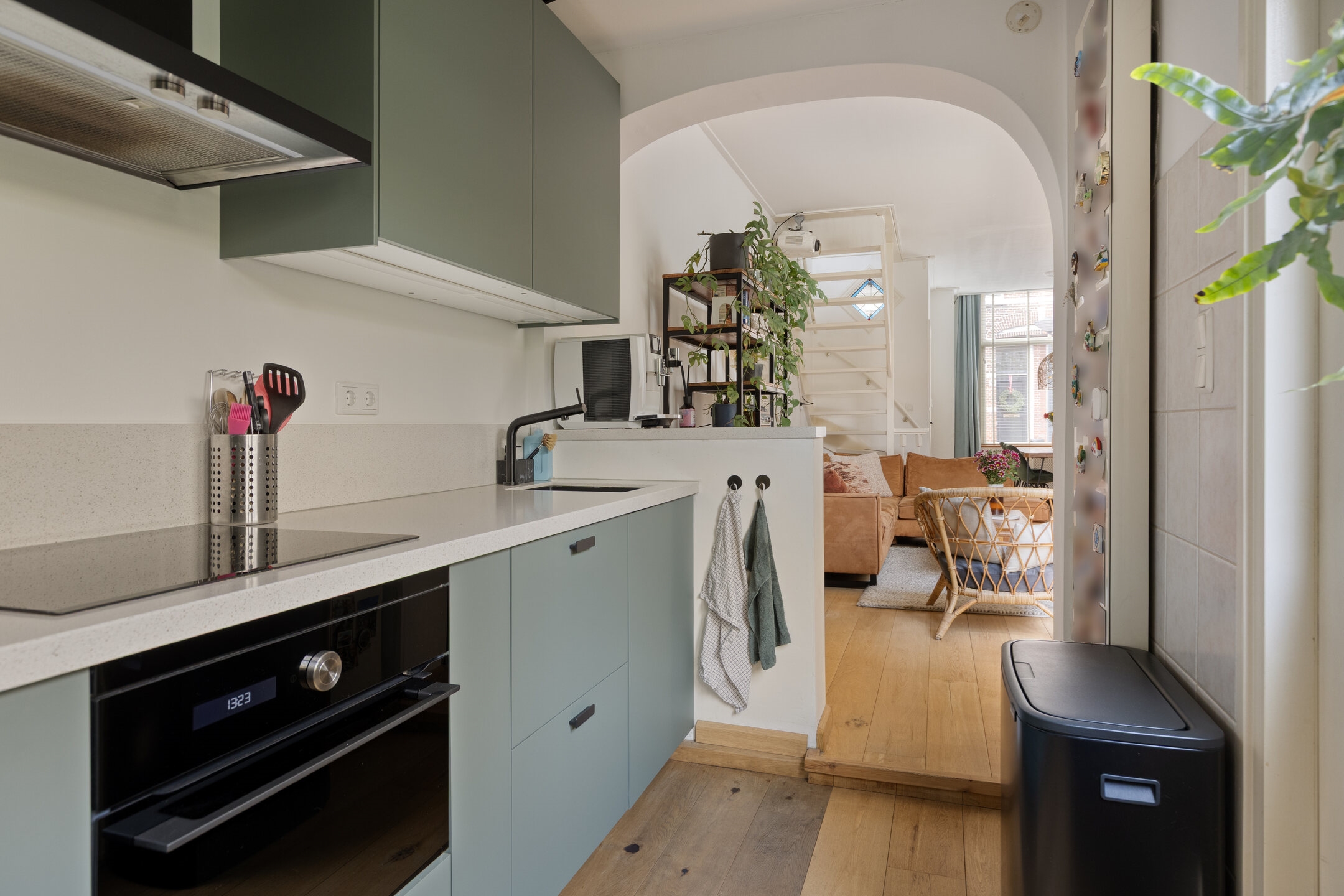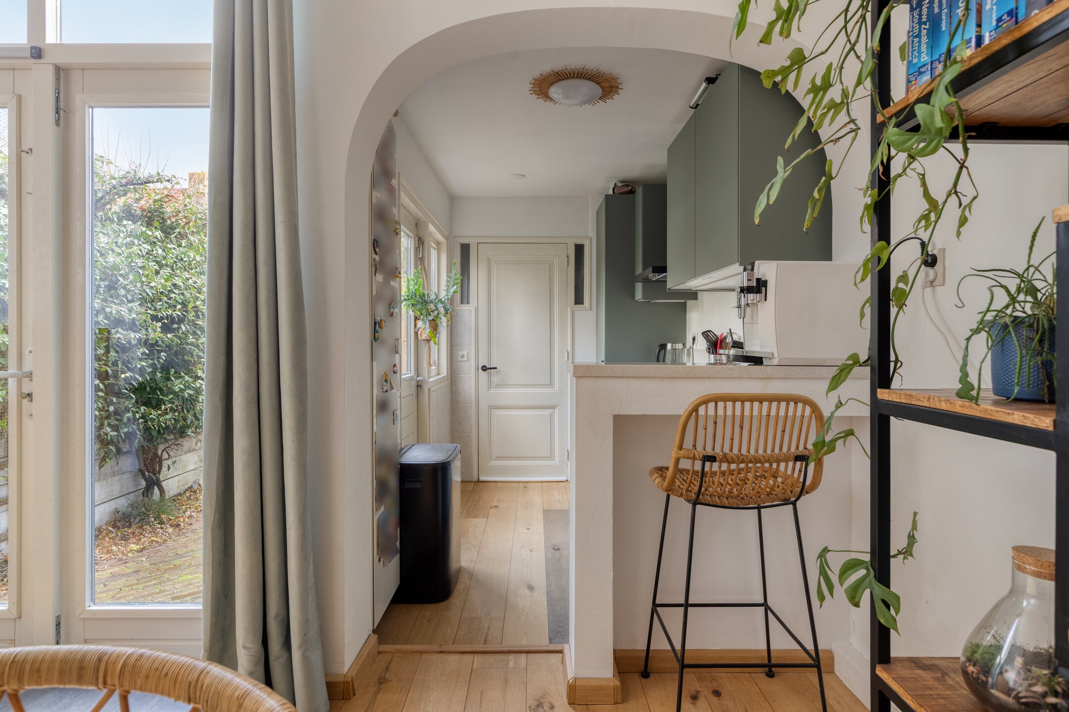 Aan de achterzijde bevindt zich de uitbouw met de keuken, die in 2022 volledig is vernieuwd. Nieuwe apparatuur, kasten, een fris werkblad en een nieuwe spoelunit maken dit tot een functionele en prettige werkruimte. Direct achter de keuken ligt het toilet met hangend closet en fonteintje.