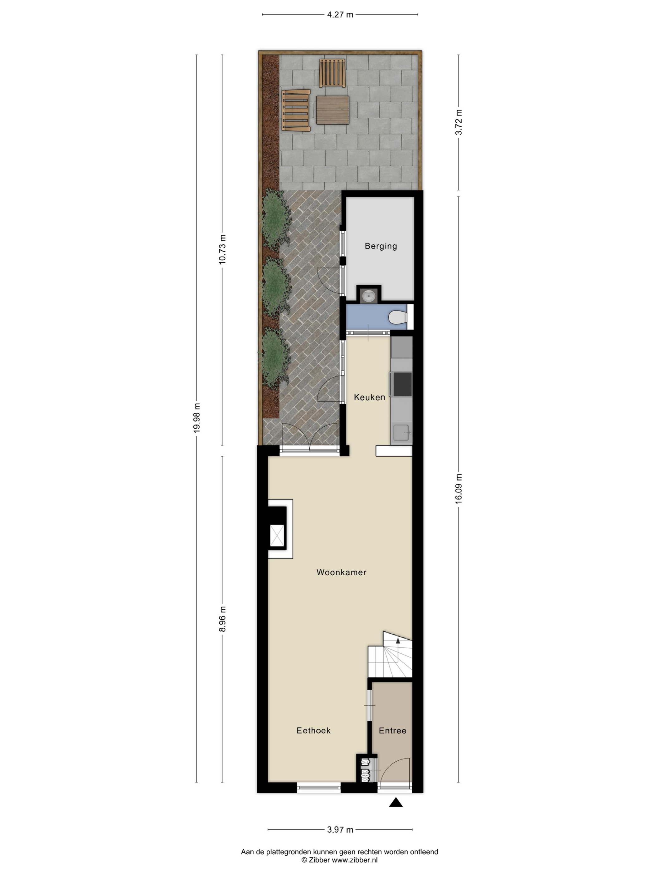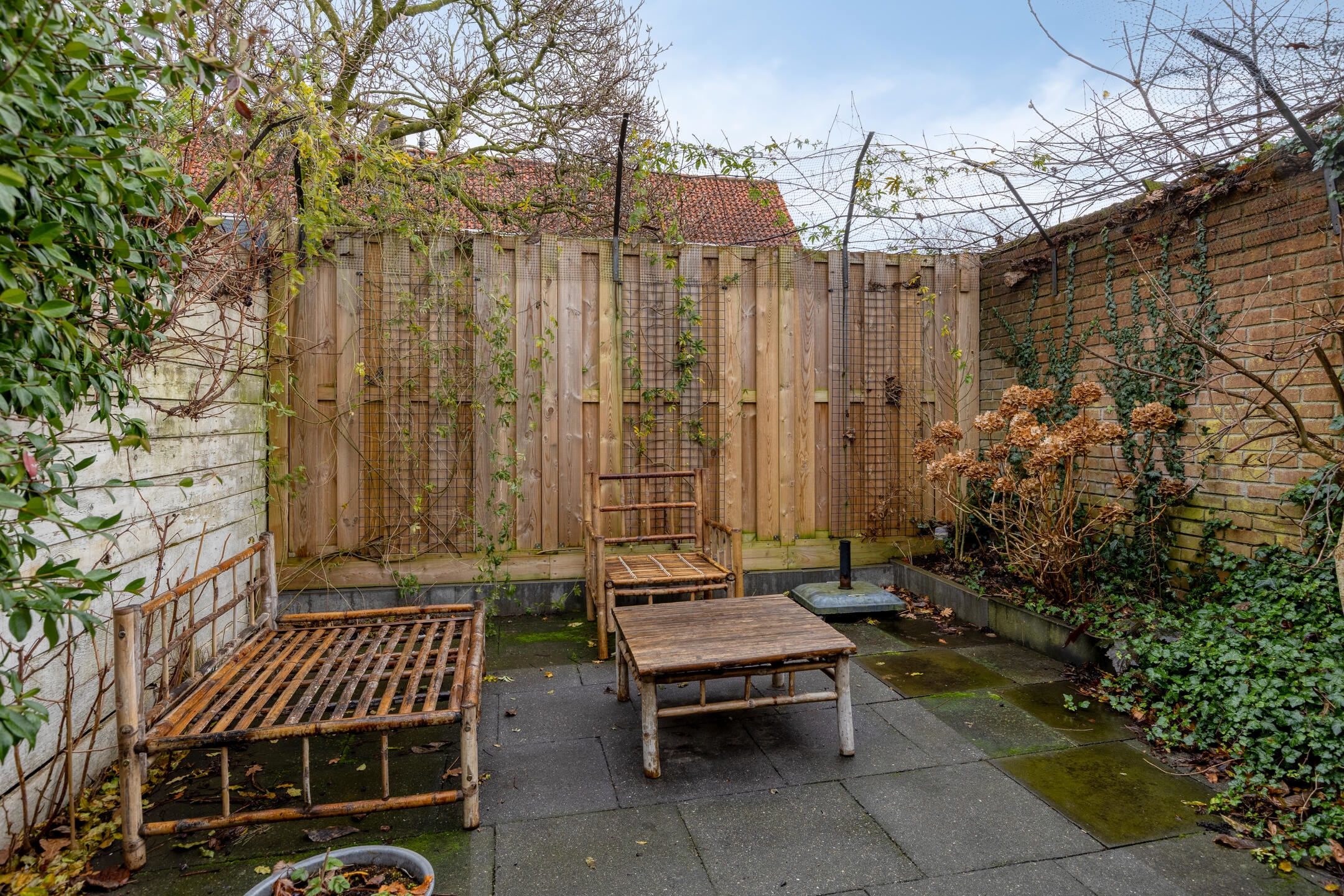 De achtertuin is zowel via de openslaande deuren in de woonkamer als via de keuken bereikbaar. De tuin strekt zich circa 10 meter diep uit en is gelegen op het zuidoosten. Door de diepte en open ligging is hier van de ochtend tot in de avond zon te vinden. Aangrenzend aan de woning bevindt zich een stenen berging met opstelplaats voor wasmachine en droger, aangevuld met een extra houten bergkast.