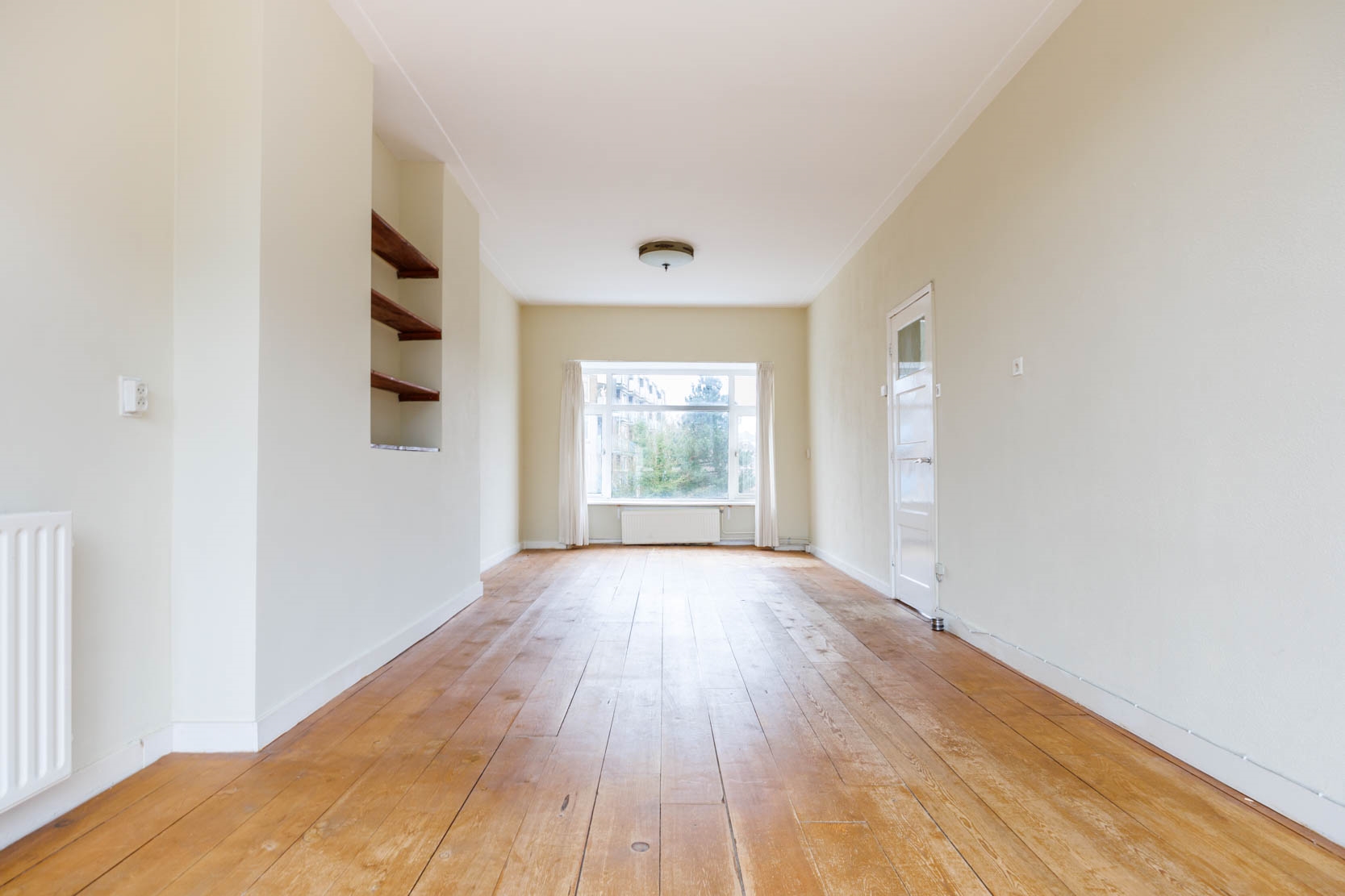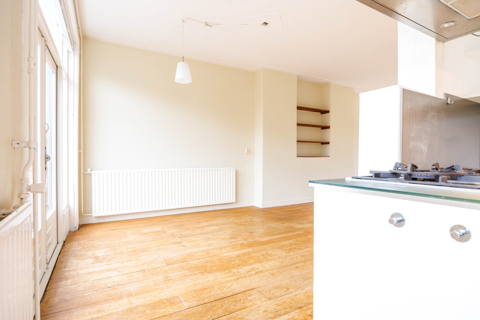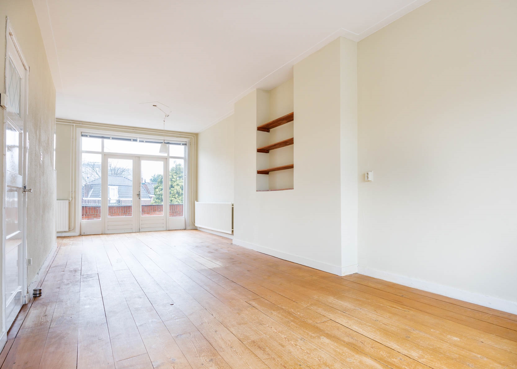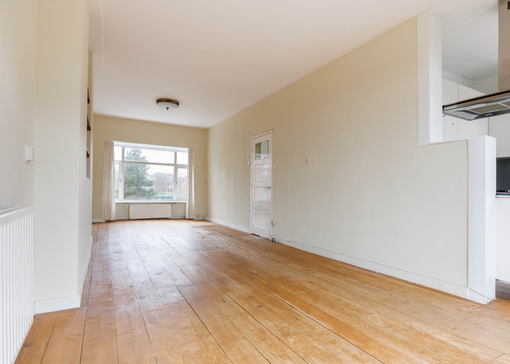 Toegang tot de riante woonkamer, over de hele lengte van het appartement, met prachtig vrij uitzicht aan de voorzijde op het doorgaande vaarwater van de Nieuwe Rijn. De woonkamer beschikt over een nis met boekenplanken, erkertje aan de voorzijde en openslaande deuren naar een breed balkon (8m2 gelegen op het Noordwesten) aan de achterzijde.