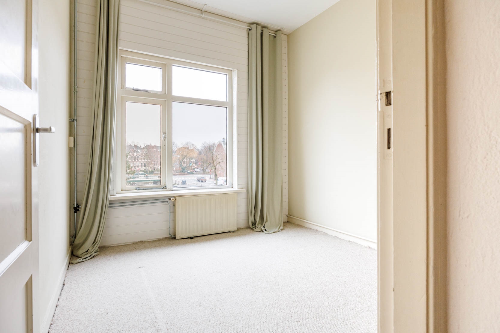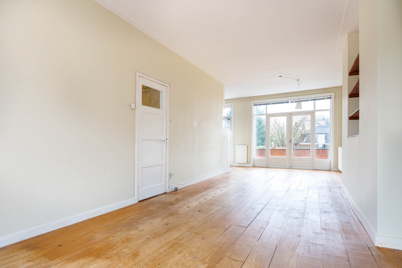 Access to the generous living room spanning the full length of the apartment, with stunning unobstructed views at the front over the continuously navigable waters of the Nieuwe Rijn. The living room features a niche with bookshelves, a bay window at the front, and French doors leading to a wide balcony (8 m², northwest-facing) at the rear.