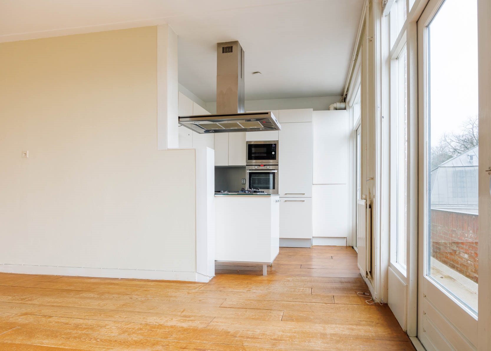Het gehele appartement is voorzien van een houten vloer, met uitzondering van de slaapkamer waar vloerbedekking ligt.
