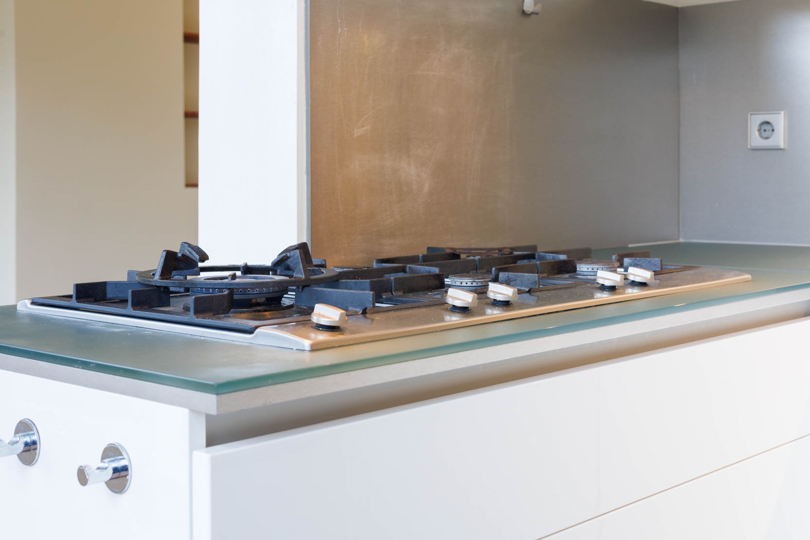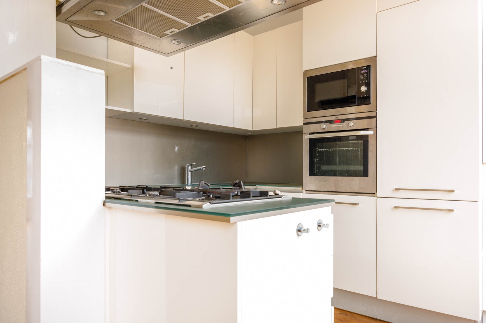 Aansluitend de halfopen keuken met diverse inbouwapparatuur, waaronder een combi-oven, oven, afzuigkap, koel/vriescombinatie, 5 pits gascomfort inclusief wokbrander en vaatwasser. Vanuit de keuken is het balkon tevens te bereiken via openslaande deuren.