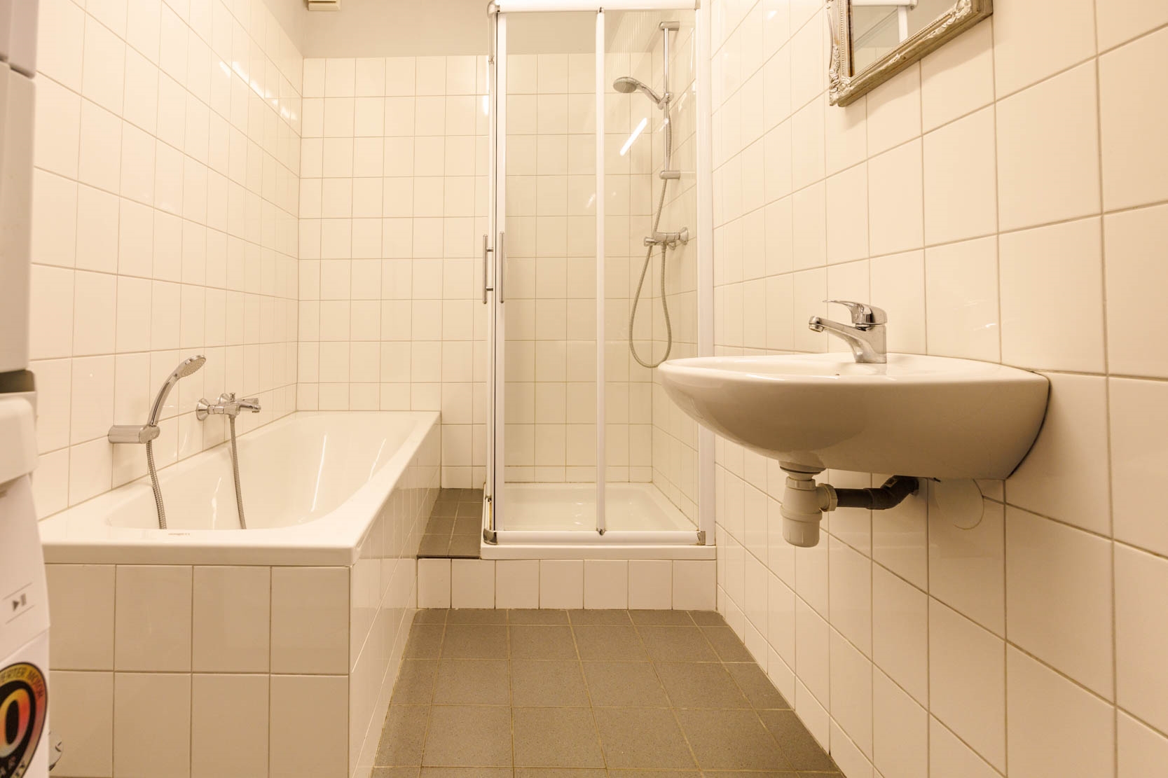 The bathroom is fitted with a bathtub, shower cabin, washbasin, and mechanical ventilation. The washing machine connection is also located here.