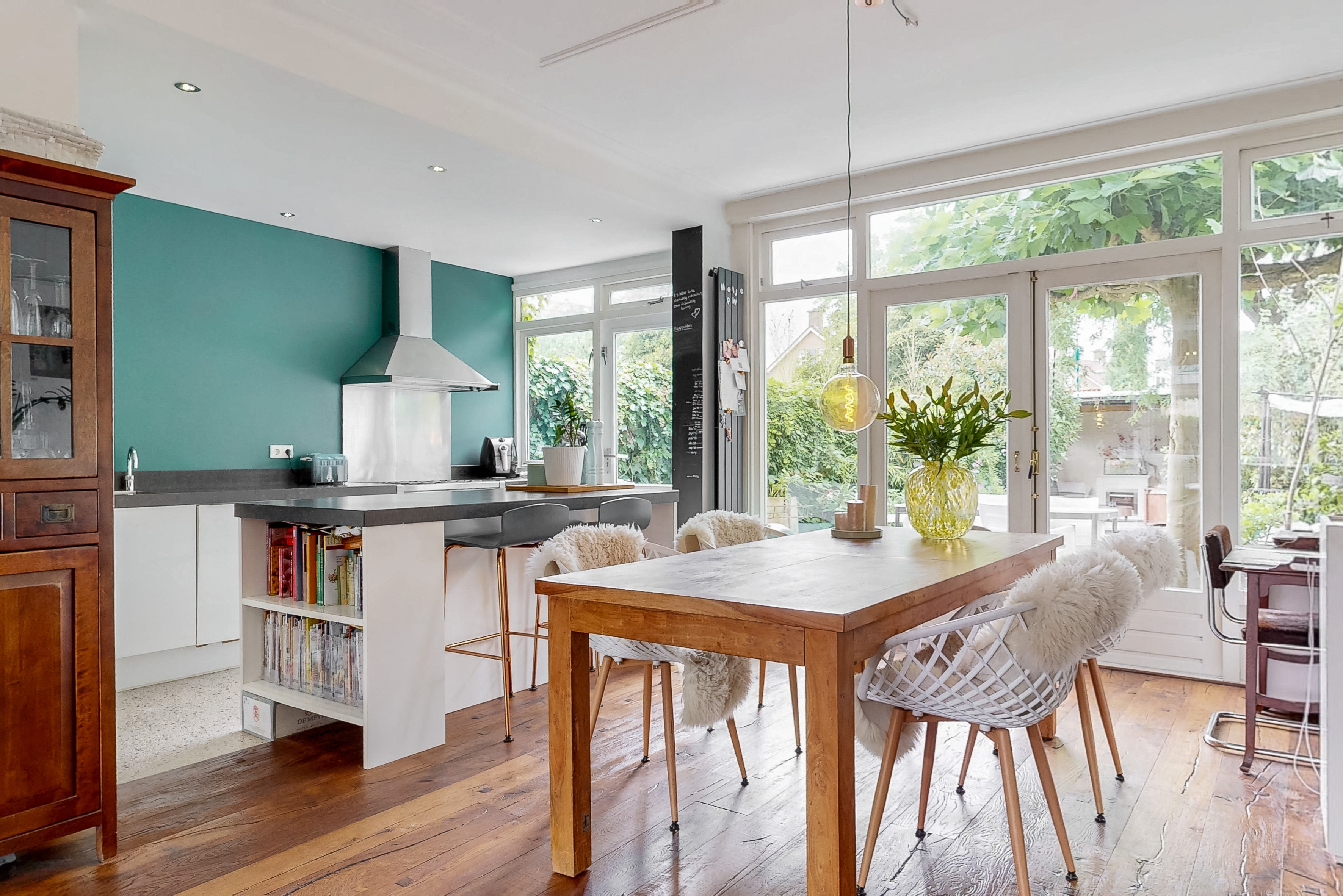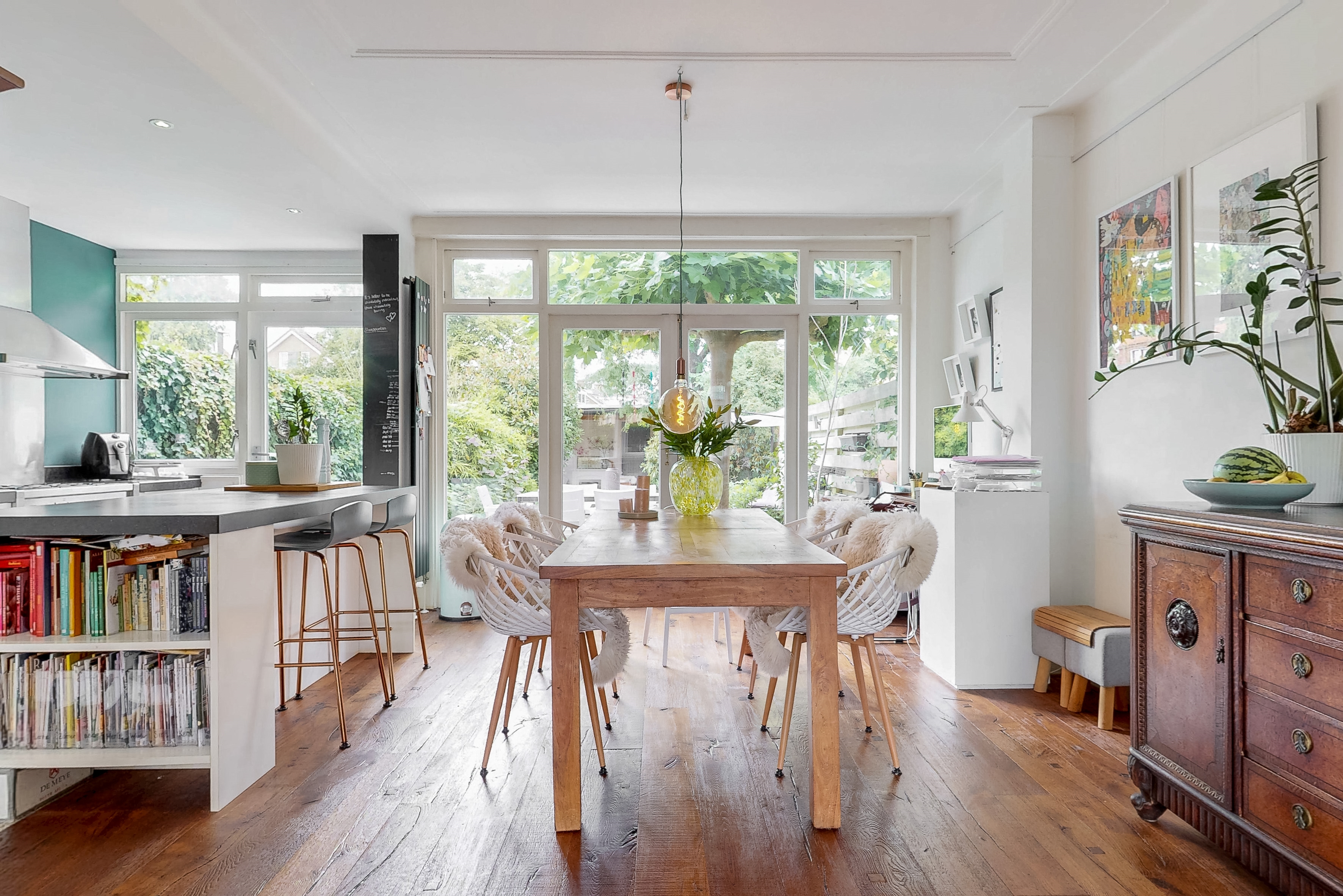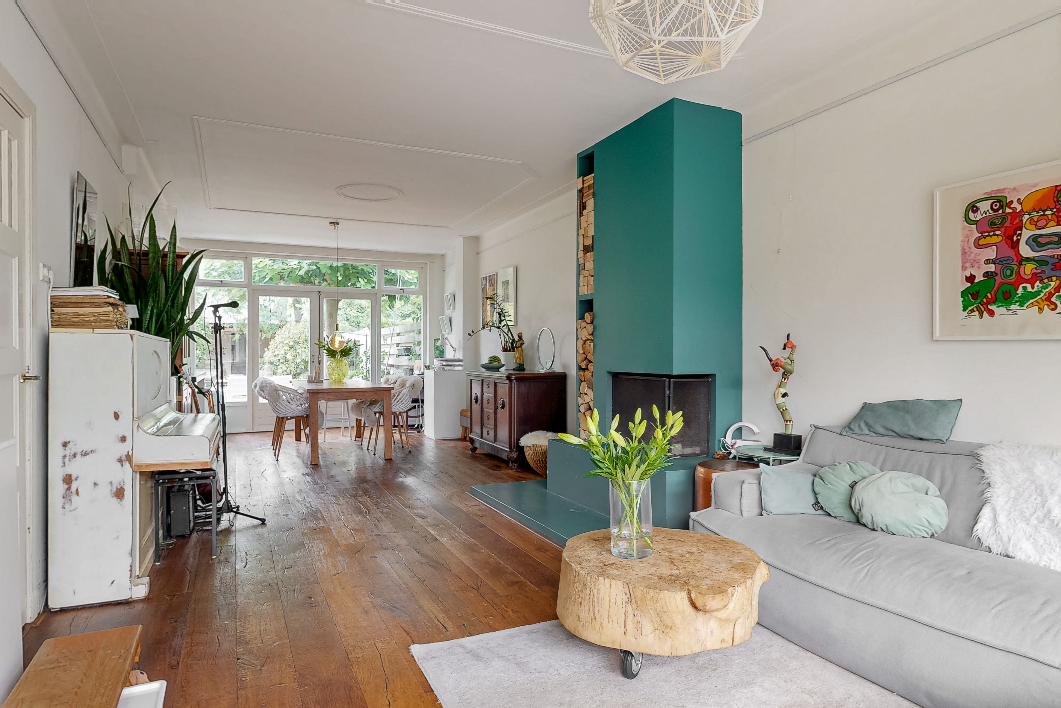 Through the spacious and sunny front garden you reach the vestibule with wardrobe, meter cupboard and characteristic stained glass windows. The hall gives access to the modern toilet, a practical stair cupboard and the spacious living room with open kitchen. The extended living room of approximately 40 m² is light and attractive, with a bay window, sleek plastered walls and ceilings with subtle mouldings, a beautiful wooden floor and a fireplace. The open kitchen with beautiful cooking island forms the heart of the house and is directly connected to the dining area. The kitchen is fully equipped with, among other things, a 6-burner gas stove with large oven, stainless steel extractor hood, dishwasher, refrigerator, Quooker and combination microwave.