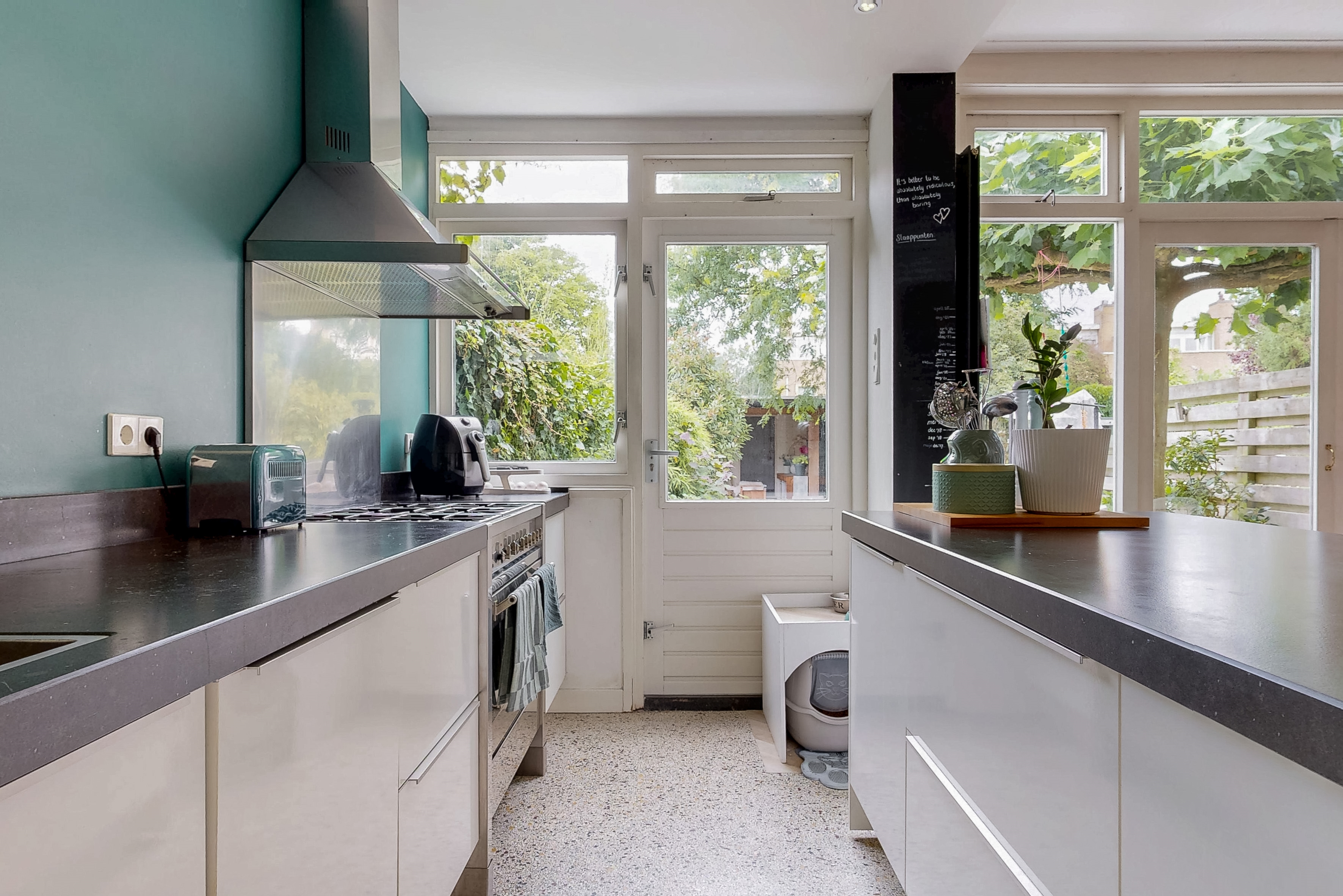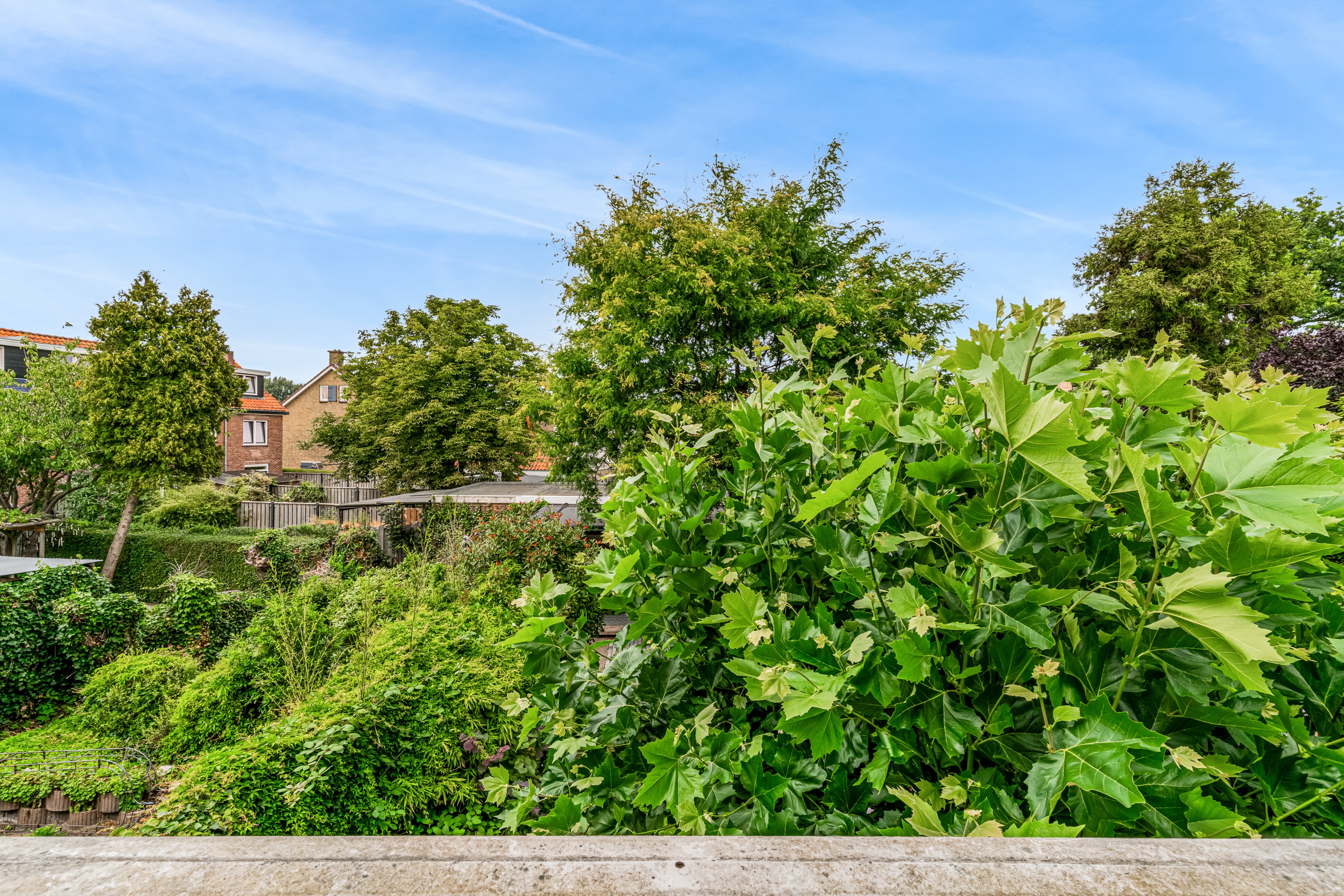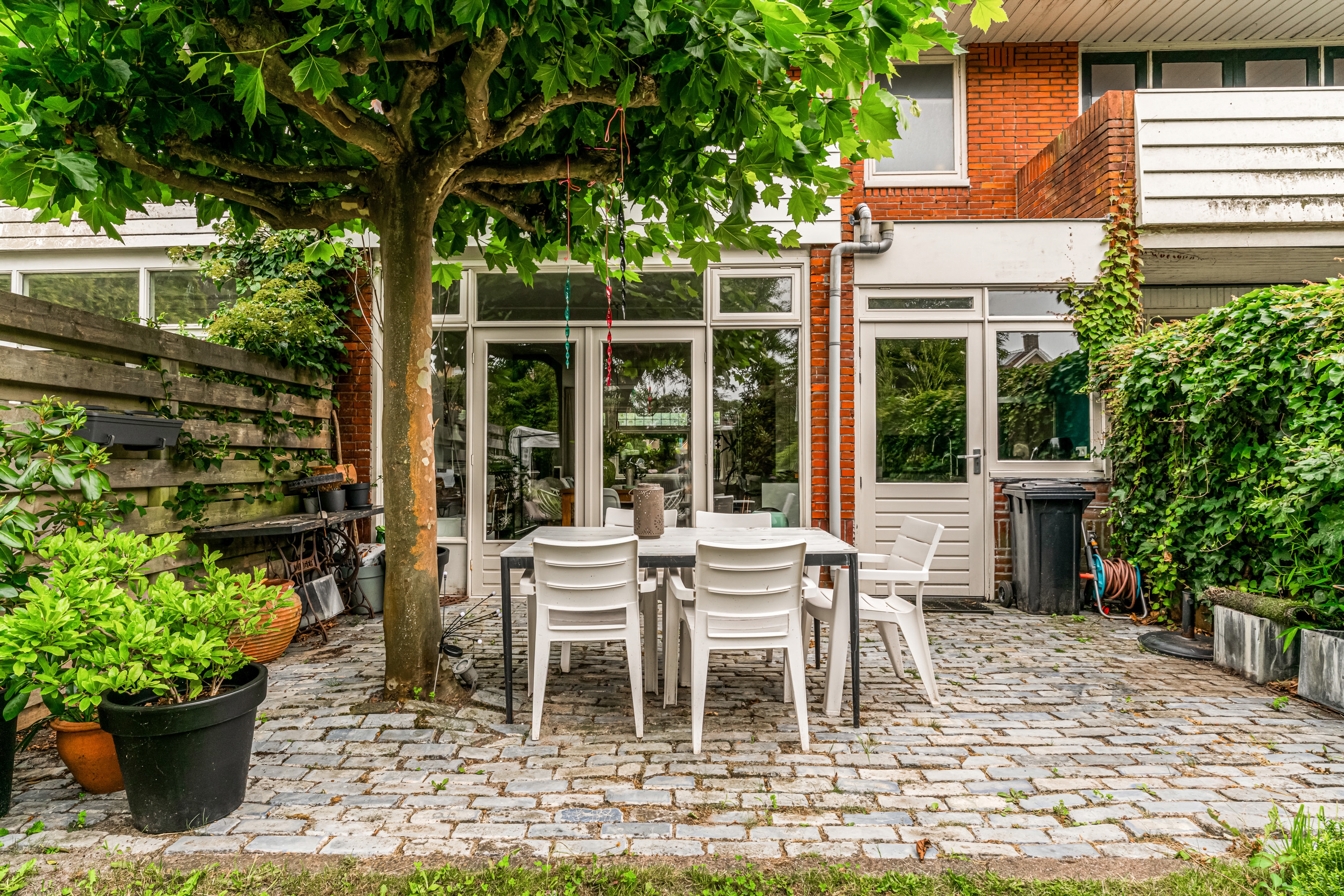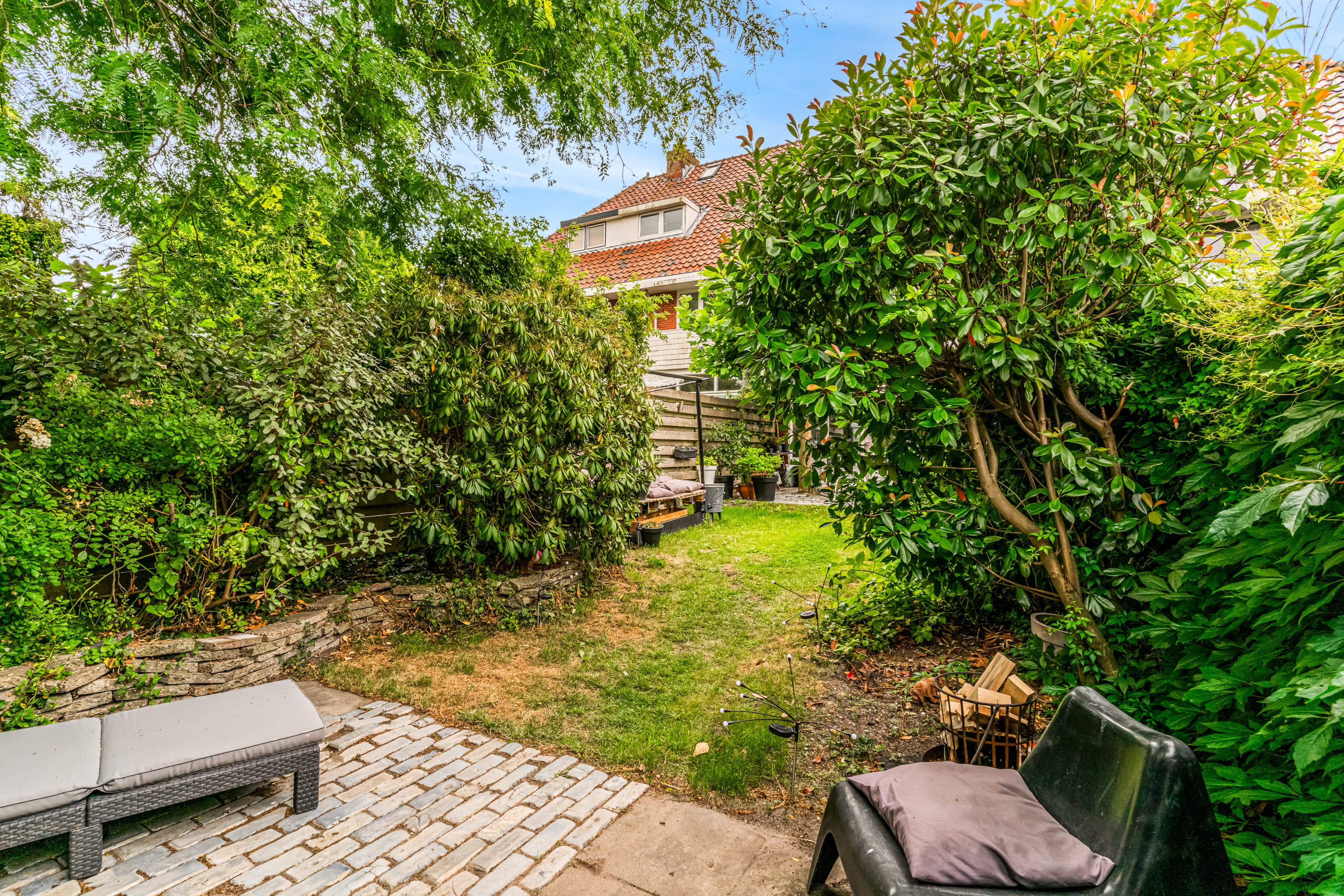 Through French doors or the kitchen door you reach the deep, northwest-facing backyard, approximately 14 meters deep, with a cozy canopy/veranda and storage room. A wonderful place to enjoy the outdoors all year round. From the roof there is also access to the separately offered garage.
