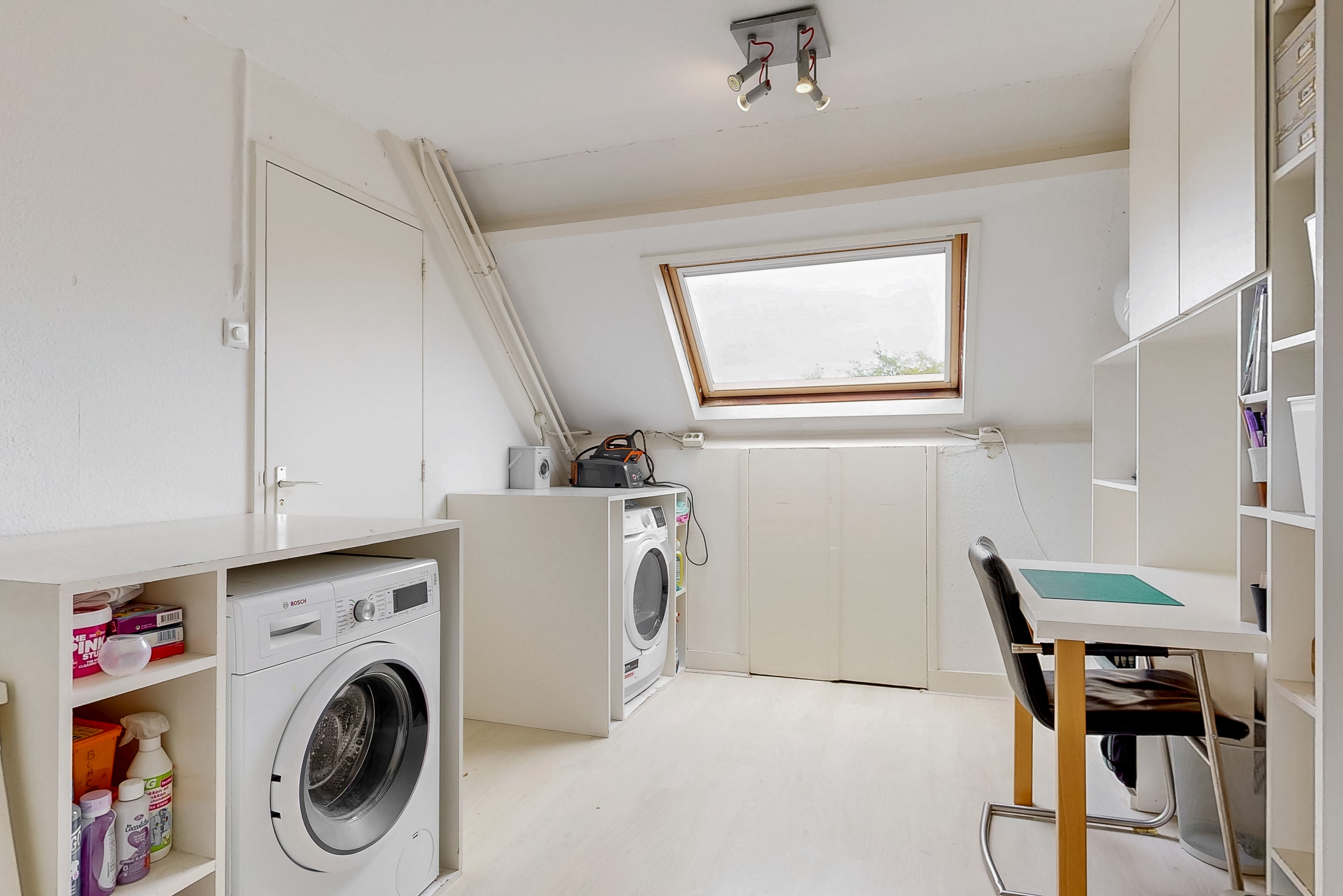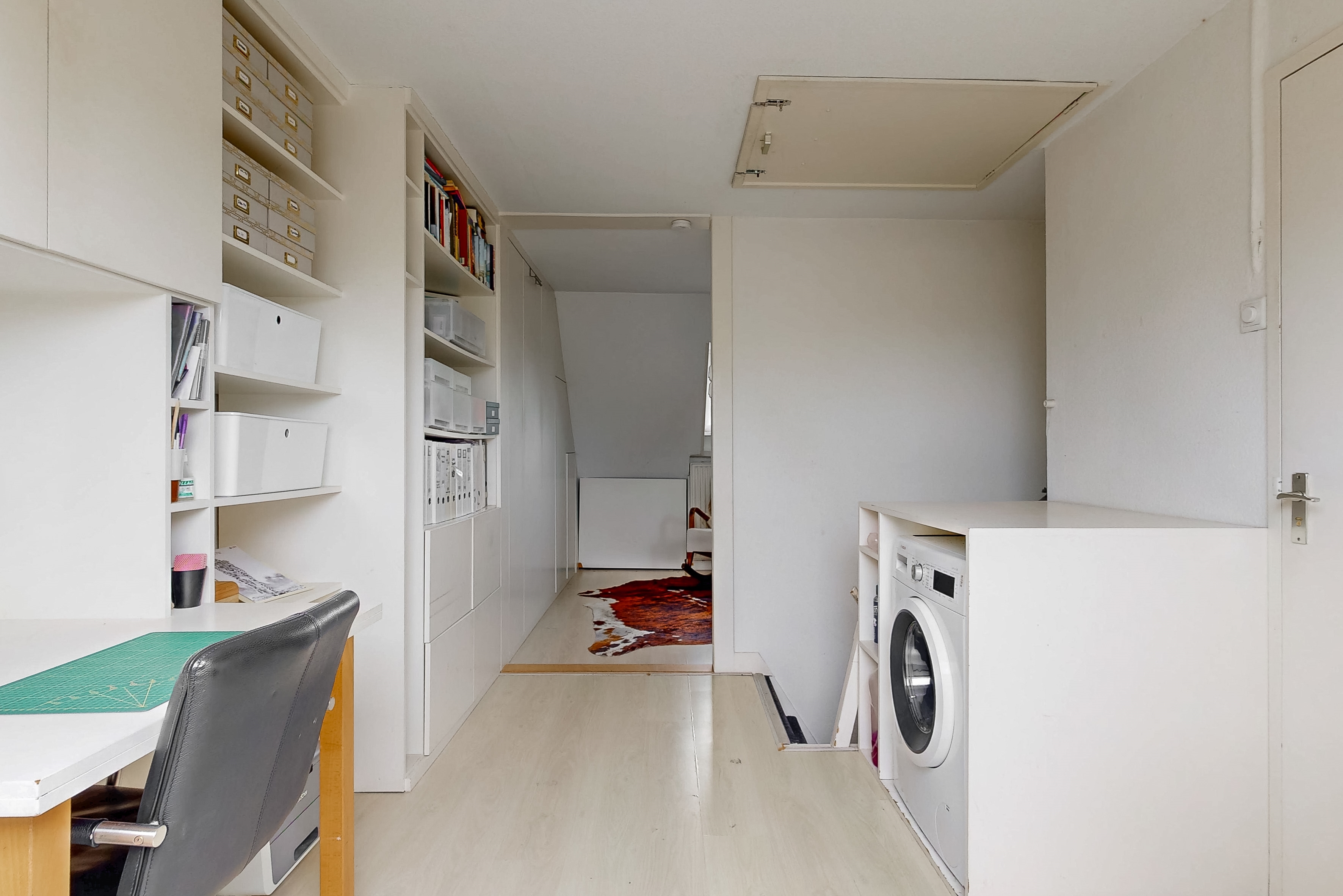 The staircase leads to a spacious landing with skylight, laundry room and a practical workplace with fixed cupboard wall. Here is also a spacious bedroom with dormer window and plenty of storage space. The second modern bathroom has daylight and is equipped with a third toilet, a spacious double bath, a walk-in shower, washbasin with mirror cabinet and design radiator. The spacious attic is accessible via a loft ladder.