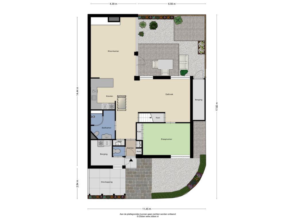 – Houten berging en overkapping aan de voorzijde