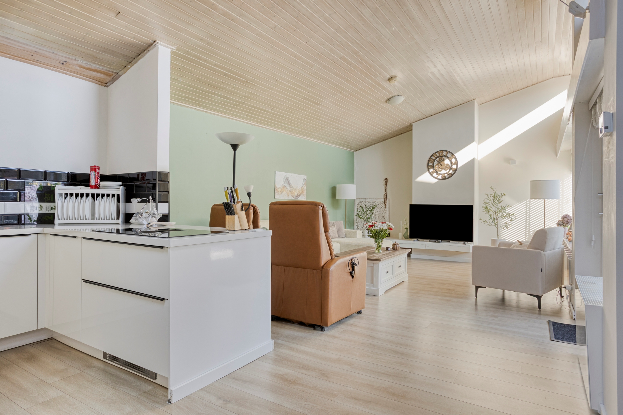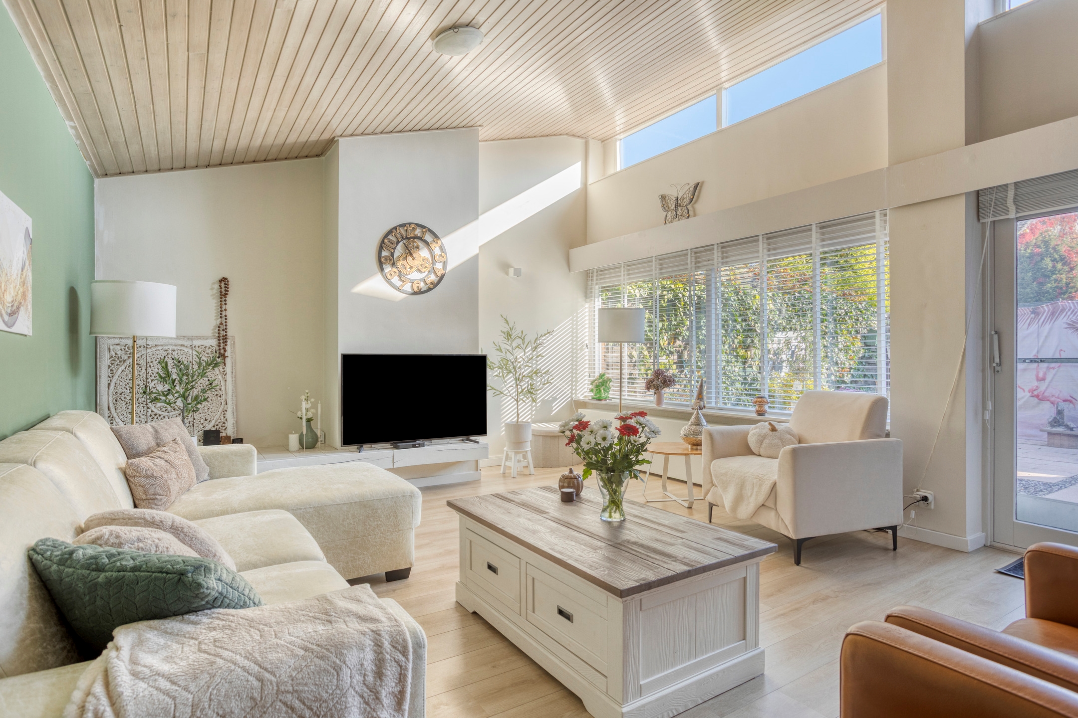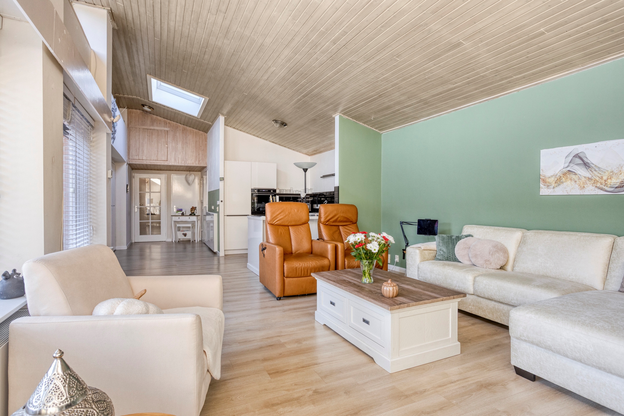 Zodra je binnenstapt, valt het heerlijke natuurlijke licht op dat via de grote raampartijen binnenstroomt. De woonkamer is ruim opgezet, met een prettige indeling en een directe verbinding met de tuin – ideaal voor wie graag binnen en buiten laat samenkomen.