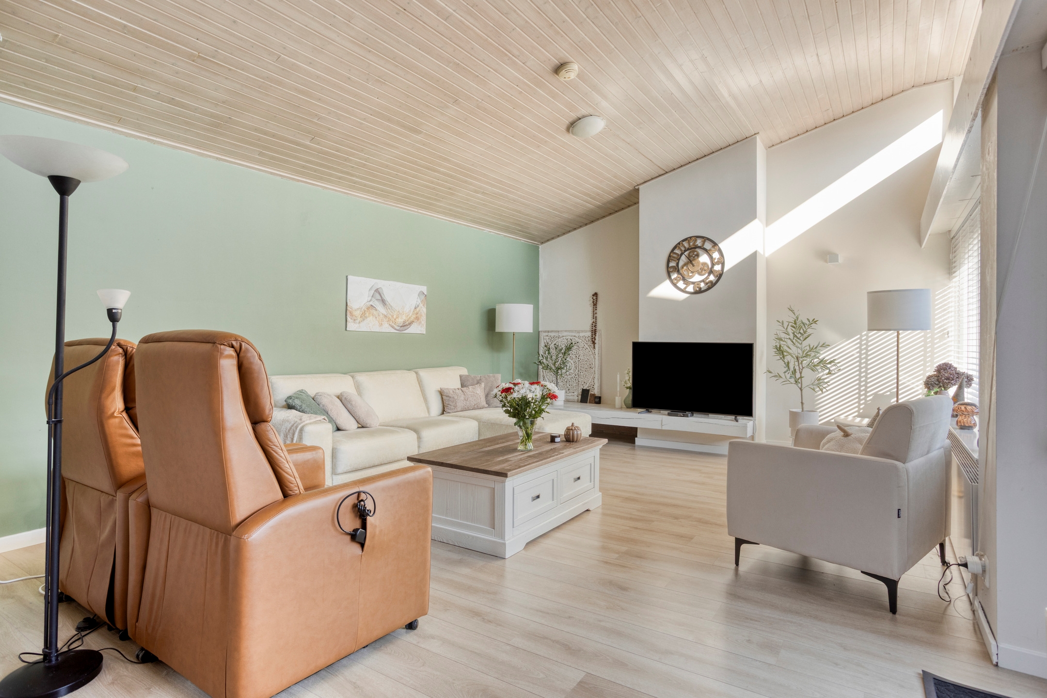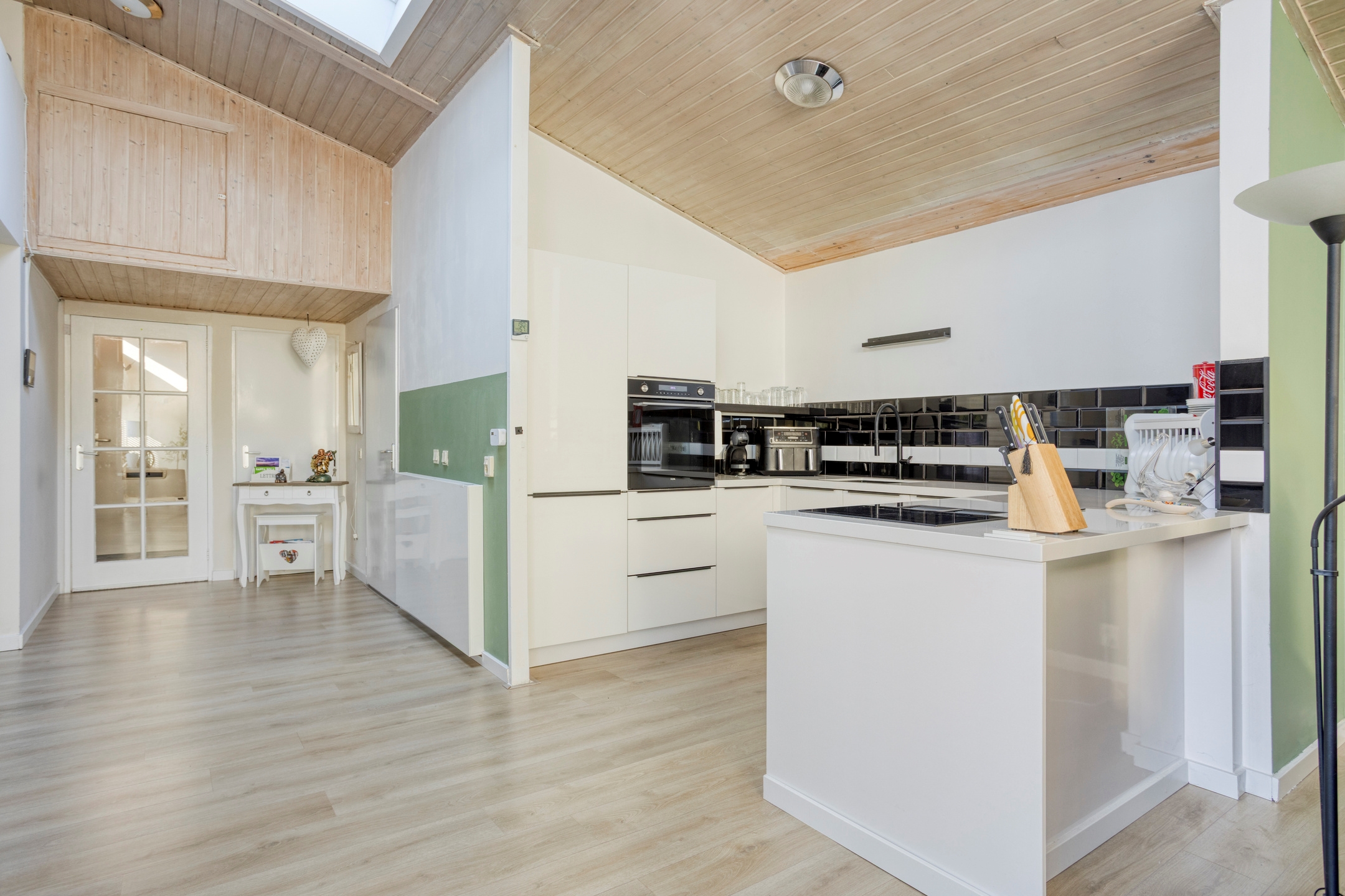 Smooth plastered walls, modern laminate flooring, and neutral tones create a calm and contemporary atmosphere. Thanks to the air conditioning, the home stays pleasantly cool in summer and comfortably warm in winter.