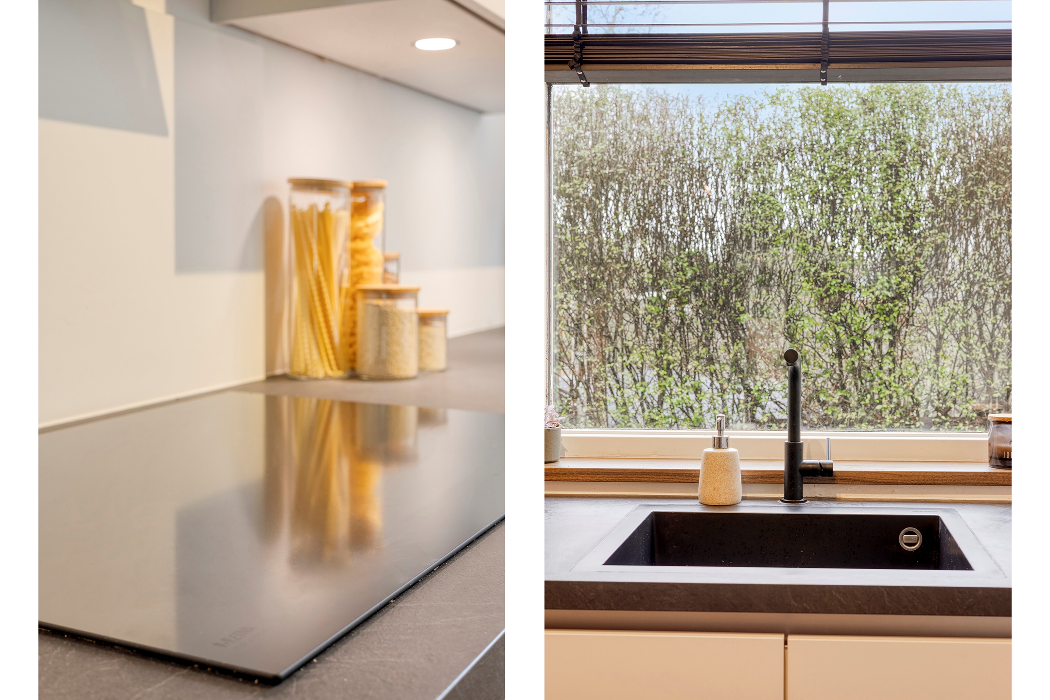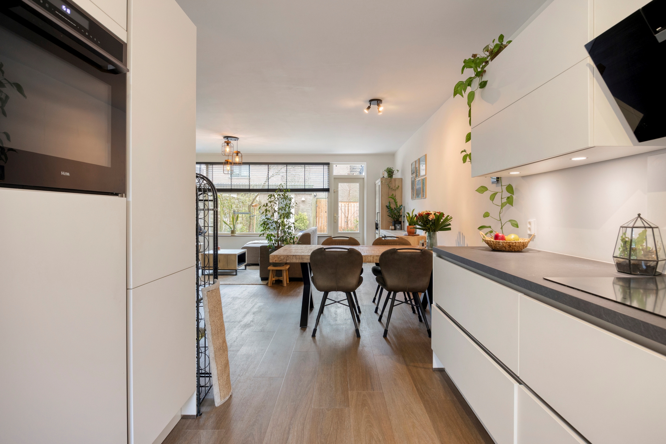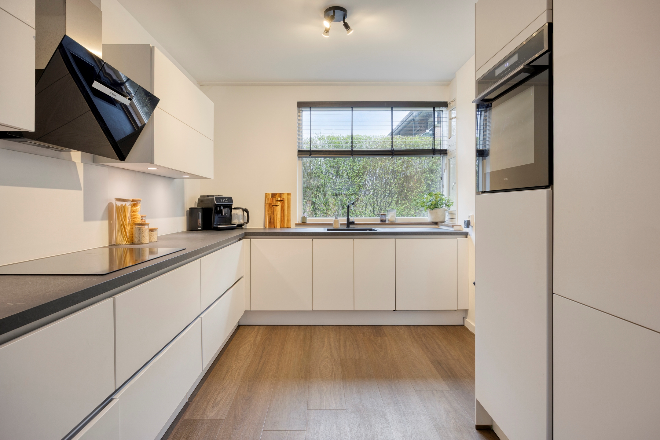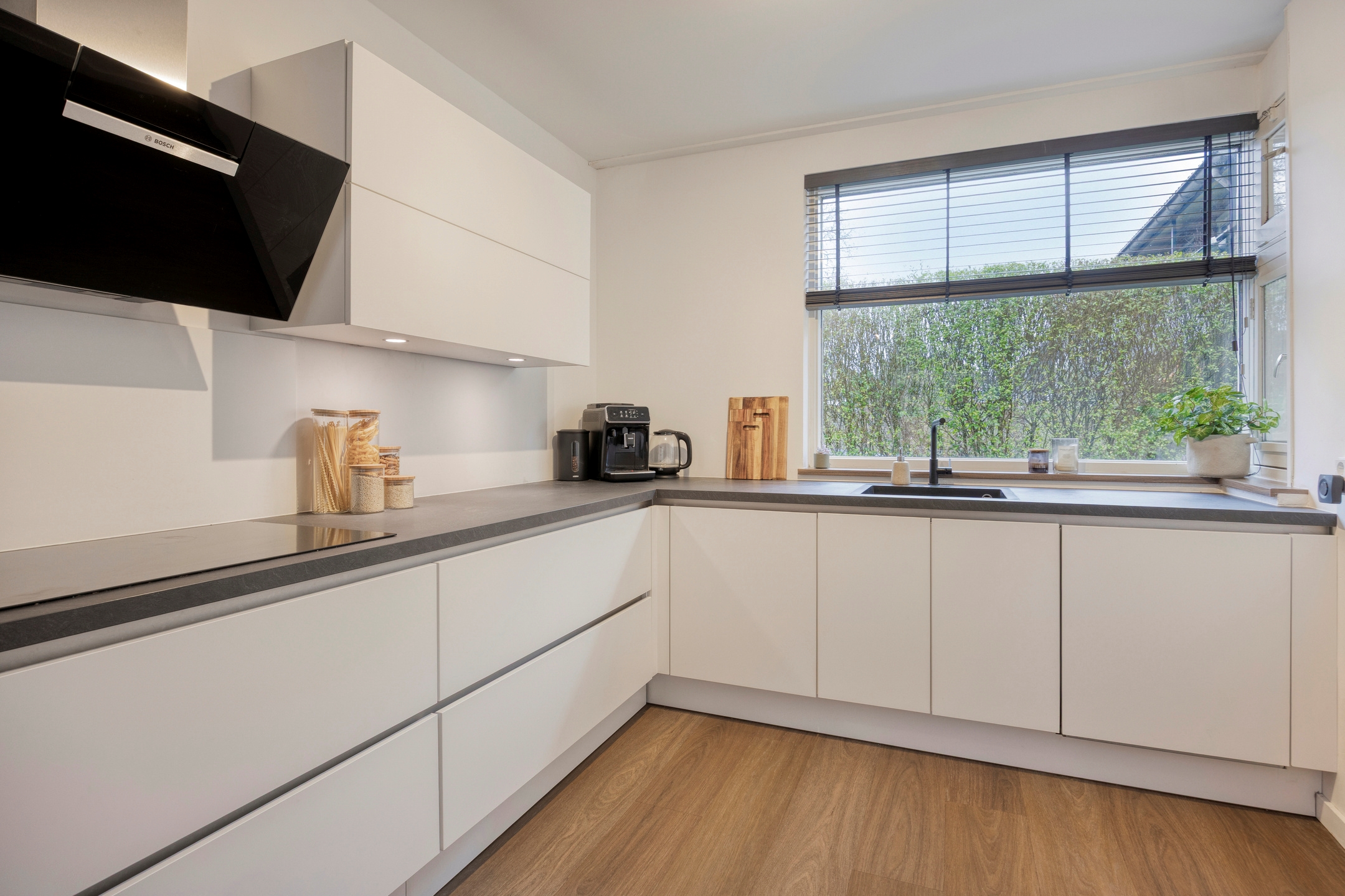 Entree met hal, garderoberuimte en trapopgang. In de hal bevindt zich een modern toilet met fonteintje. De woonkamer is ruim, licht en prettig ingedeeld, met meer dan genoeg ruimte voor een comfortabele zithoek en een royale eettafel. De strakke afwerking en rustige kleurstelling zorgen voor een fijne, ontspannen sfeer. Aan de voorzijde van de woning bevindt zich de grote open keuken, opgesteld in een praktische L-vorm. Deze keuken is na 2022 vernieuwd en voorzien van diverse inbouwapparatuur, met veel werk- en bergruimte. Een fijne plek om te koken, met goed overzicht en een verzorgde uitstraling die naadloos aansluit bij de rest van de woning. Via de woonkamer is de zonnige achtertuin op het zuiden bereikbaar. Deze biedt volop rust en zon en is voorzien van een schuur en een achterom.