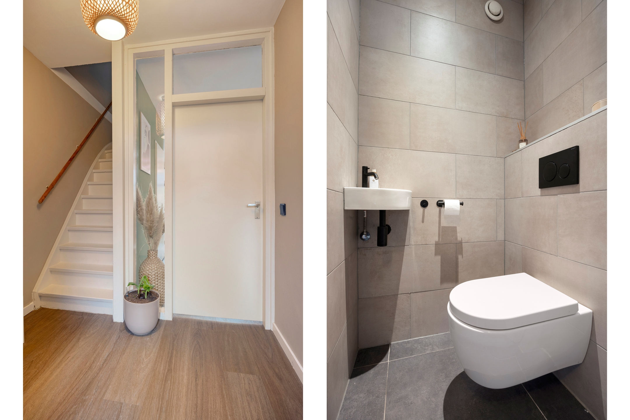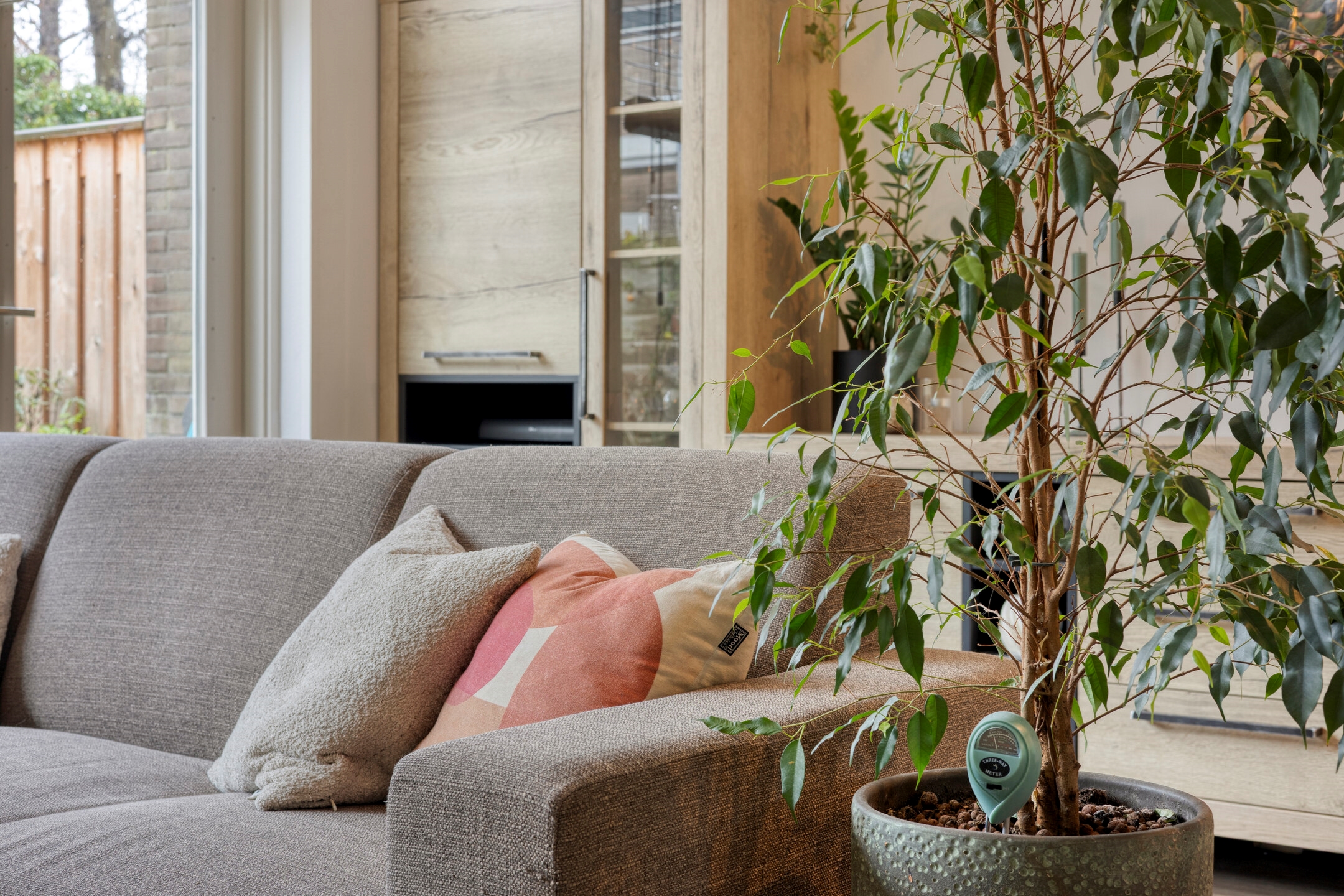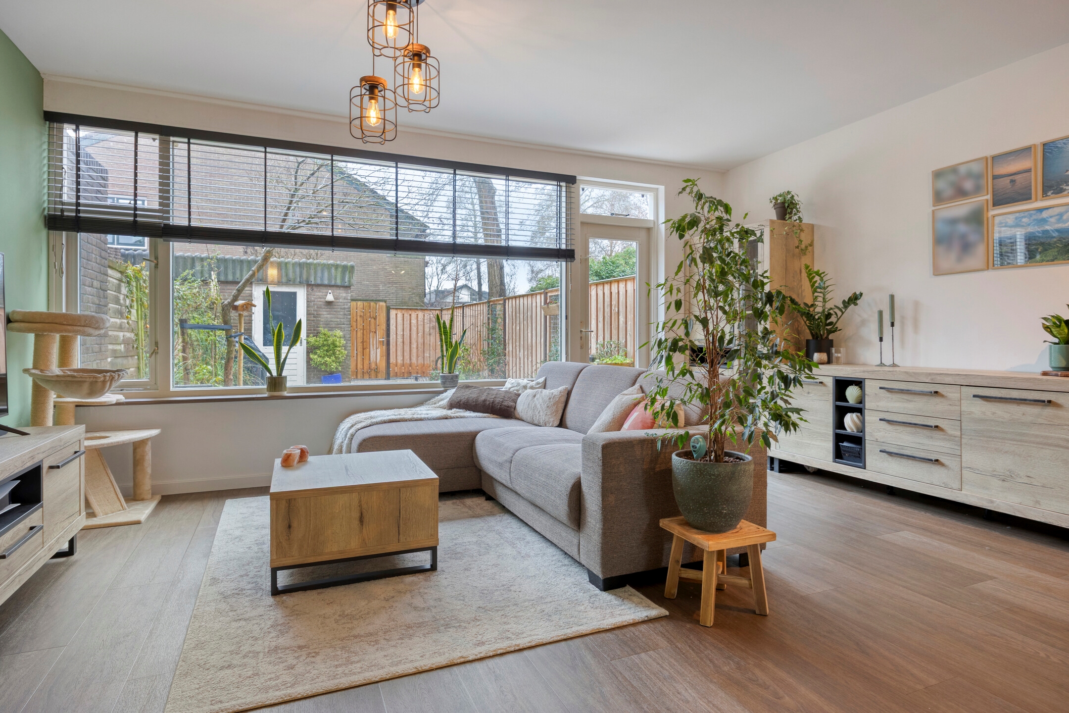 Entree met hal, garderoberuimte en trapopgang. In de hal bevindt zich een modern toilet met fonteintje. De woonkamer is ruim, licht en prettig ingedeeld, met meer dan genoeg ruimte voor een comfortabele zithoek en een royale eettafel. De strakke afwerking en rustige kleurstelling zorgen voor een fijne, ontspannen sfeer. Aan de voorzijde van de woning bevindt zich de grote open keuken, opgesteld in een praktische L-vorm. Deze keuken is na 2022 vernieuwd en voorzien van diverse inbouwapparatuur, met veel werk- en bergruimte. Een fijne plek om te koken, met goed overzicht en een verzorgde uitstraling die naadloos aansluit bij de rest van de woning. Via de woonkamer is de zonnige achtertuin op het zuiden bereikbaar. Deze biedt volop rust en zon en is voorzien van een schuur en een achterom.