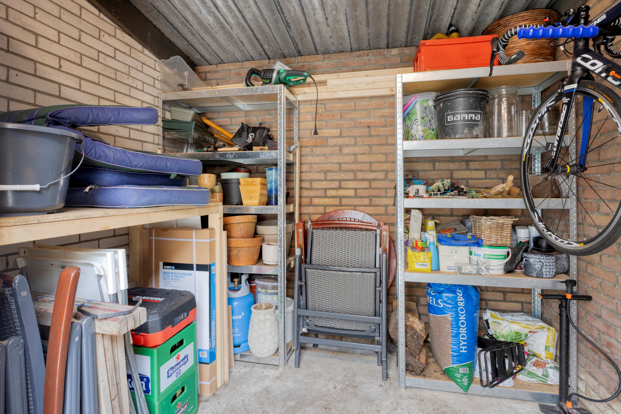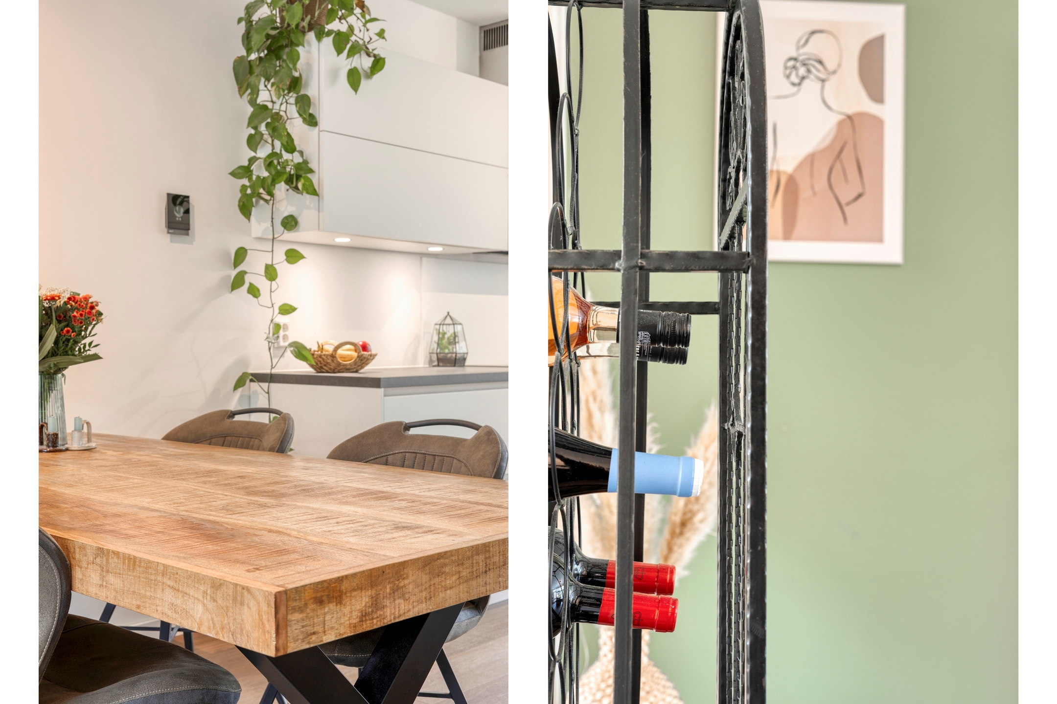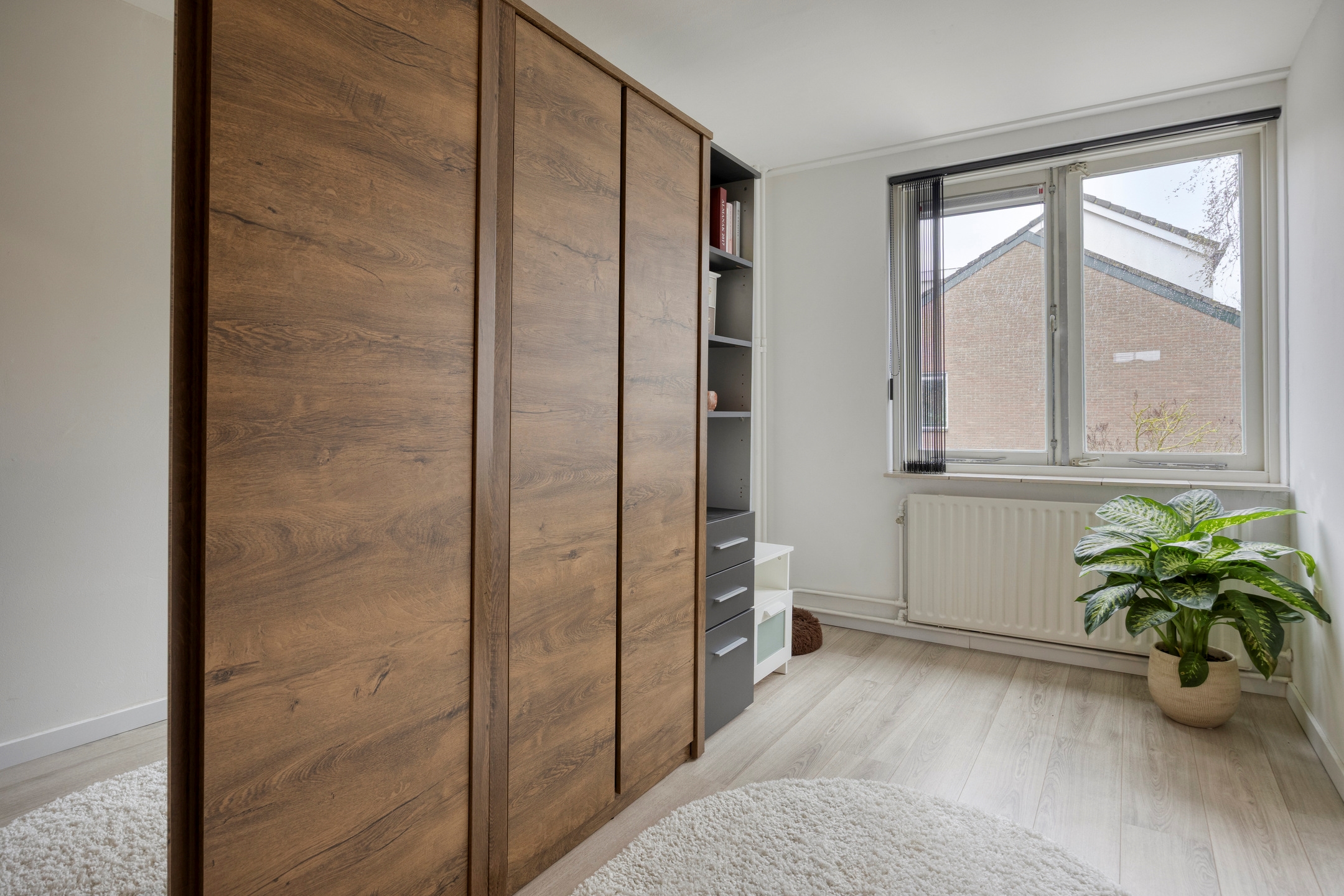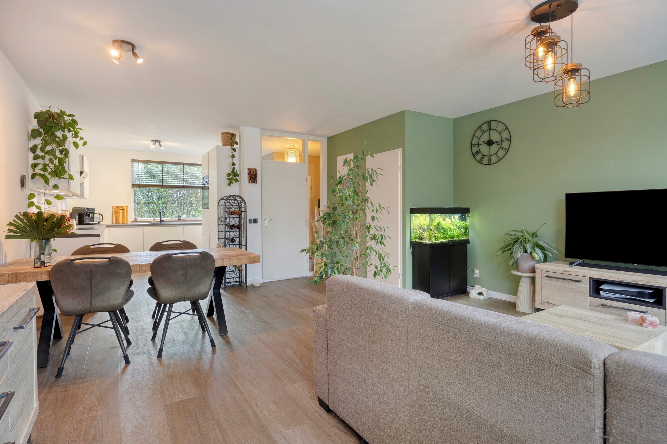 Entree met hal, garderoberuimte en trapopgang. In de hal bevindt zich een modern toilet met fonteintje. De woonkamer is ruim, licht en prettig ingedeeld, met meer dan genoeg ruimte voor een comfortabele zithoek en een royale eettafel. De strakke afwerking en rustige kleurstelling zorgen voor een fijne, ontspannen sfeer. Aan de voorzijde van de woning bevindt zich de grote open keuken, opgesteld in een praktische L-vorm. Deze keuken is na 2022 vernieuwd en voorzien van diverse inbouwapparatuur, met veel werk- en bergruimte. Een fijne plek om te koken, met goed overzicht en een verzorgde uitstraling die naadloos aansluit bij de rest van de woning. Via de woonkamer is de zonnige achtertuin op het zuiden bereikbaar. Deze biedt volop rust en zon en is voorzien van een schuur en een achterom.