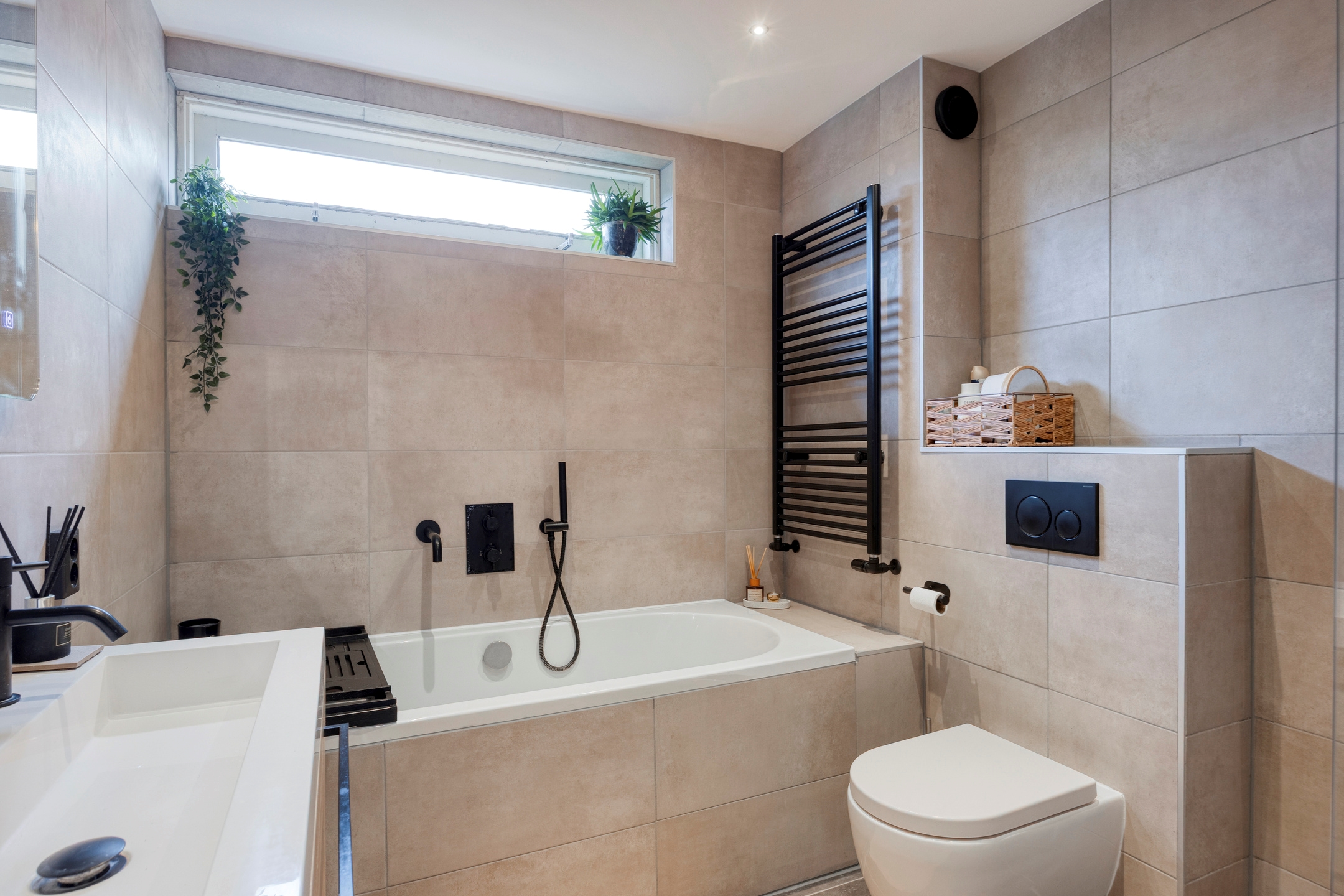 Overloop met toegang tot drie ruime slaapkamers en de badkamer. Alle slaapkamers zijn netjes afgewerkt en direct in te richten. De luxe badkamer is na 2022 volledig vernieuwd. Deze beschikt over een diep ligbad, een ruime inloopdouche, dubbele wasbak, modern sanitair en een verzorgde afwerking.