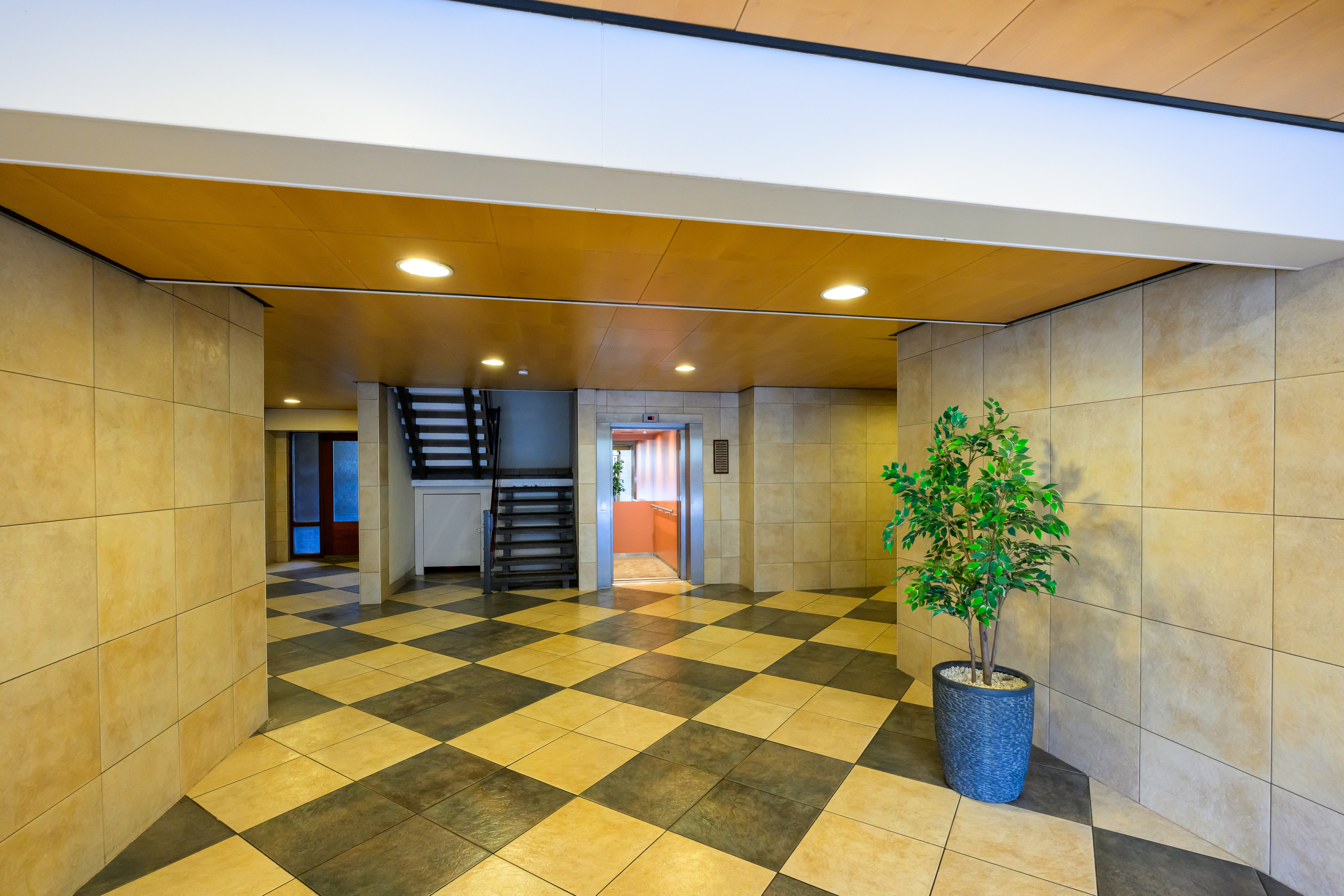 Afgesloten entree met brievenbussen, intercom en toegang tot de lift en het trappenhuis. Tevens toegang tot de eigen berging met elektra.