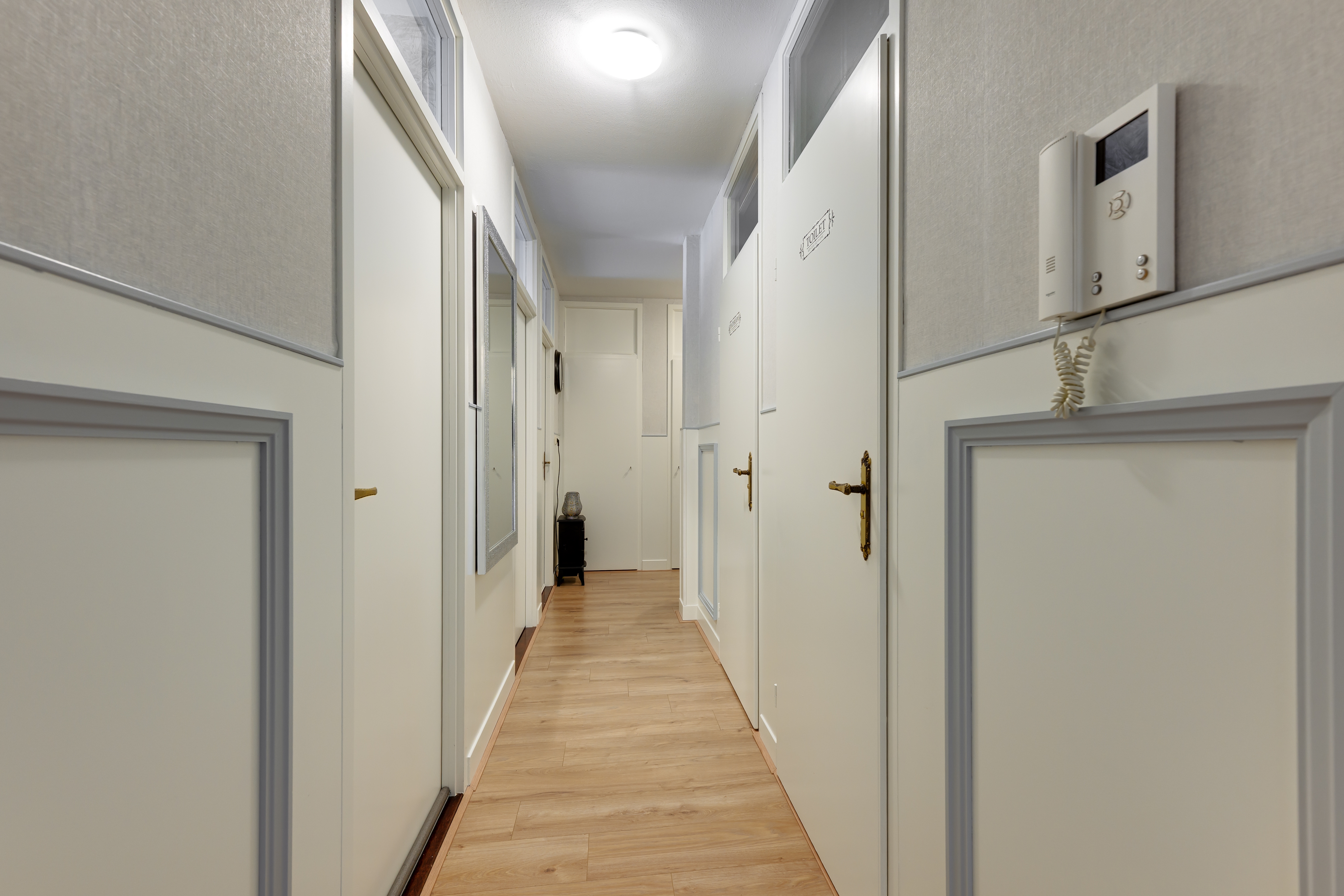 Entree appartement. Ruime hal met meterkast en praktische bergkasten. Vanuit de hal zijn alle vertrekken bereikbaar.