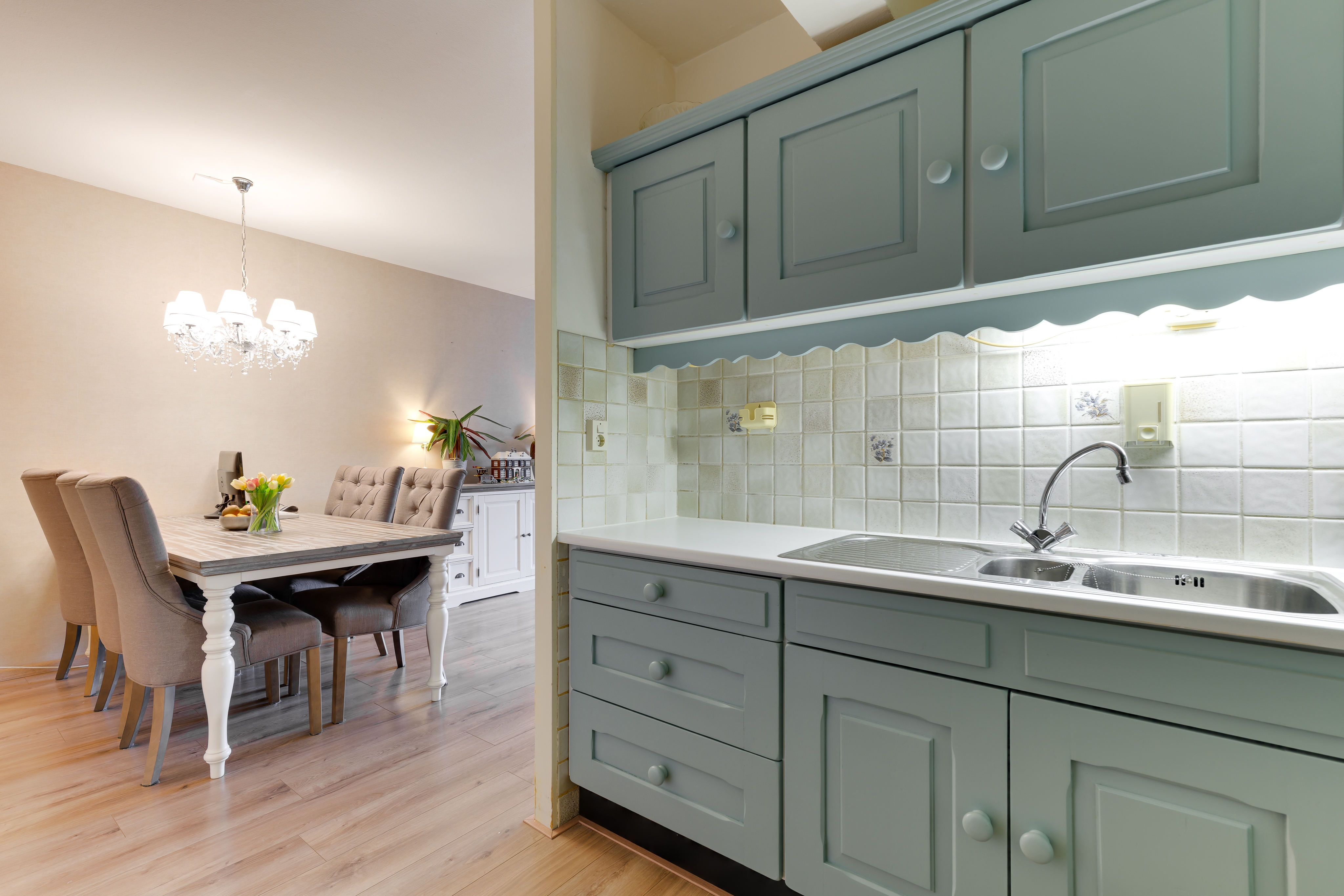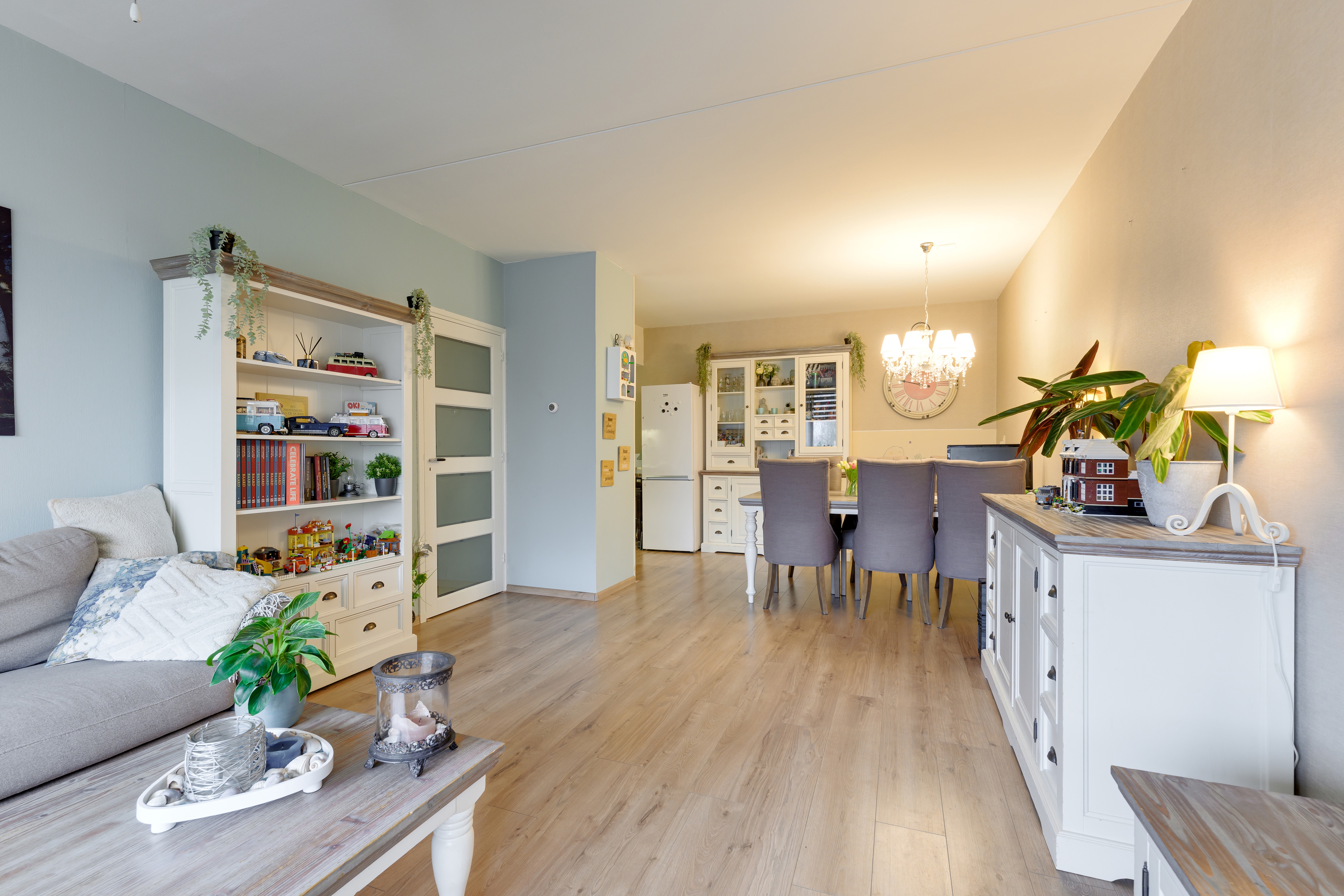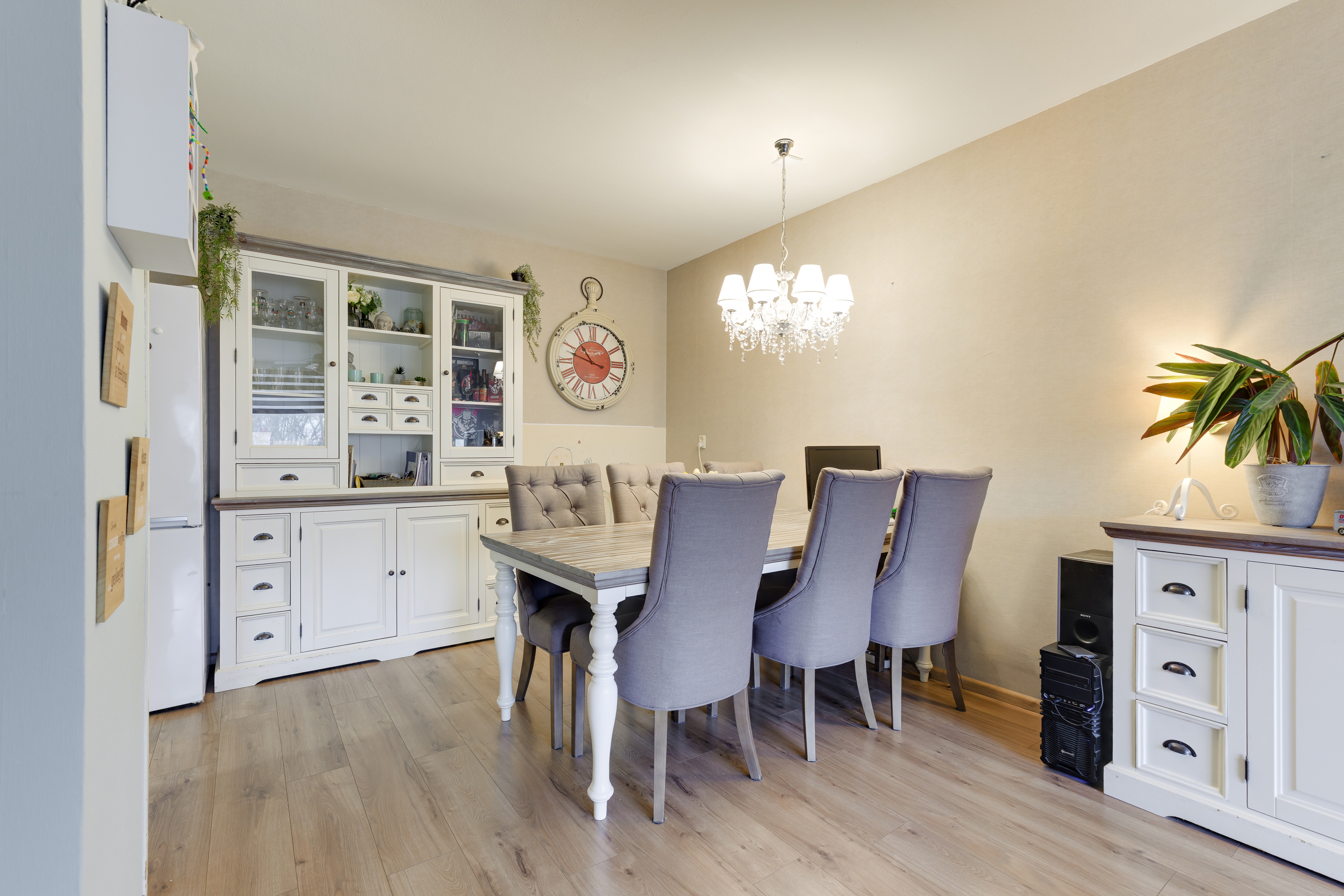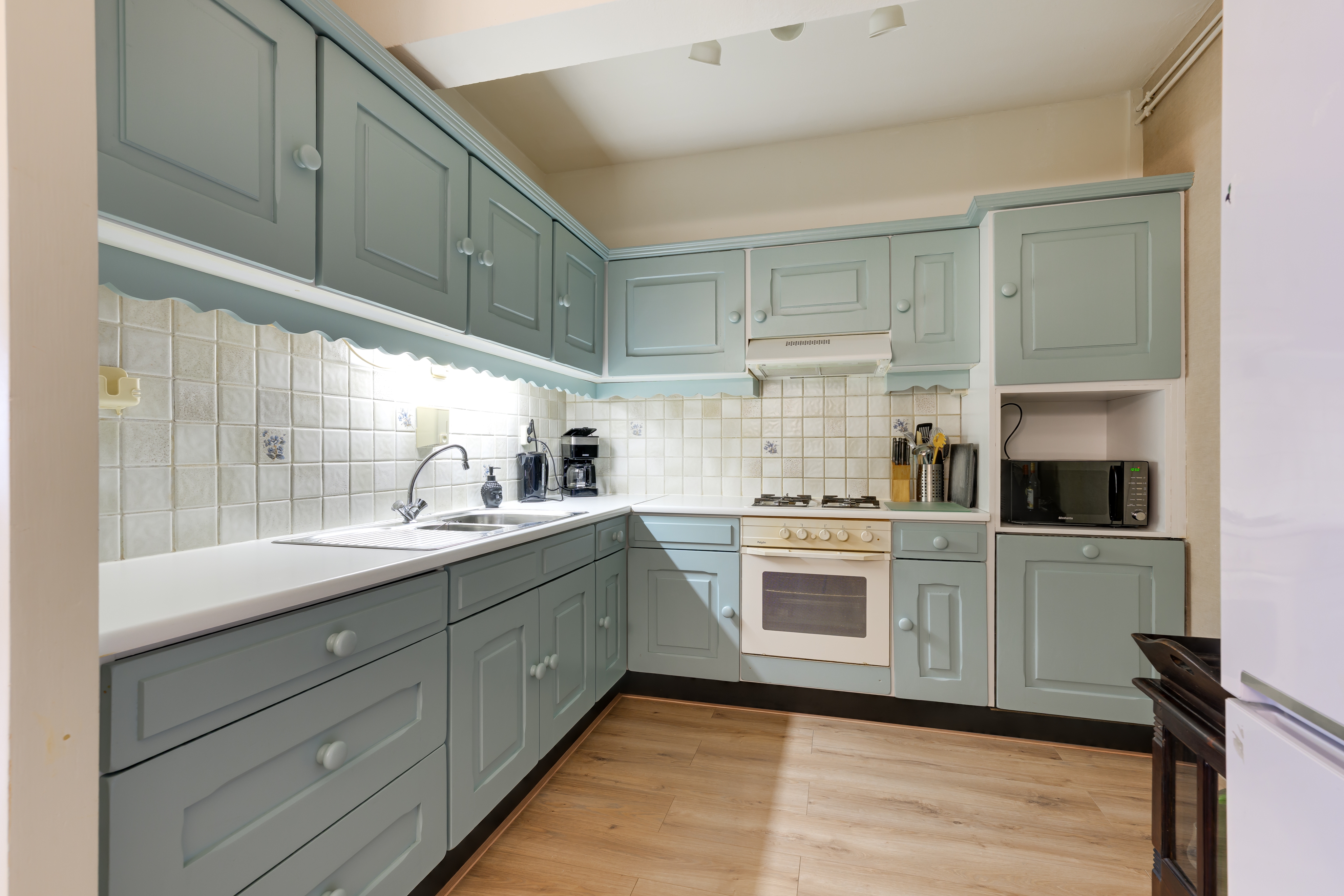 De royale woonkamer is licht en biedt een prachtig vrij uitzicht over de omgeving. De halfopen keuken is uitgevoerd in een hoekopstelling en voorzien van een gaskookplaat, afzuigkap, oven, vaatwasser, dubbele spoelbak en losse koel-vriescombinatie.