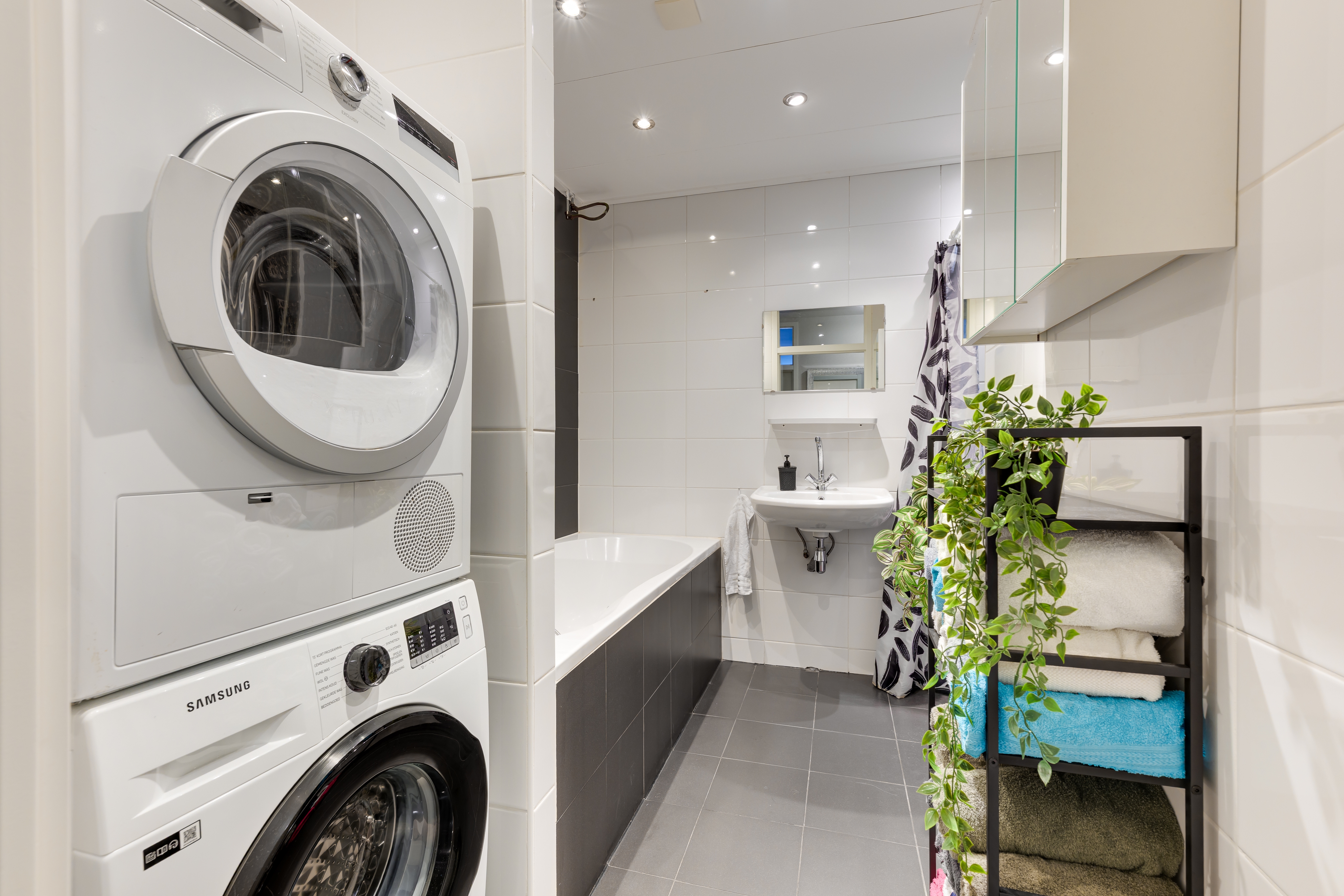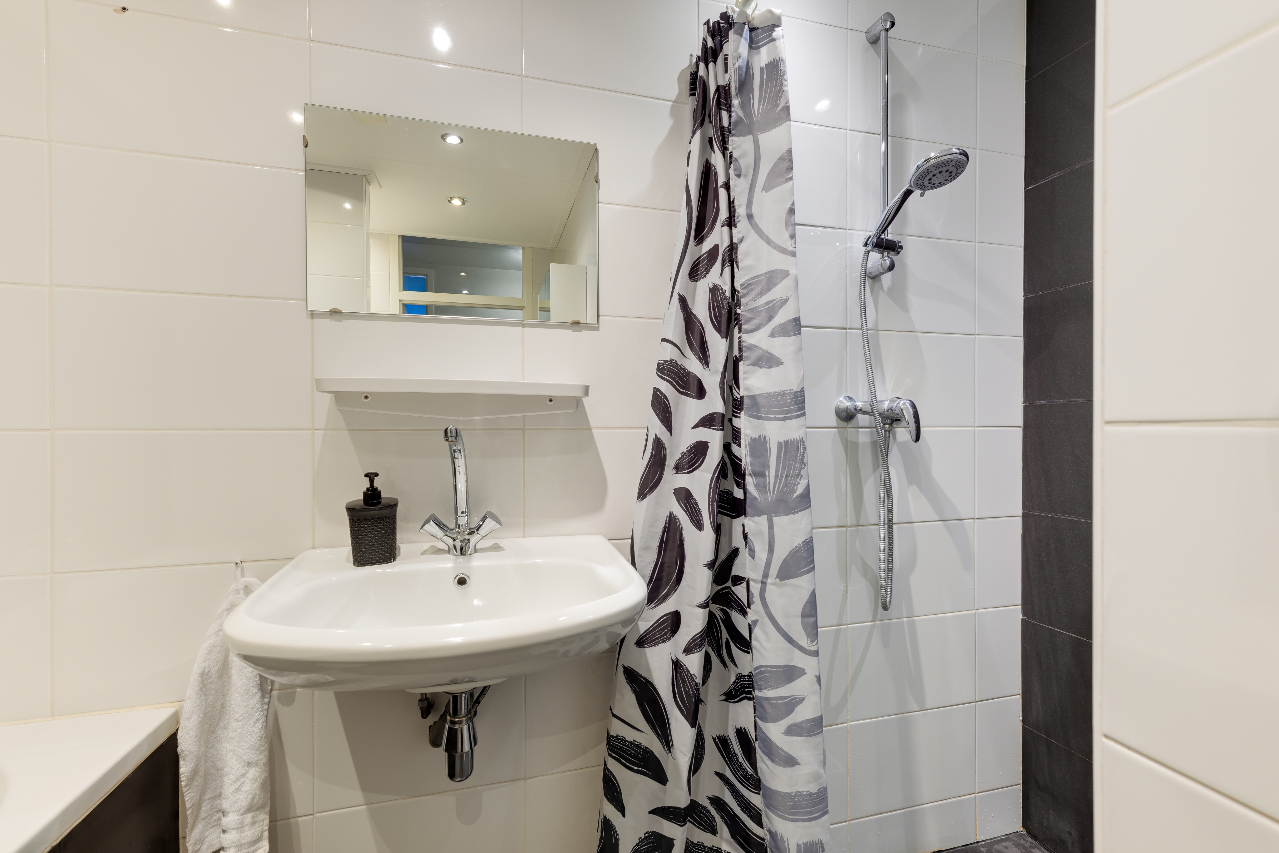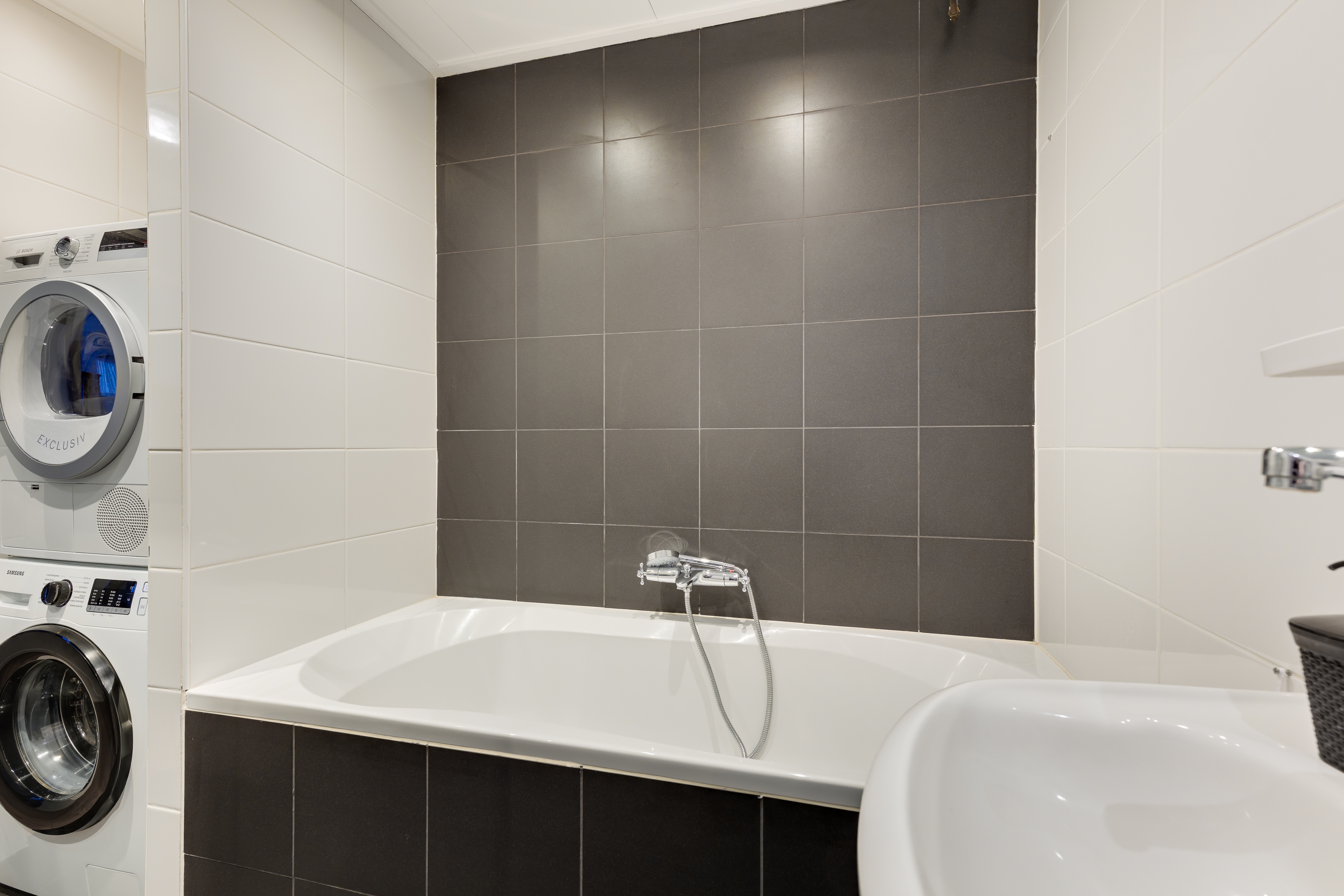 De badkamer is voorzien van een inloopdouche, bad, wastafel en aansluiting voor de wasmachine. Er is een separaat toilet met fonteintje.
