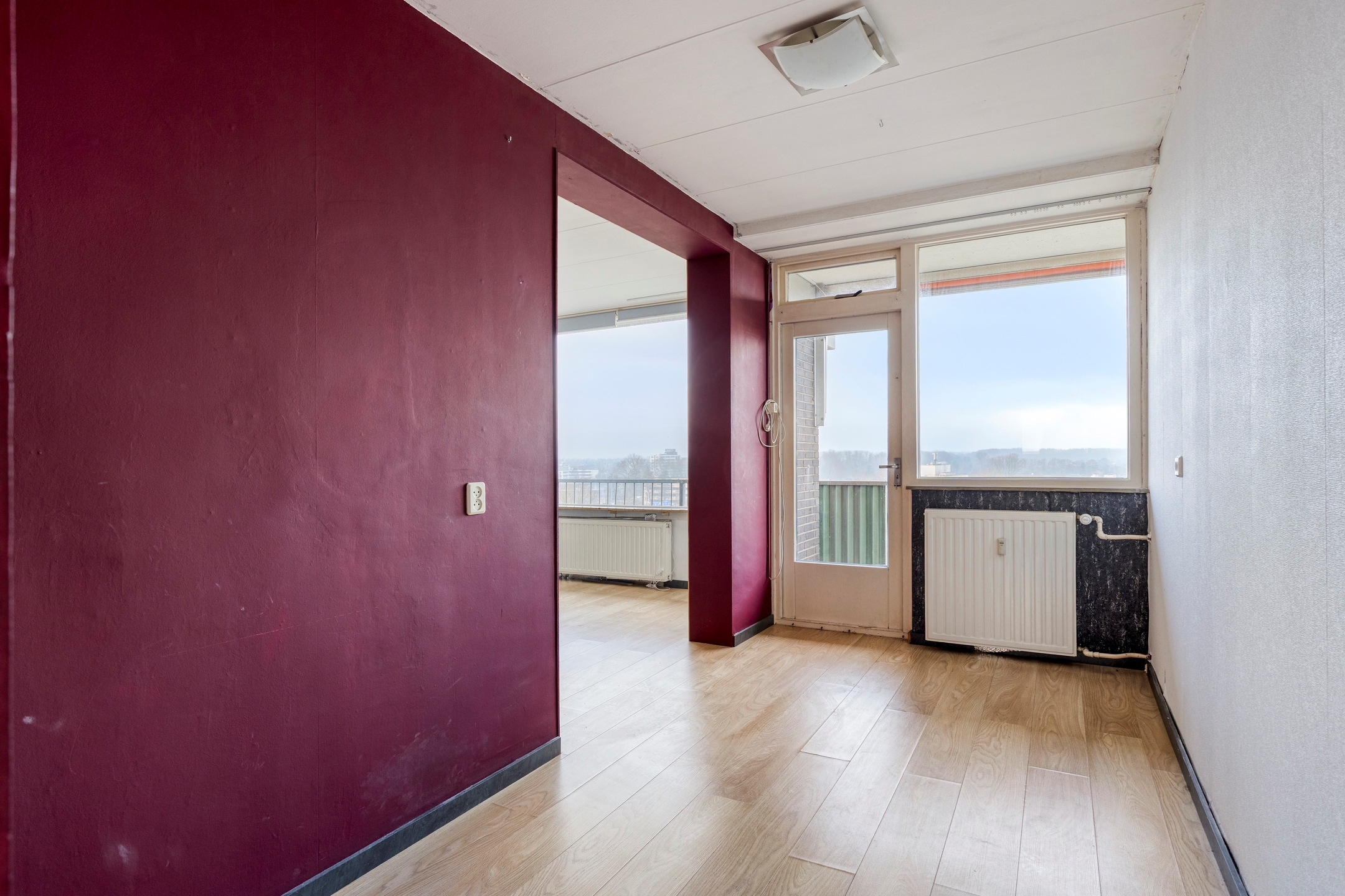 Het balkon strekt zich over de achterzijde van de woning en is toegankelijk vanuit de woonkamer, waardoor u heerlijk kunt genieten van de zon, het uitzicht en de frisse lucht. Door de ligging op de 10e etage ervaart u een gevoel van ruimte en vrijheid, met een schitterend panorama over de stad en het omliggende groen.