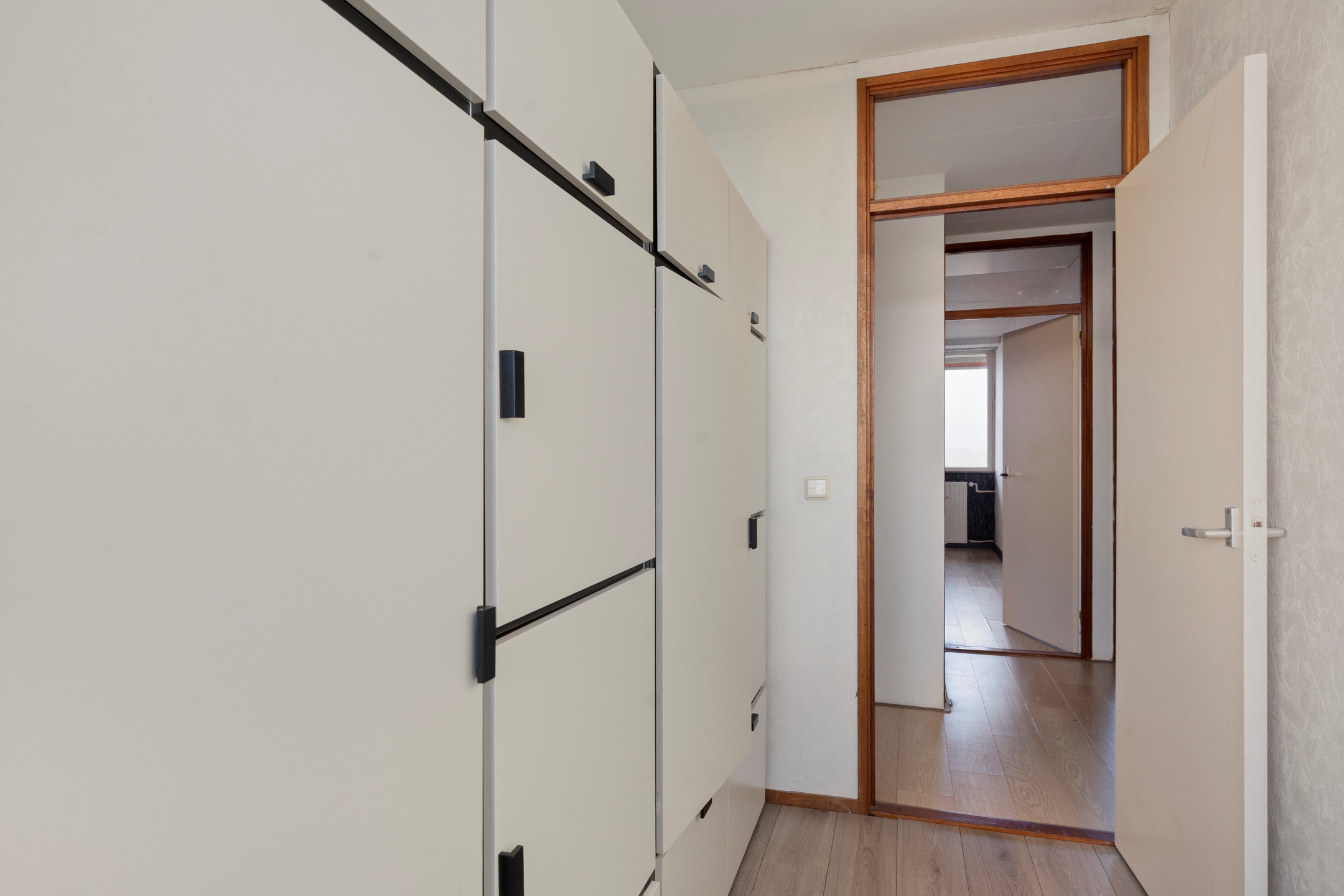 De woonkamer is royaal van opzet en dankzij de grote ramen bijzonder licht, met een prachtig uitzicht over het park en de omgeving. Vanuit de hal bereikt u tevens de keuken, die praktisch en efficiënt is ingericht, de drie slaapkamers, de fijne badkamer en het separaat toilet. Ook de bergingsruimte binnen de woning is vanuit de hal toegankelijk, wat extra gemak en opbergruimte biedt.