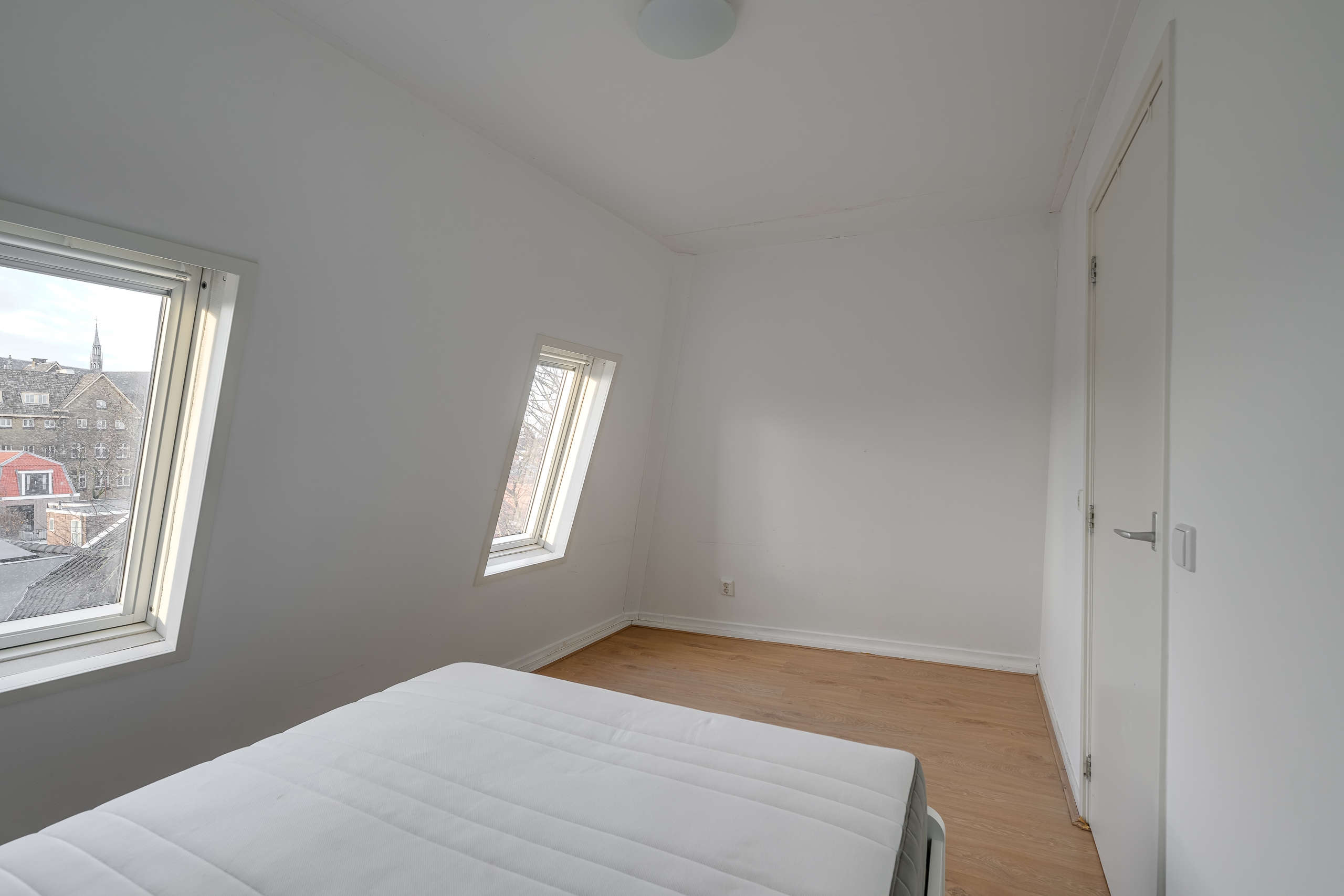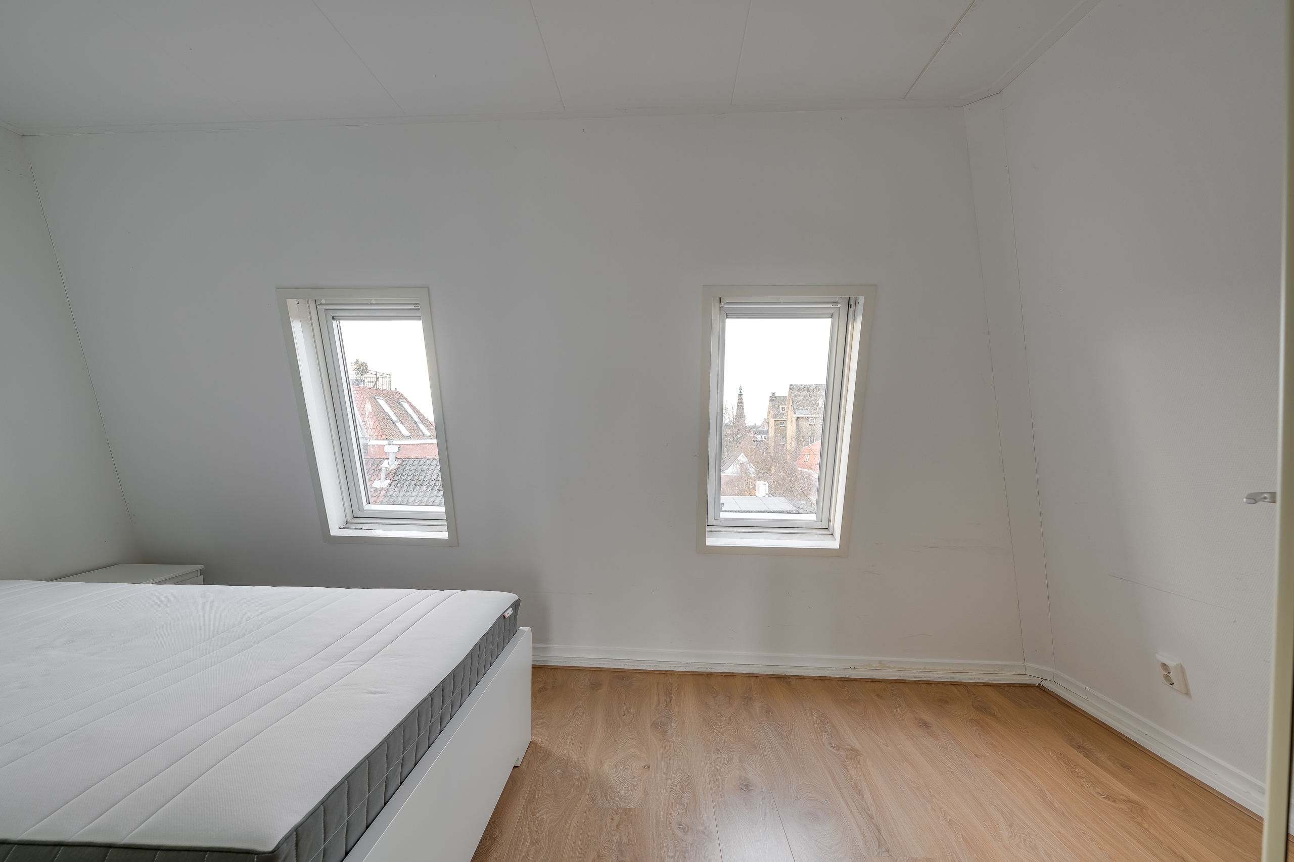 • Naastgelegen is de compacte slaapkamer, voorzien van drie ramen met uitzicht op de skyline van Leiden (o.a. Pieterskerk).