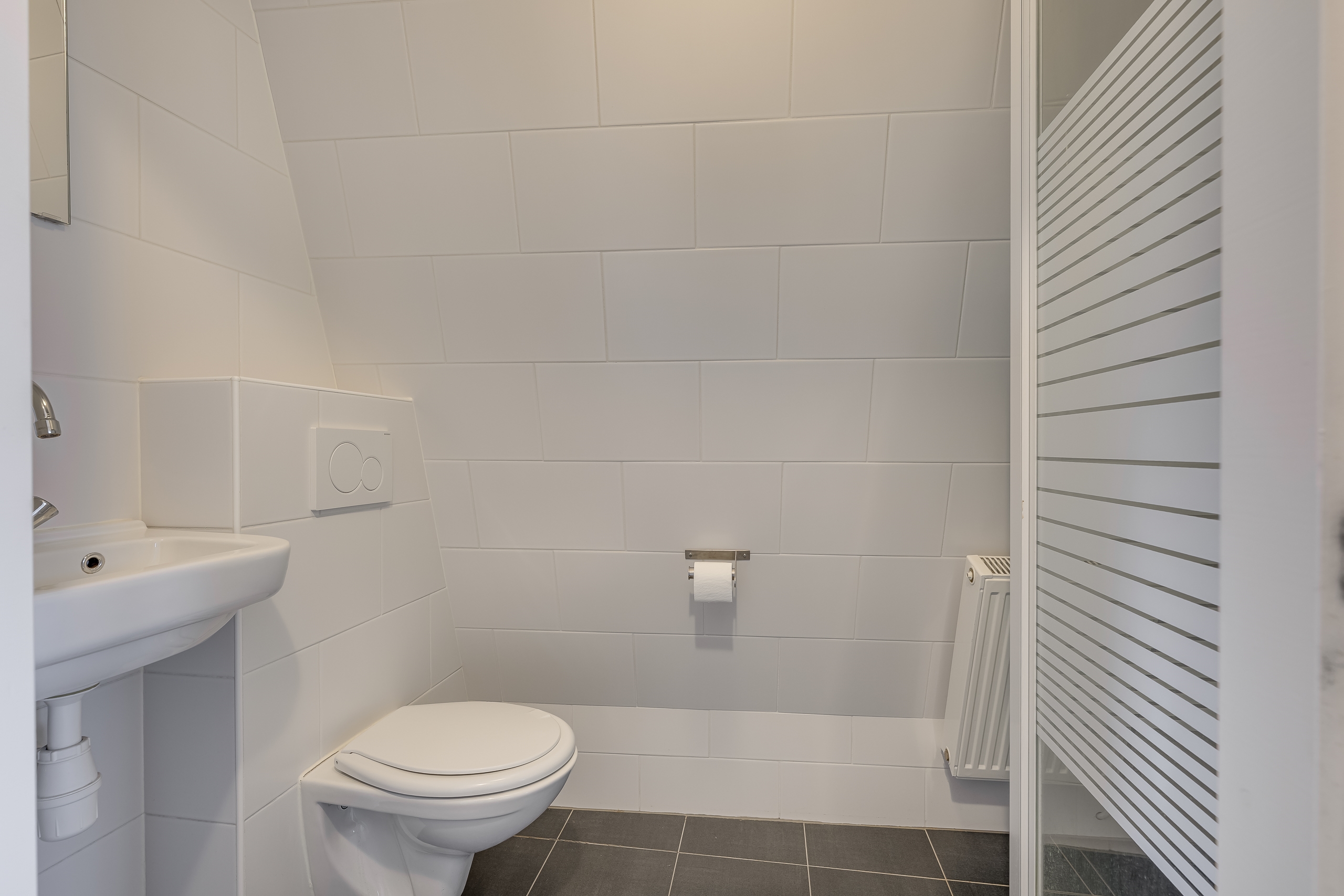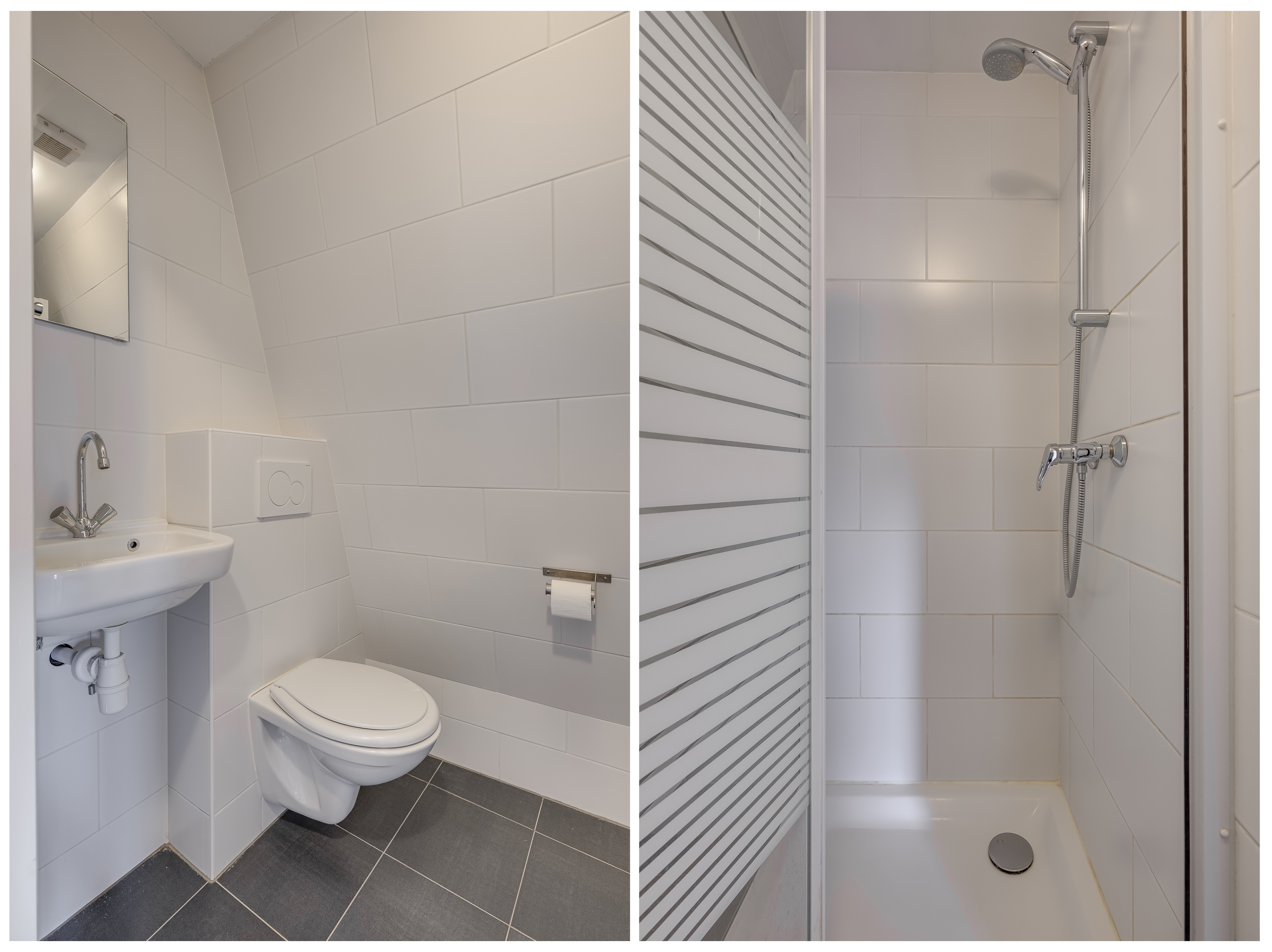 • De badkamer is modern en praktisch, met inloopdouche, wastafel en toilet.
