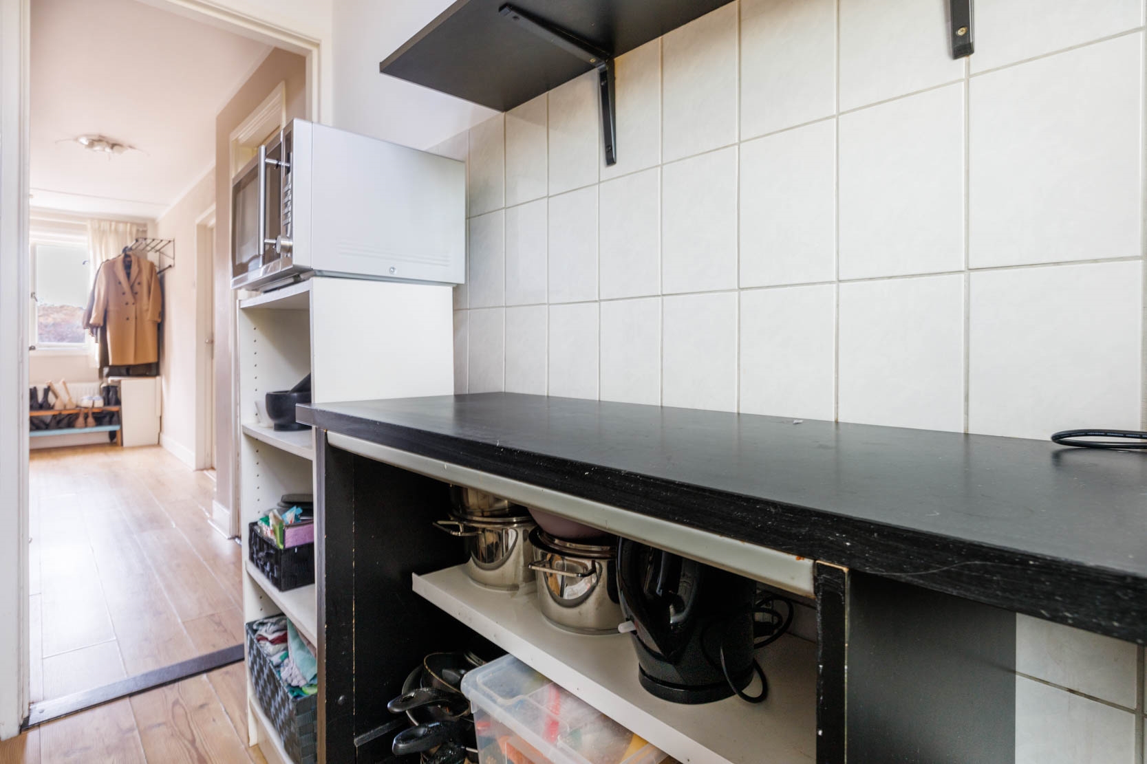 The separate kitchen is located at the rear and is equipped with various (built-in) appliances, including a 4-burner gas hob, dishwasher, and fridge-freezer. The balcony can also be accessed from the kitchen.