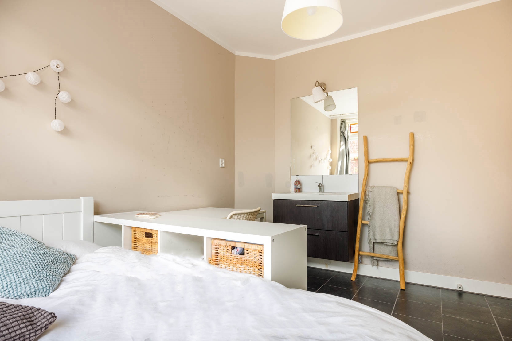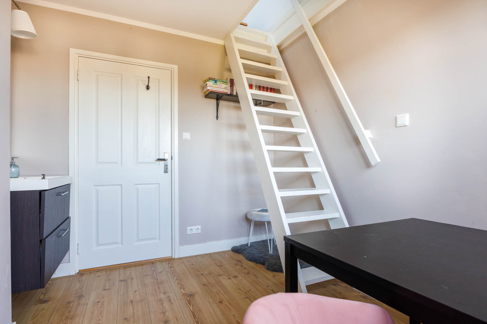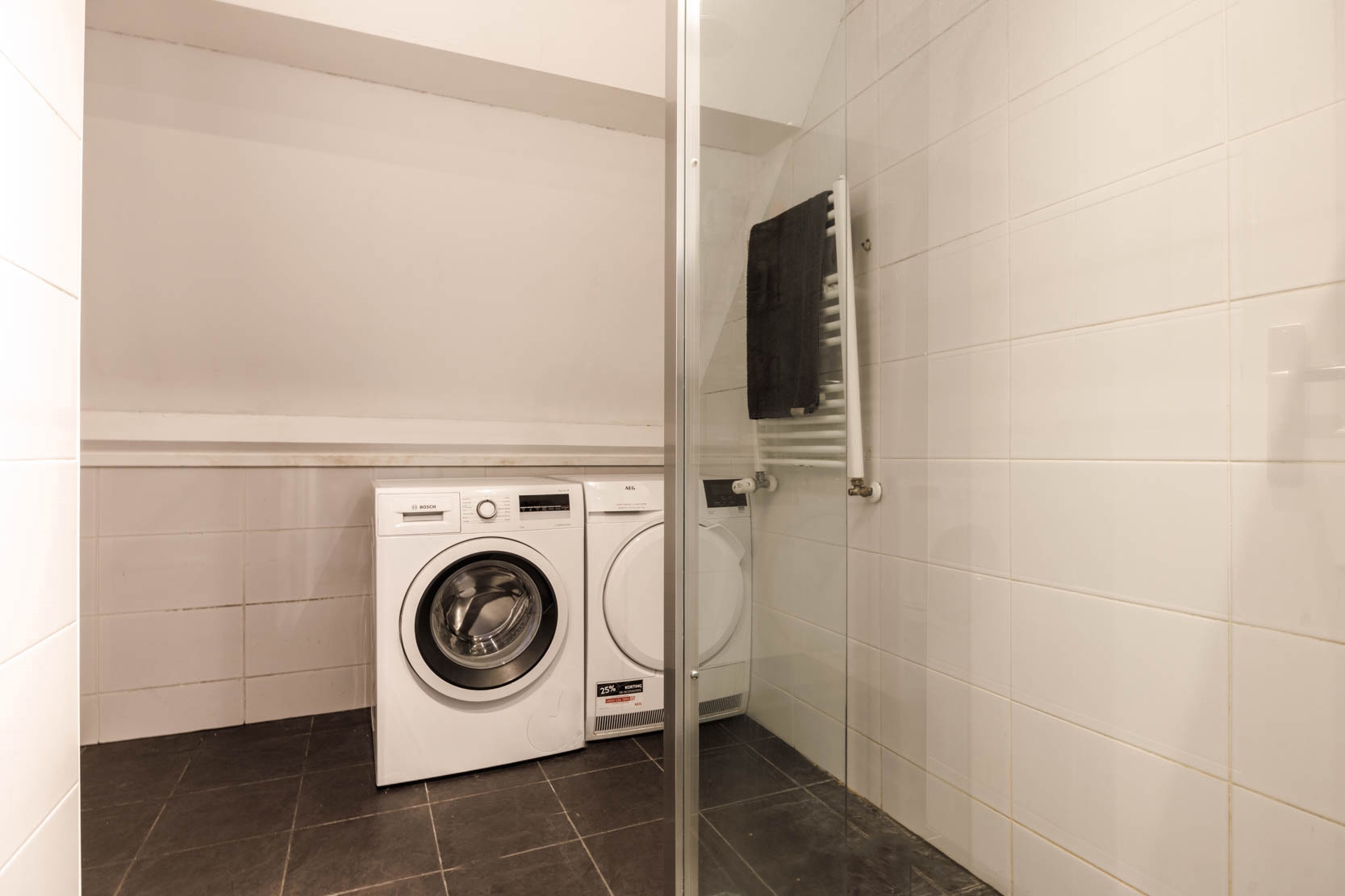 Long landing giving access to the three bedrooms and the bathroom. Two cosy bedrooms with a rear dormer, each with a washbasin unit with mirror, and stairs leading to a mezzanine with a window, currently used as a sleeping area. There is also a spacious and sunny bedroom at the front with a dormer and a washbasin unit with mirror. The generous bathroom features a walk-in shower with glass screen, a toilet, radiator, and mechanical ventilation. The washing machine and dryer connections are also located here.