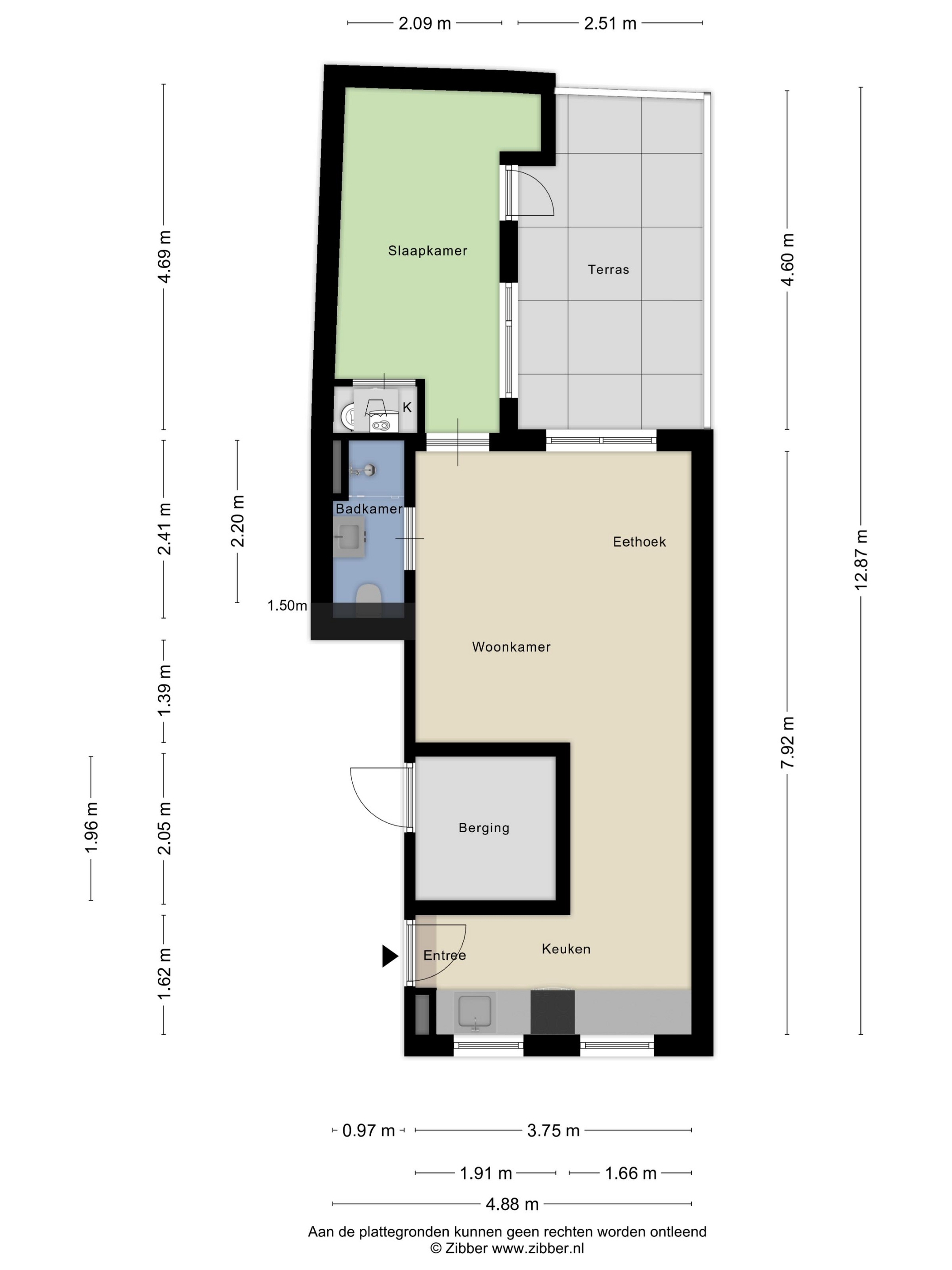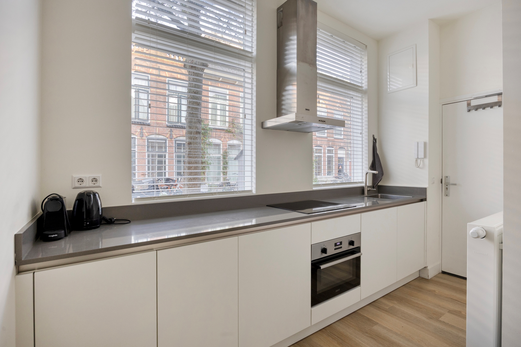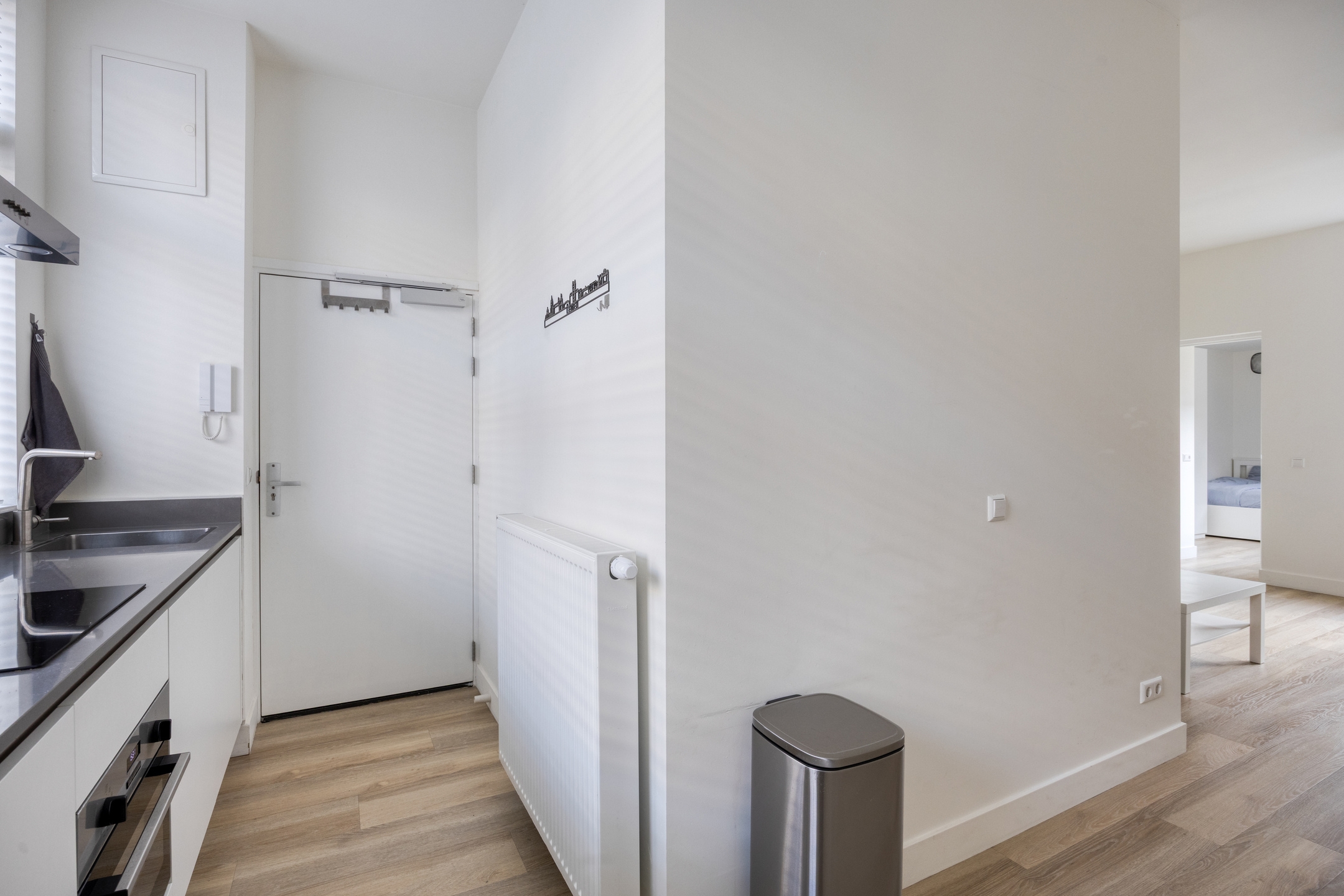 Via de gezamenlijke entree bereik je het appartement op de begane grond. Je komt binnen in de lichte keuken met grote raampartijen aan de voorzijde. De keuken is volledig uitgerust met onder andere een inductiekookplaat, combi-oven/magnetron, afzuigkap, vaatwasser, koelkast met vriesvak, koffiezetapparaat en waterkoker. Ook pannen, servies en bestek zijn aanwezig.